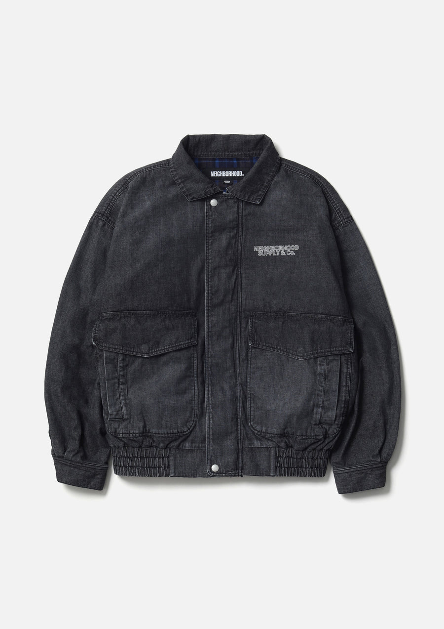 A denim blouson made from 10oz slub yarn denim fabric, featuring a fade treatment to replicate natural aging. The front closure uses original engraved snap buttons and a zipper. Includes flap pockets on both sides, accessible from both the top and the sides. The hem is elasticated with shirring. The left chest is embroidered with a logo. A brand tag is attached to the side seam.