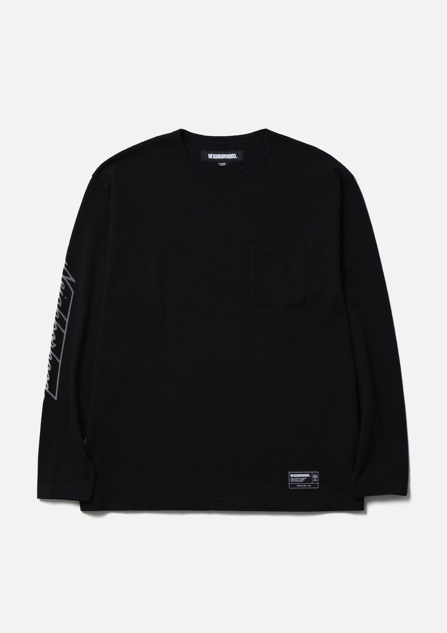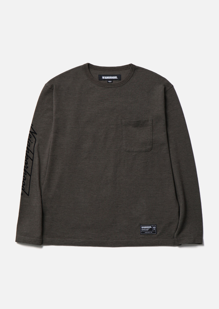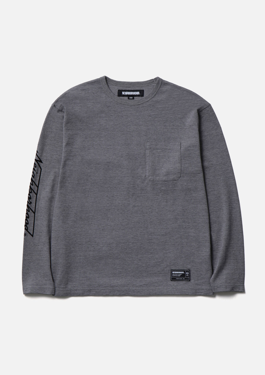 A crew neck cut-and-sew made of jersey fabric with a unique melange texture. Features a patch pocket on the left chest and a printed logo on the right sleeve. Includes a brand tag on the side seam.