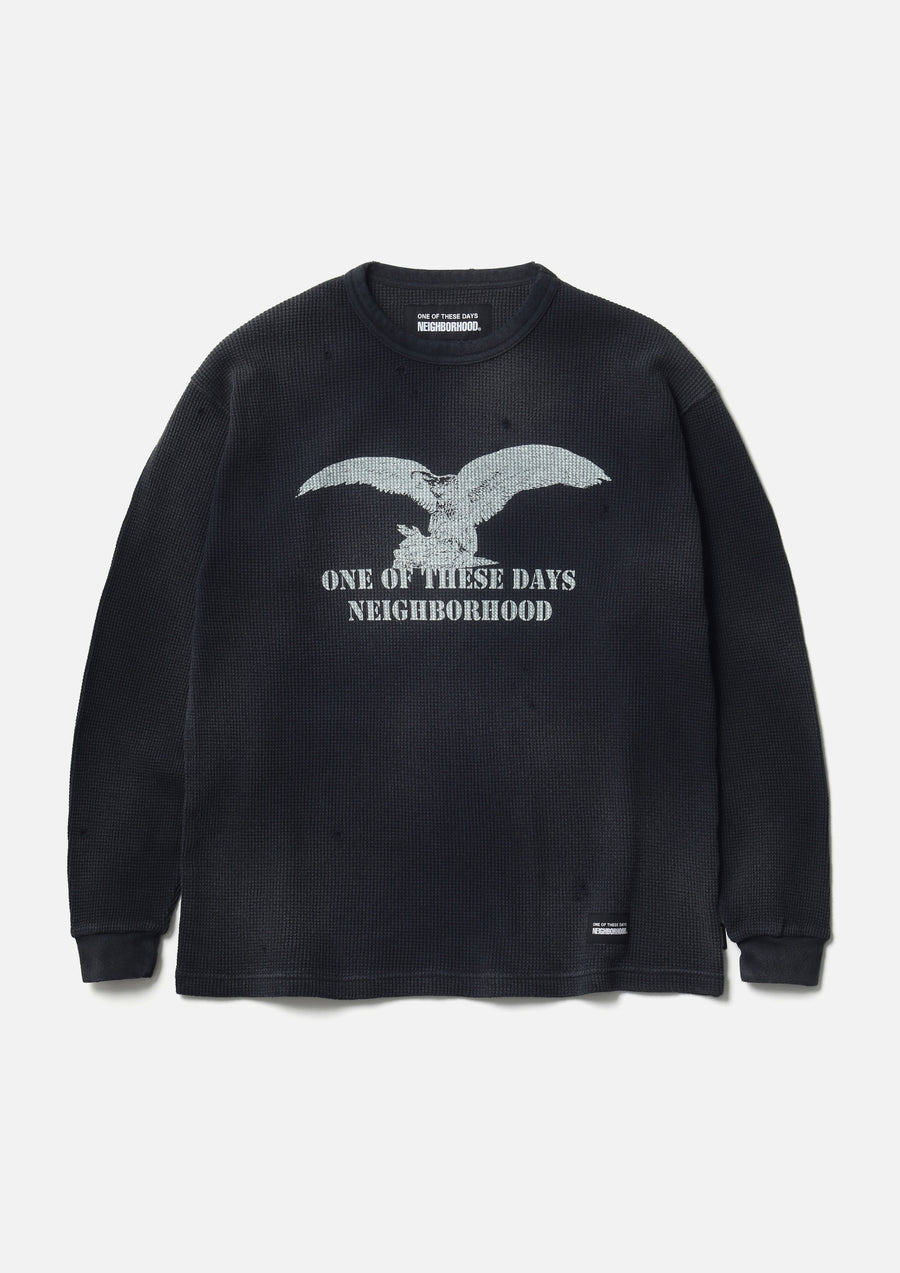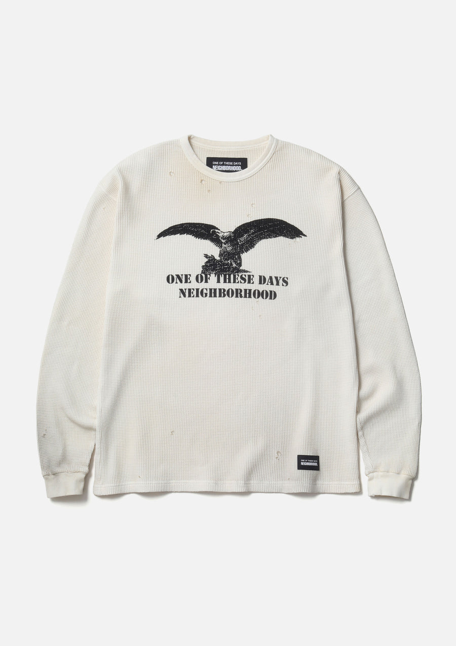 A thermal cut-and-sew shirt made from moderately thick waffle fabric with a savage finish. The aging effect is expressed through fading, distressing, and staining. The front features an eagle motif graphic print. Includes a collaboration brand tag on the left hem and a brand tag on side seam. A collaborative item with ONE OF THESE DAYS, led by Los Angeles based artist, Matt McCormick.