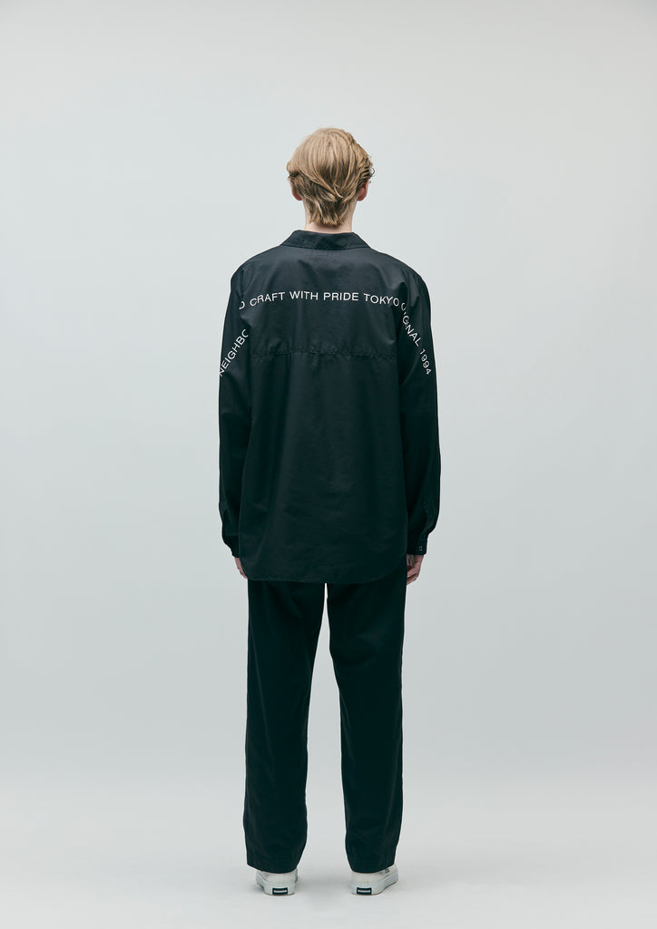 A pair of work pants made from katsuragi fabric woven with thick, strongly twisted yarn for enhanced durability. Features slash pockets on both sides. Equipped with original snap buttons and pocket lining fabric. Brand tags on the waist, above the hip pockets and on the side seam. Relaxed silhouette with center creases.