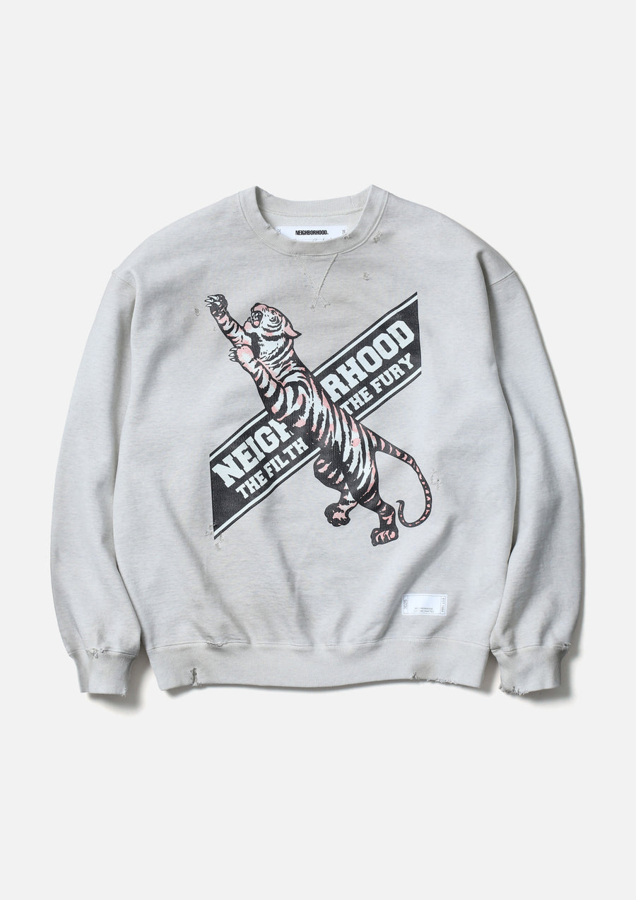 フェード感を出した度詰めの裏毛素材をベースに、サベージ加工を施したクルーネックプルオーバー。色落ち、ペンキドリップ、汚し、ダメージなどの複合加工を用いてリアルなエイジングを表現。 フロントにタイガーモチーフのグラフィックをプリント。サイドシームにピスネームを付属。