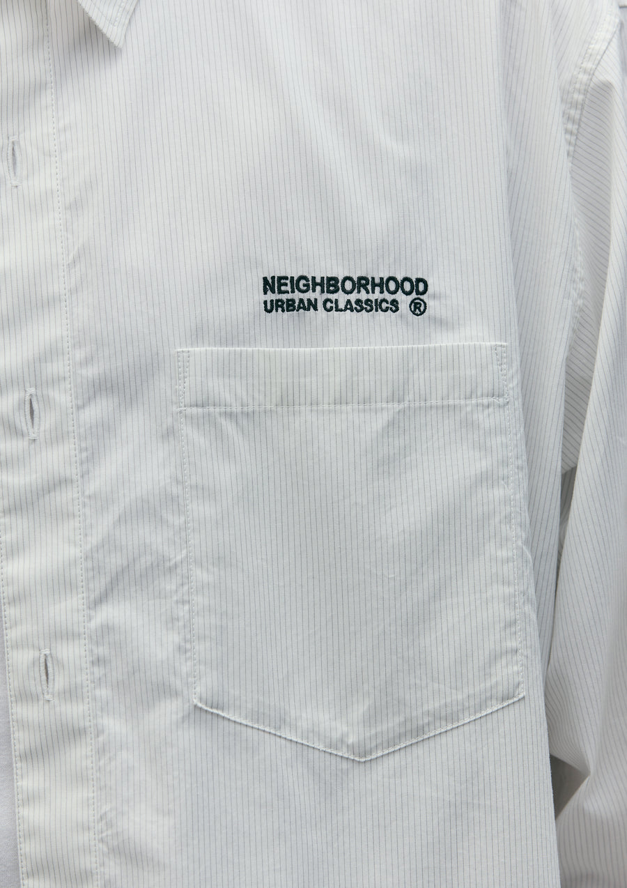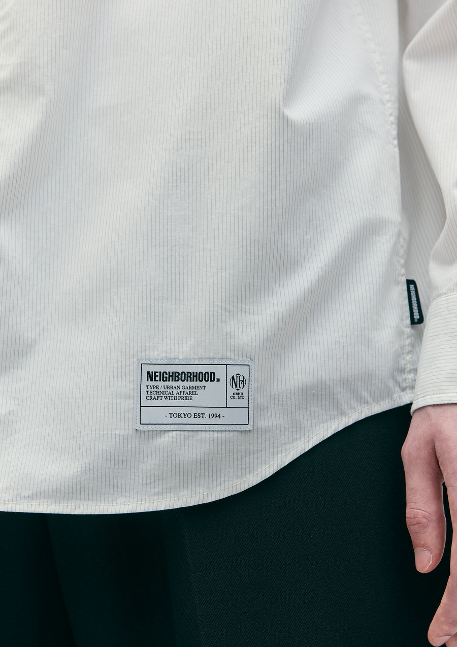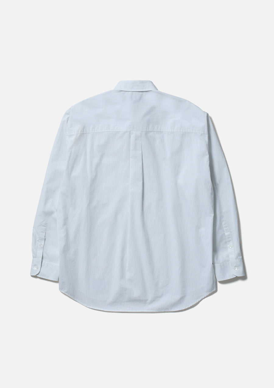 ハリとしなやかさを兼ね備えるポプリン素材を使用したストライプシャツ。左胸にロゴを刺繍。オリジナルの貝調ボタンを採用し、左裾にネームタグ、サイドシームにピスネームを付属。ワンウォッシュ。