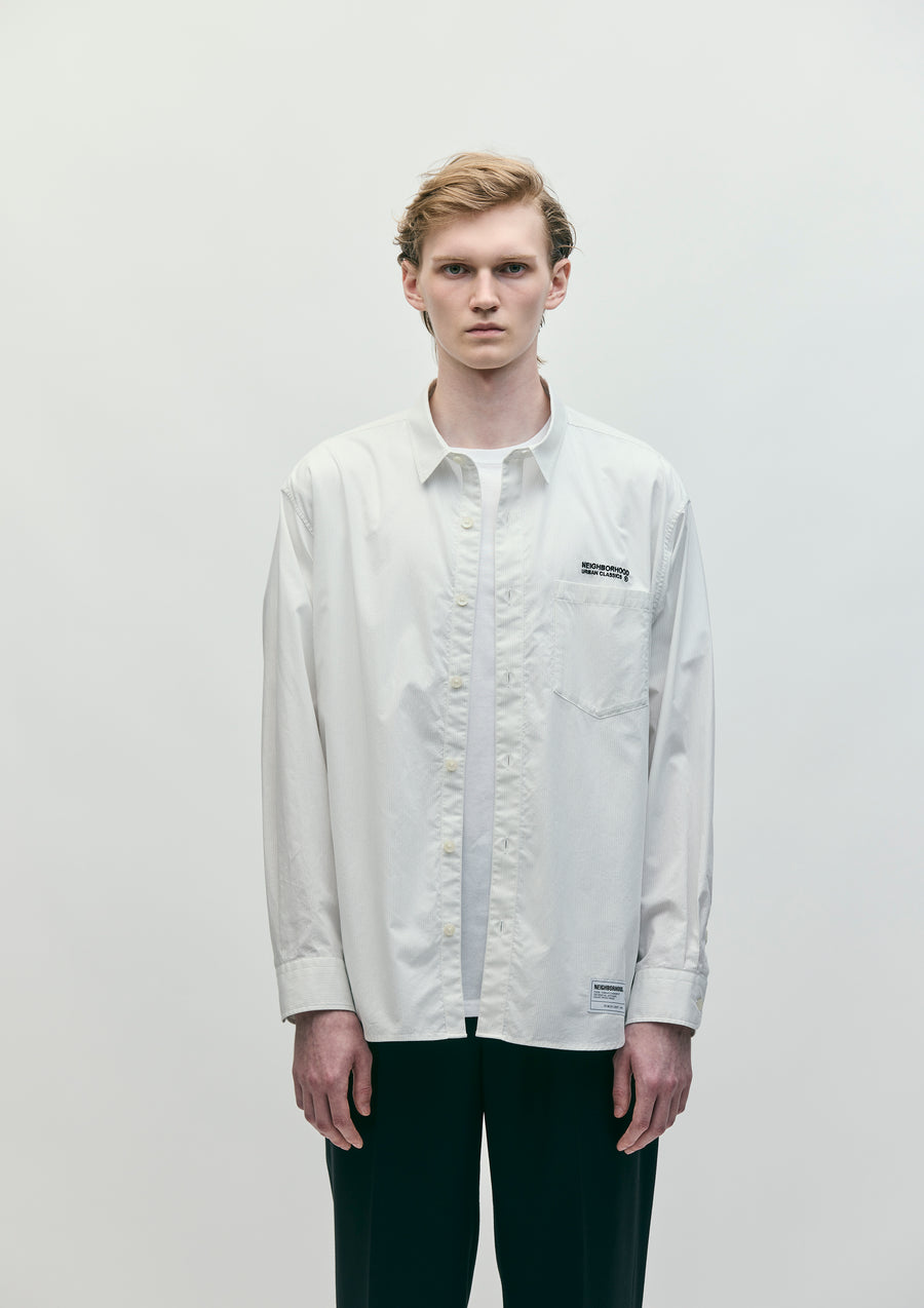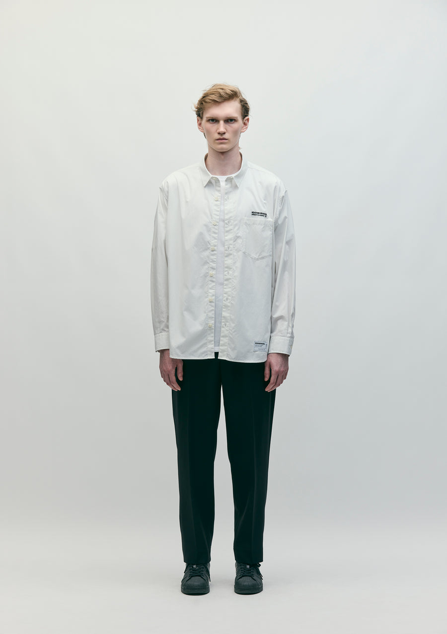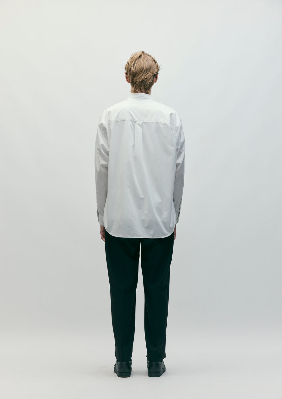 ハリとしなやかさを兼ね備えるポプリン素材を使用したストライプシャツ。左胸にロゴを刺繍。オリジナルの貝調ボタンを採用し、左裾にネームタグ、サイドシームにピスネームを付属。ワンウォッシュ。