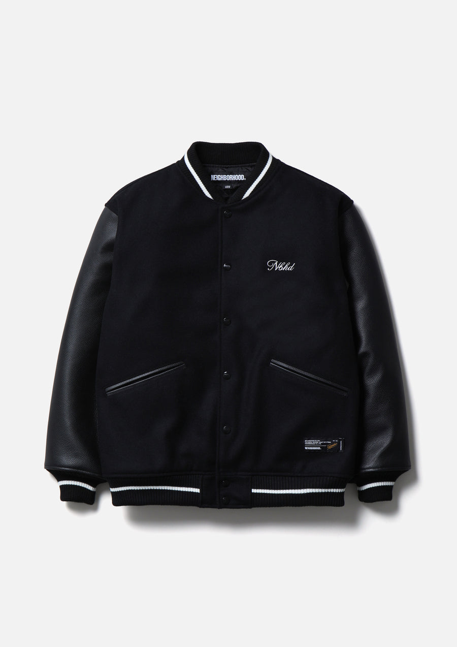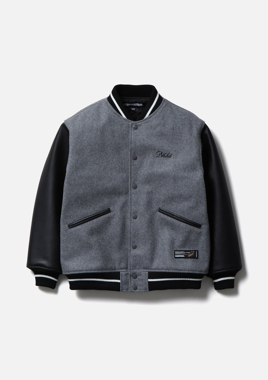 ハリコシのある肉厚なヘヴィメルトン素材とカウレザーをコンビネーションで使用したスタジアムジャケット。左胸と背面にロゴを刺繍。ジャカードロゴ入りの裏地を採用したキルティング仕様。オリジナルのスナップボタン、左裾にネームタグ、サイドシームにピスネームを付属。
