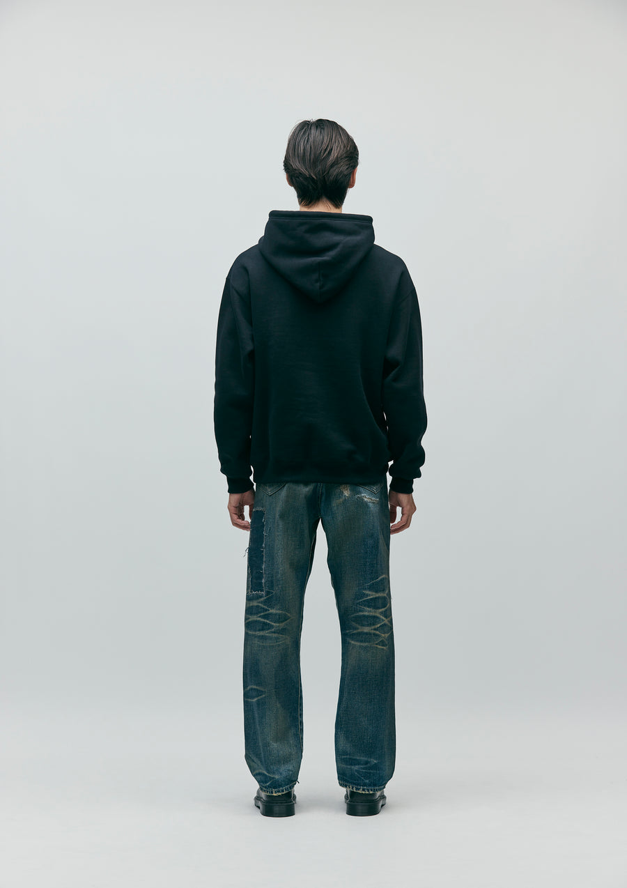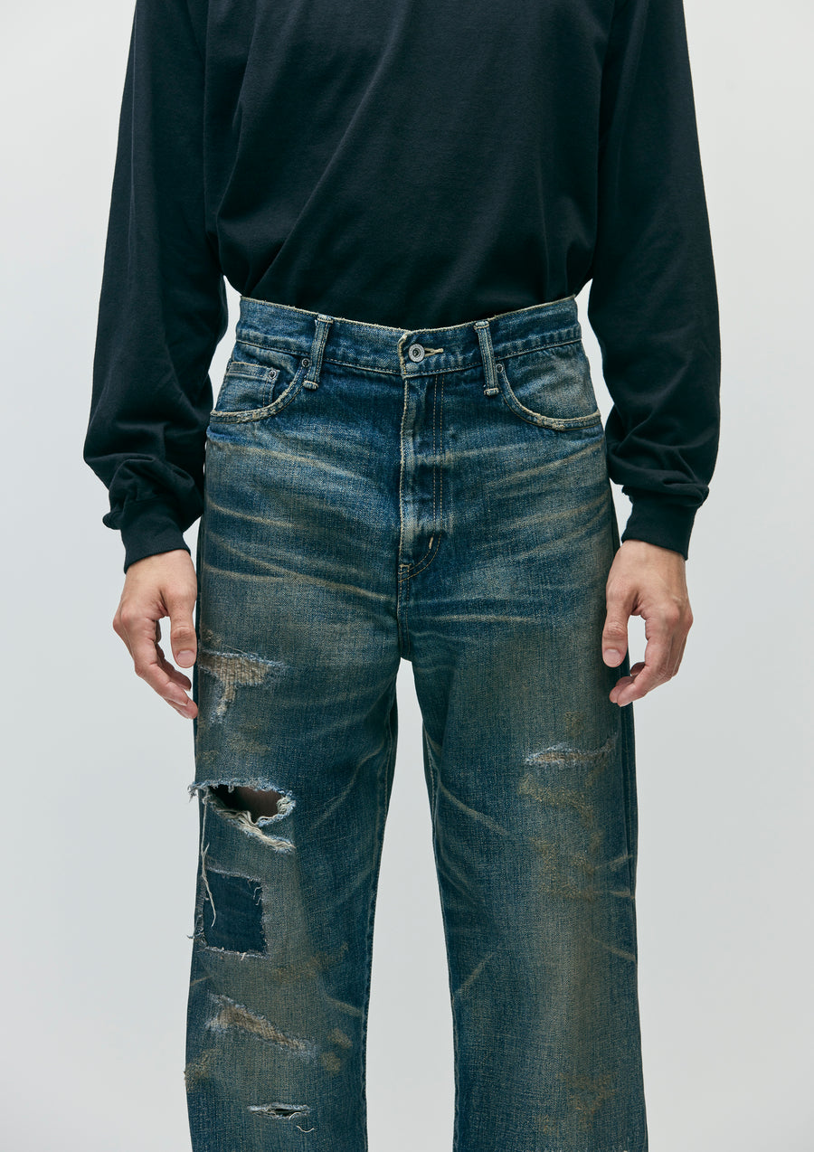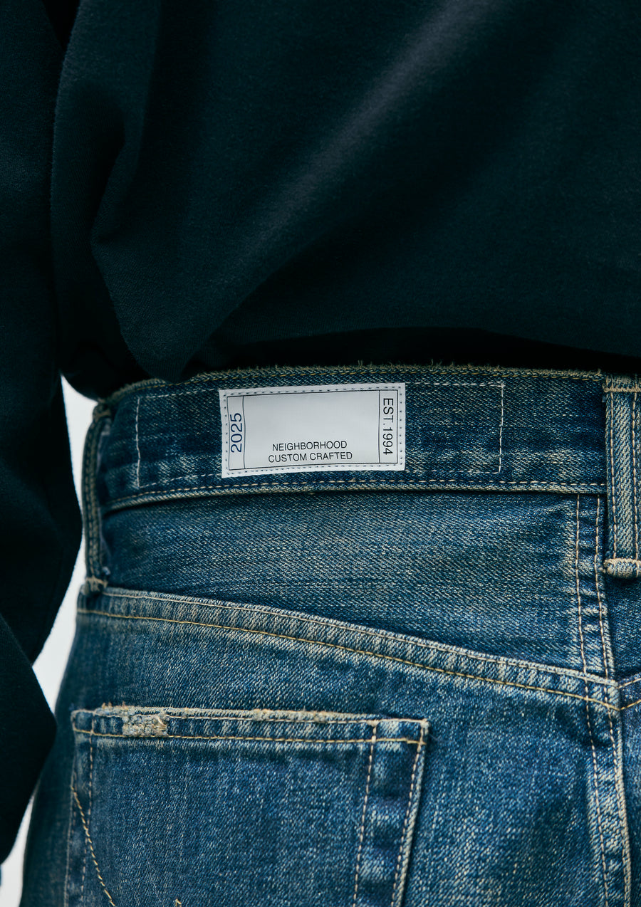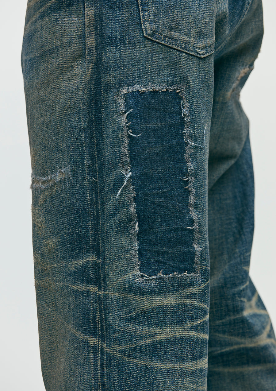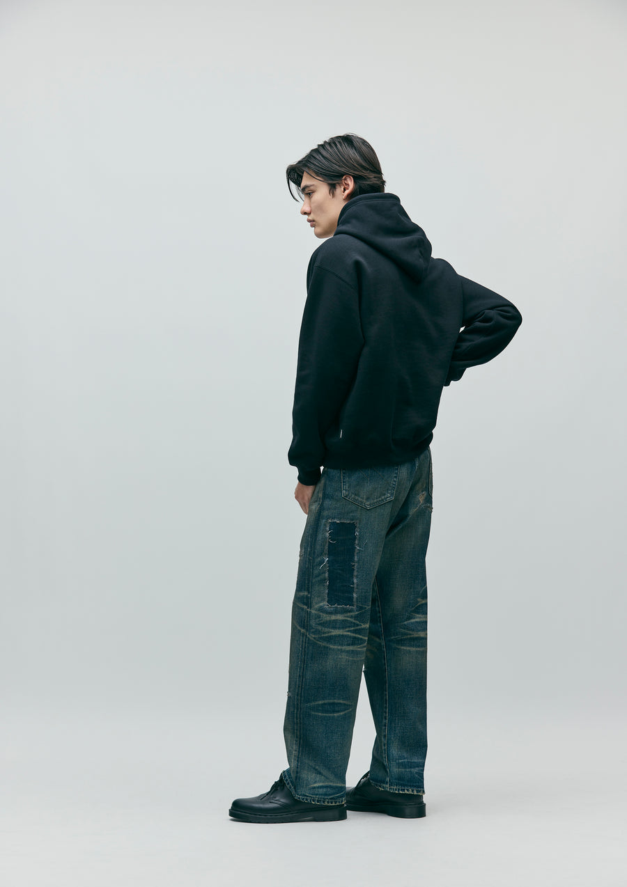 生地からボタン、リベットといったパーツまで、すべてオリジナルで製作した12ozセルヴィッジデニムをベースに、複数のエイジング加工を施したサベージデニムパンツ。ハードな色落ちや裏当てへのウォッシュド加工、ランダムピッチのリメイク技法など、生地の脆化をイメージしたリアルなエイジングが特徴。カスタムクラフテッドアイテム専用のサイズネームを配置。DP WIDEとDP MIDの中間にあたる加工表現を施したDP BASICシルエット(ワタリ、ヒップ、裾幅にゆとりを持たせつつ裾にかけてややテーパードさせた定番のベーシックシルエット)。