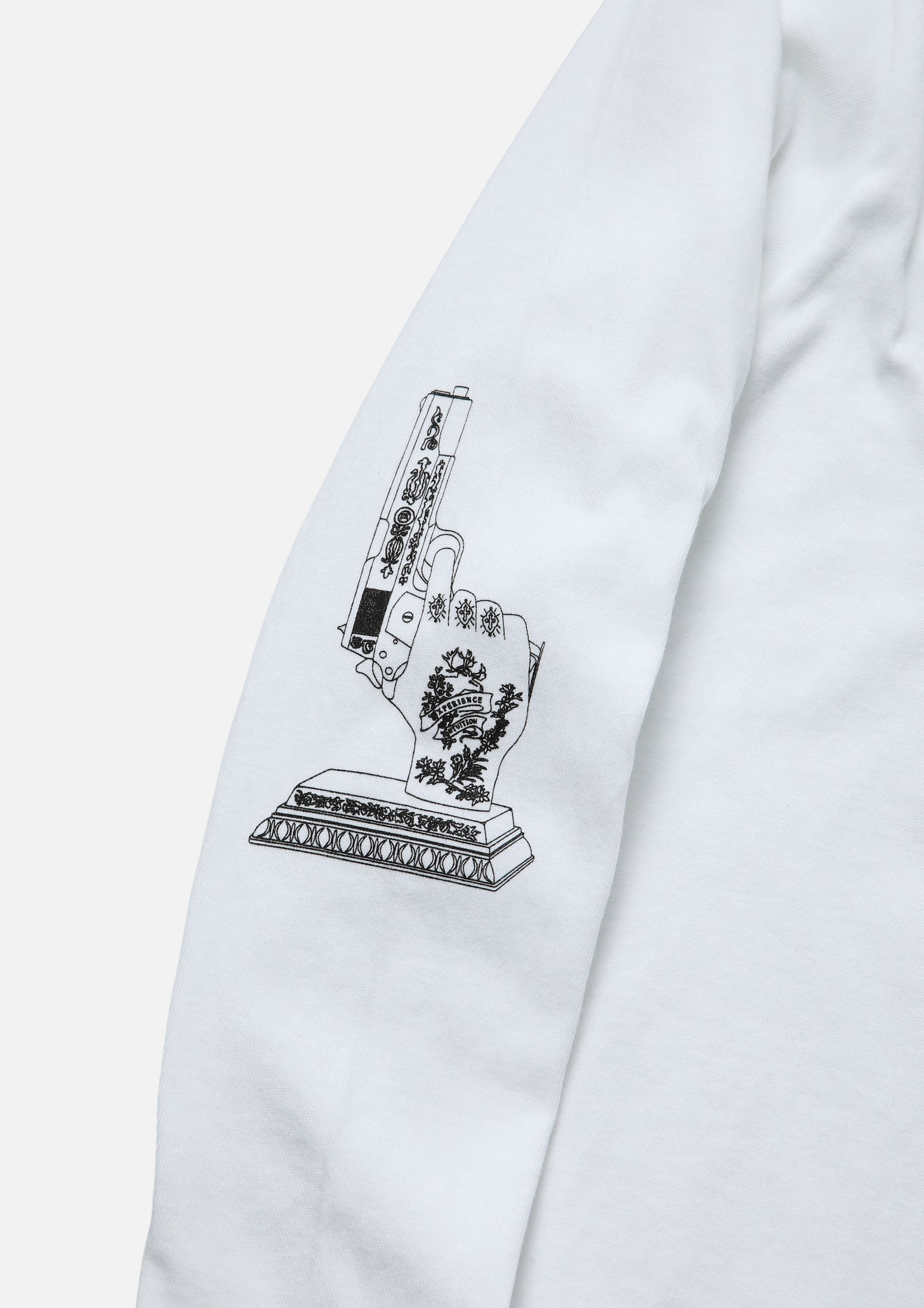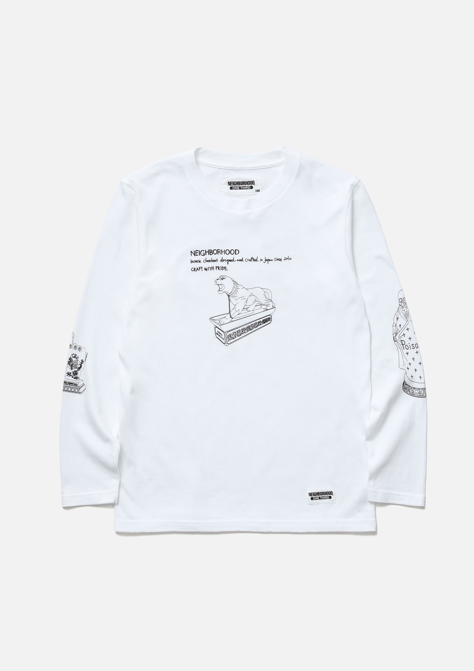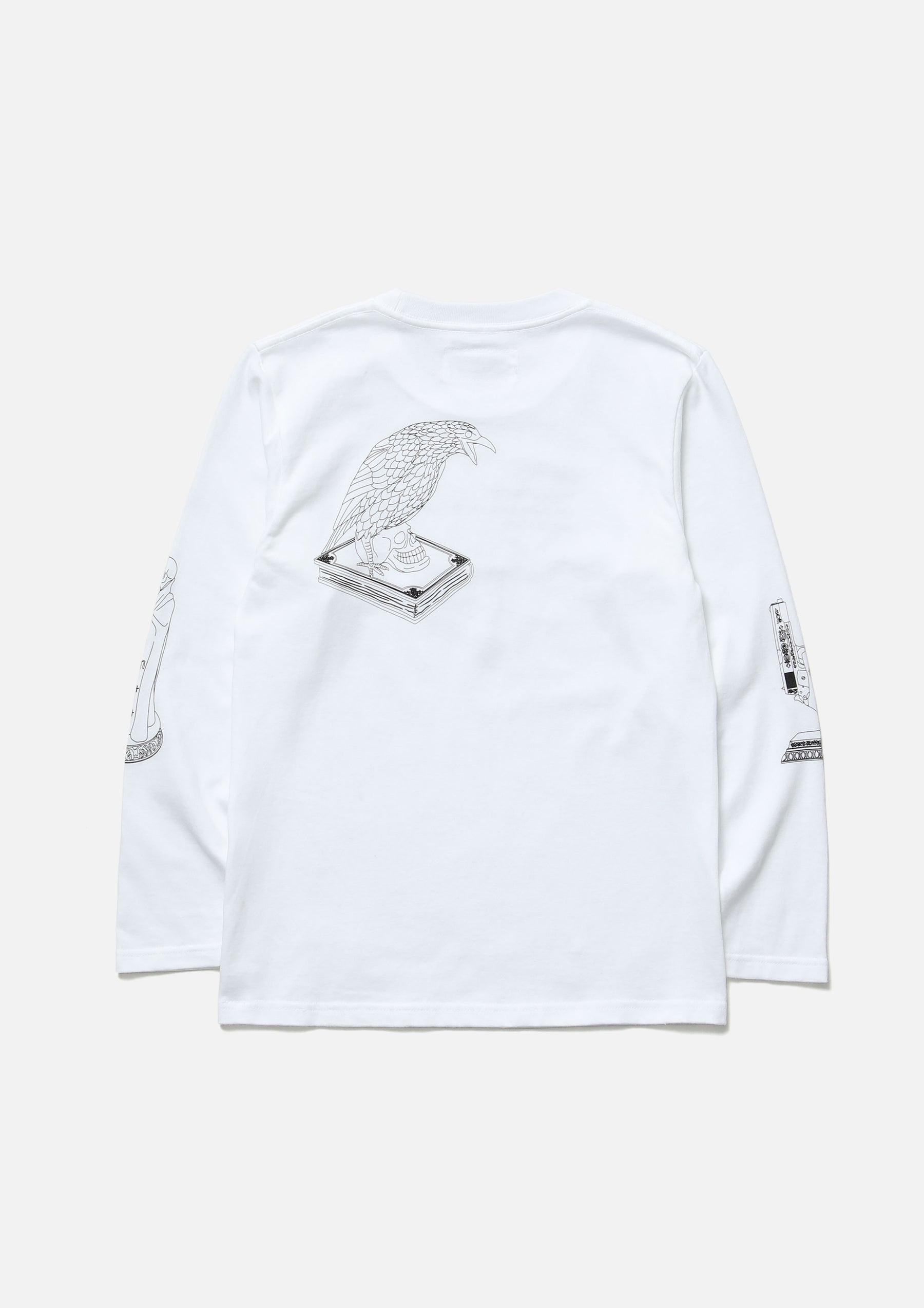5.6ozのヘビーウェイトボディーを使用したロングスリーブTシャツ。インセンスチャンバーモチーフのグラフィックをプリント。左裾にブランドタグを配置。