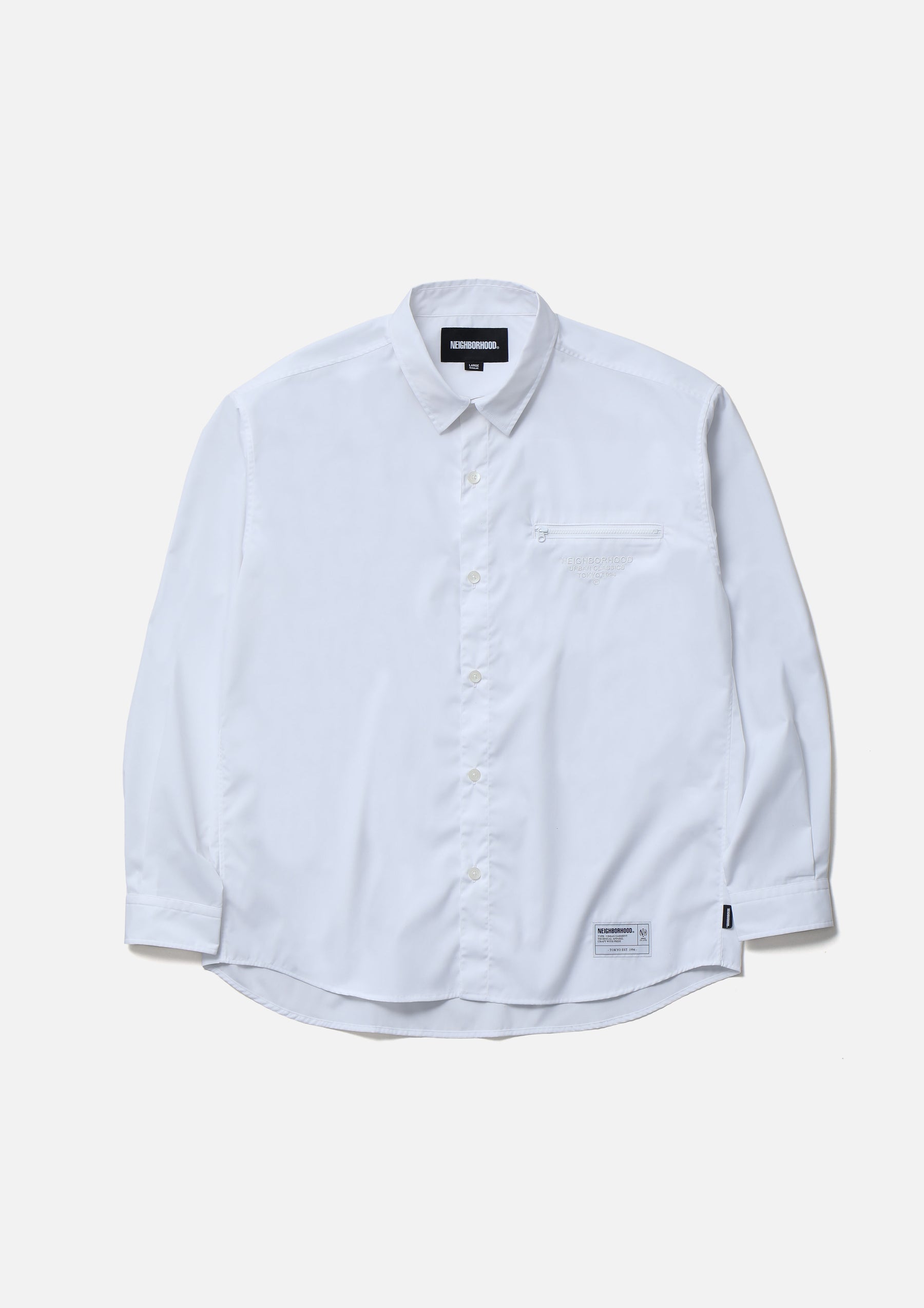 防シワ・接触冷感性・紫外線防止機能を備えたプレーンシャツ。後染め混紡糸を使用し、防シワ加工を施した機能素材。左胸にジップポケットとロゴプリントを配置。オリジナルボタンを採用。左裾と下前立て裏にブランドタグ、脇接ぎにピスネームを付属。プレーンなシャツをベースに、着丈を短めに調整したボックスシルエット。