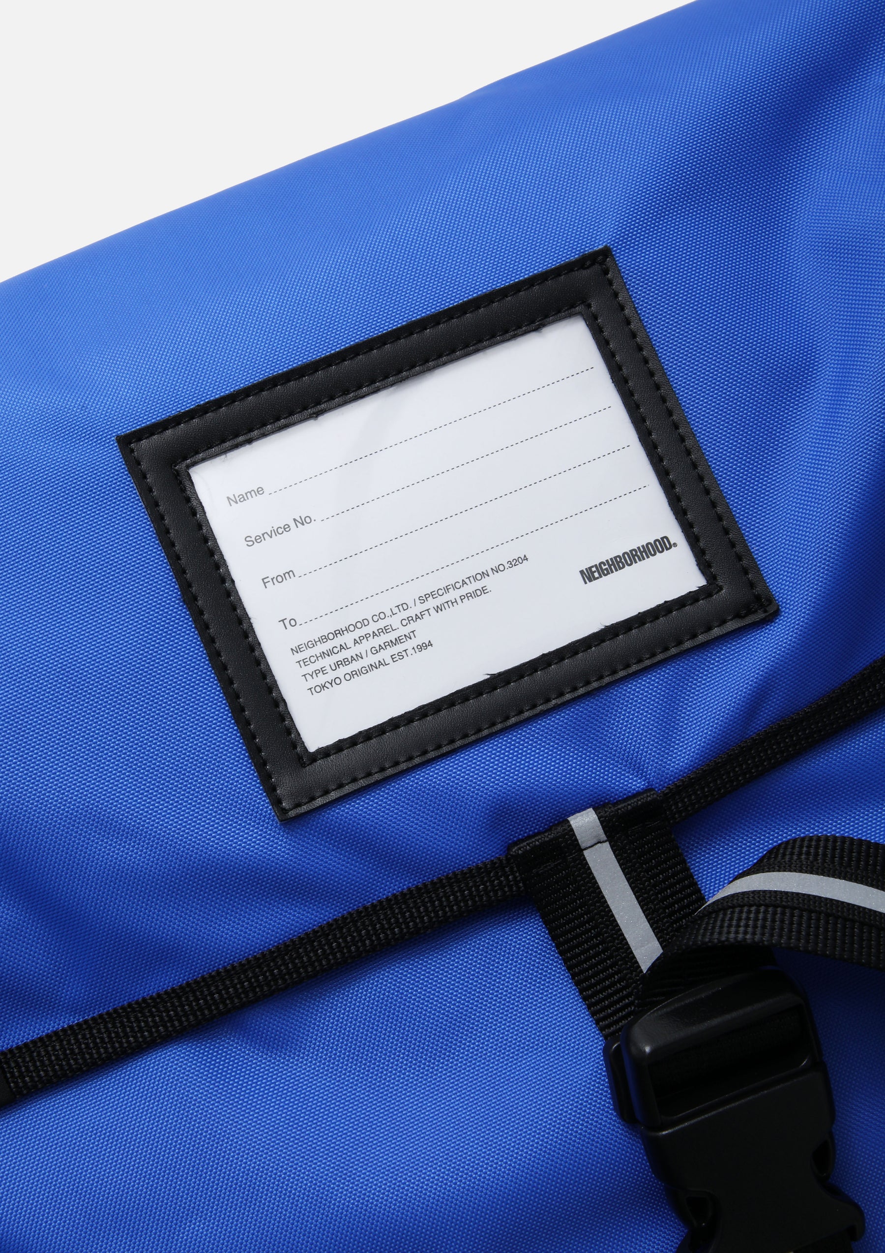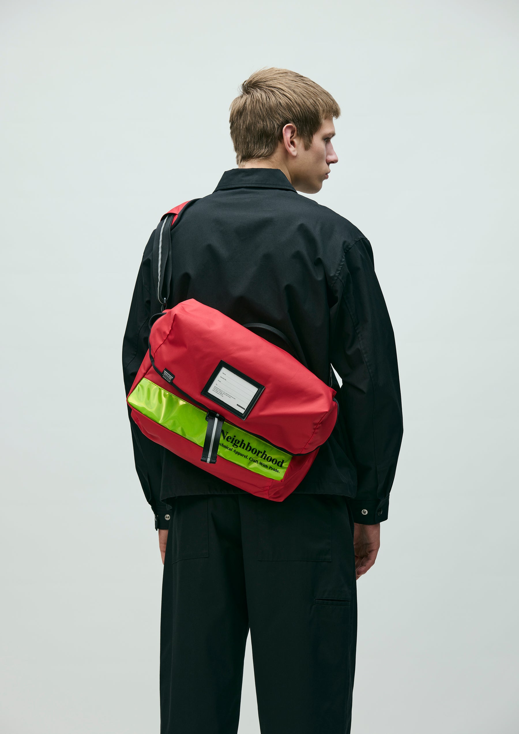テフロン加工を施した耐久性に優れ撥水効果のあるナイロンオックス素材のメッセンジャーバッグ。実際の郵便配達員のバッグがモチーフ。フロントにIDカードホルダーを備え、肩への負担を軽減する厚手パッド付きショルダーストラップを採用。濡れても反射性を維持可能なリフレクターテープ部分にロゴプリントを配置。収納力と耐久性を兼ね備えた仕様は、自転車での移動から日常使いまで幅広いシーンに対応。