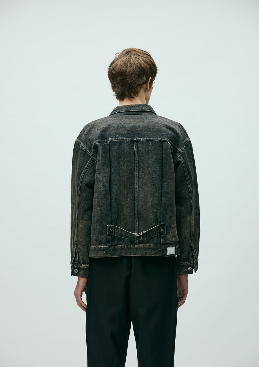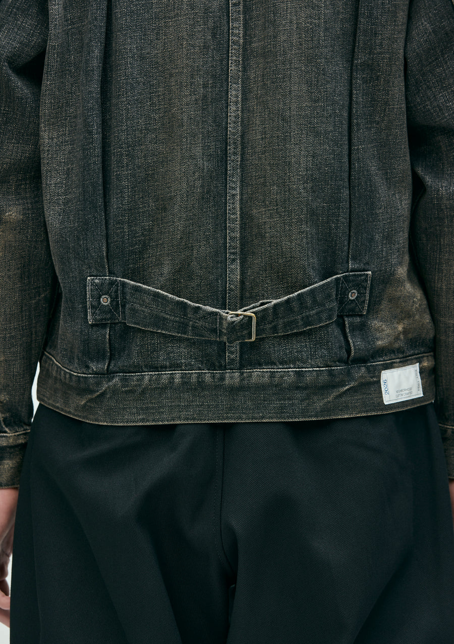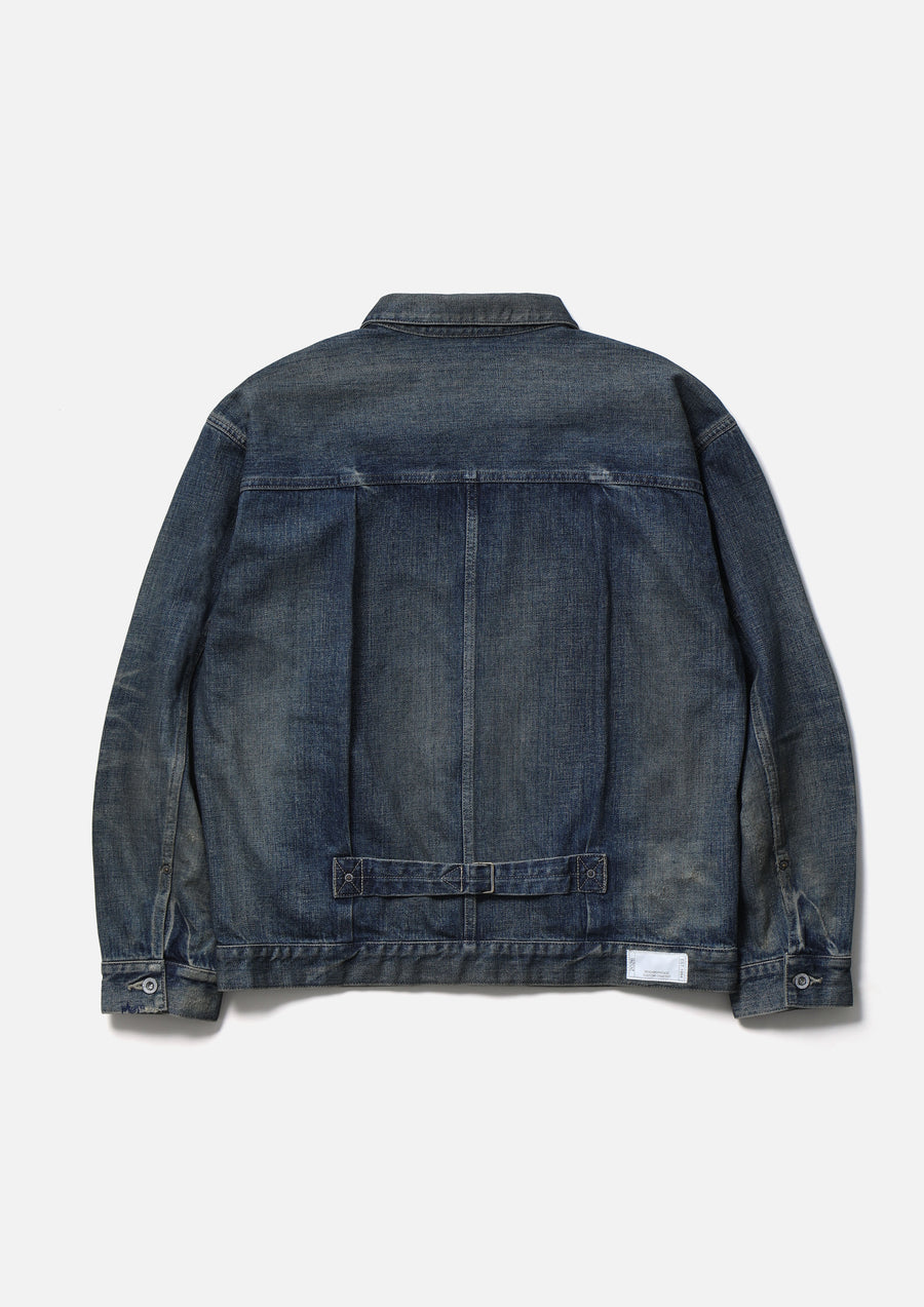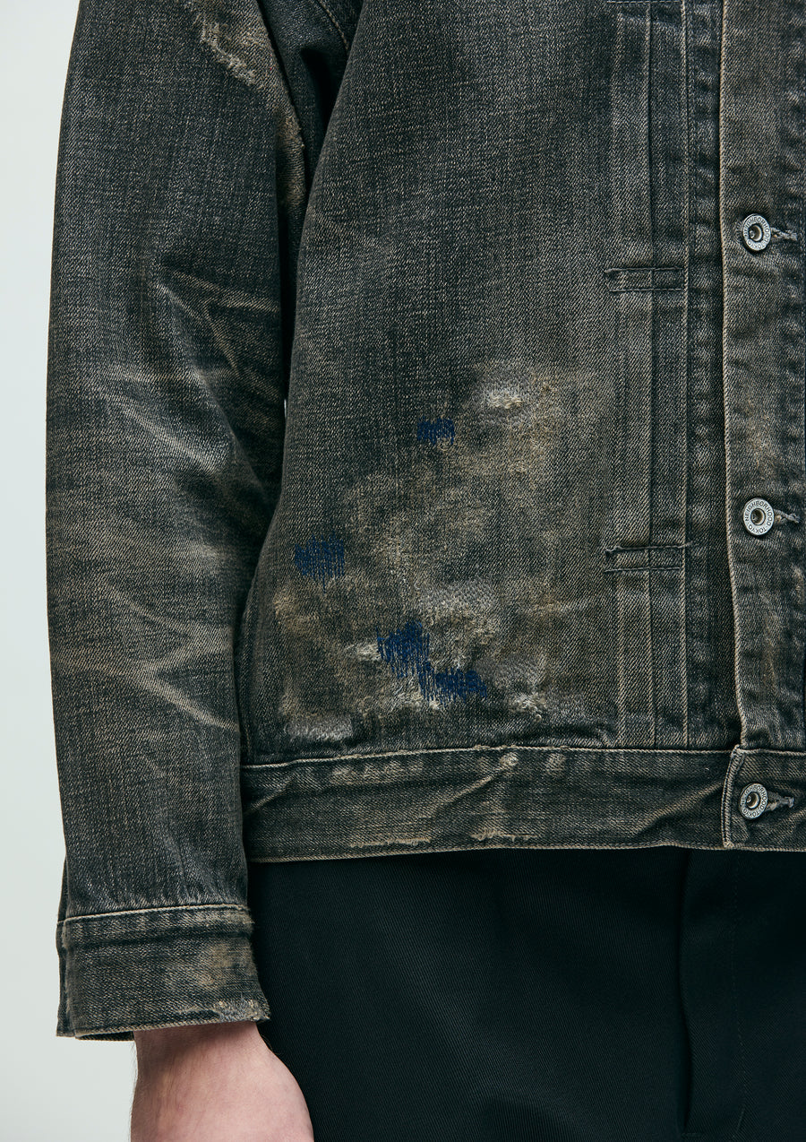 オリジナルの12ozデニム生地にサベージ加工を施した1stタイプのサベージデニムジャケット。ダメージ加工やリメイク加工、ハードな色落ちを用いて、生地の脆化を表現したリアルなエイジングが特徴。胸ポケット口にホワイトハーツビーズとハンド刺繍を用いた装飾ディテールと配色のパイピングテープを配置。オリジナルのタックボタンとリベットを採用。カスタムクラフテッドアイテム専用のサイズネーム、脇接ぎにピスネームを付属。