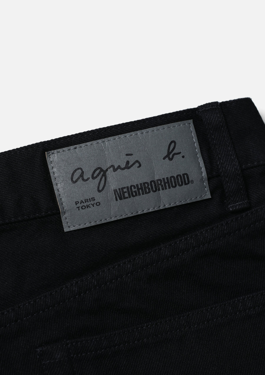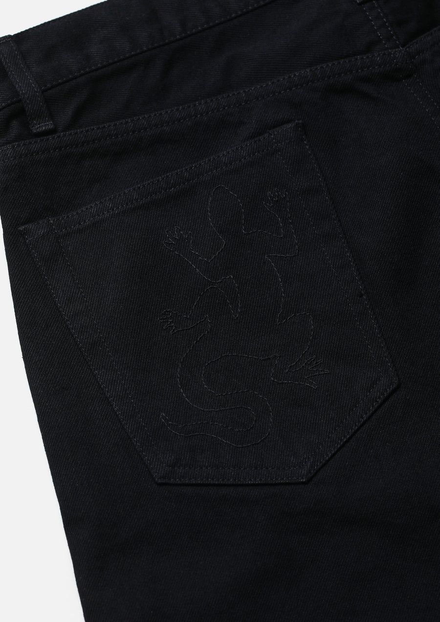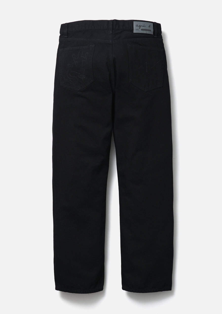 丈夫なコットン素材でタフに仕上げたストレートシルエットの5ポケットパンツ。ポケット口にAgnès Troublé直筆の両ブランドのロゴを刺繍。バックポケットには、アイコンであるNとレザール(トカゲ)モチーフのデザインステッチを配置。オリジナルのタックボタン、紙パッチを採用。agnès b.とのコラボレーション。