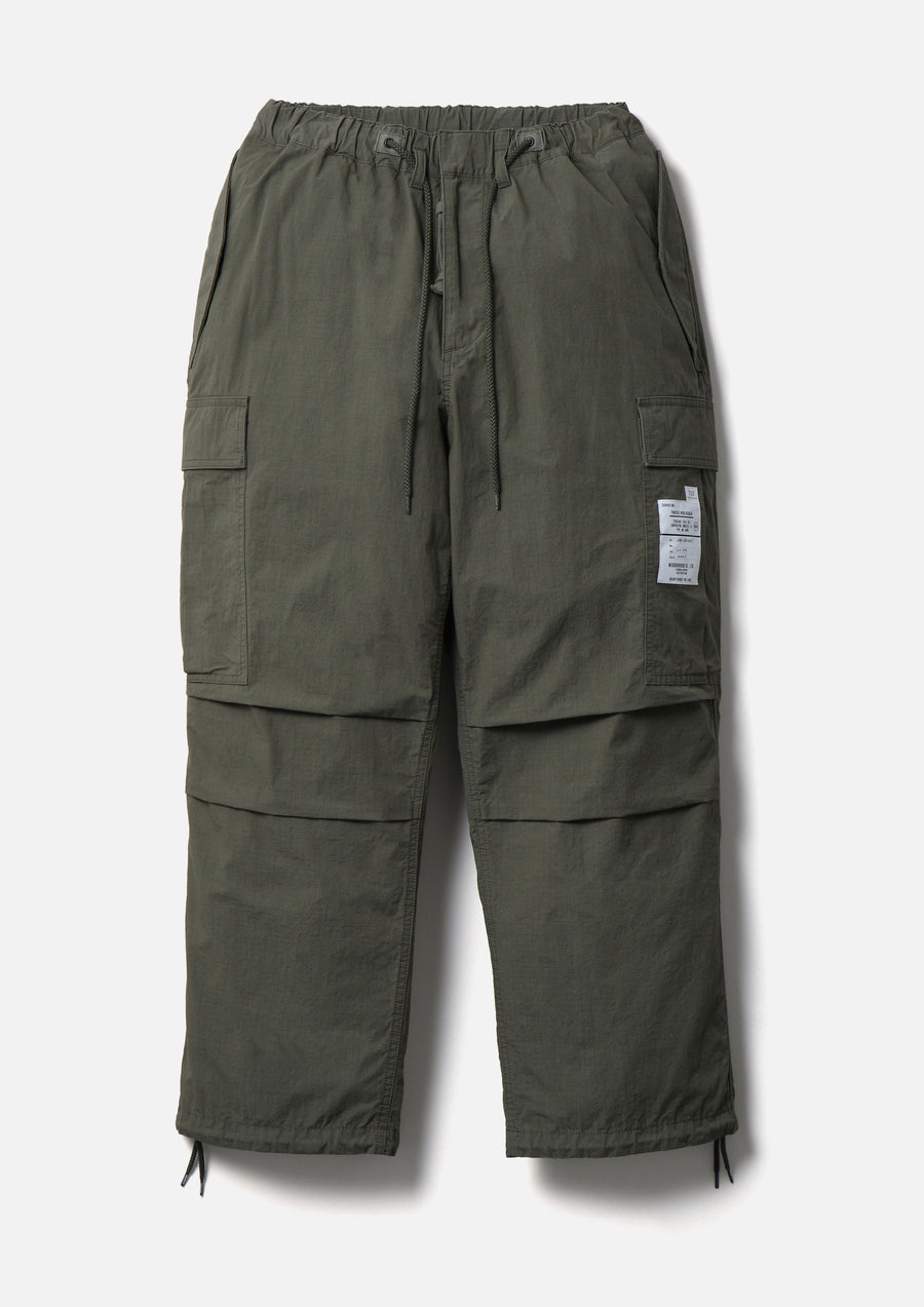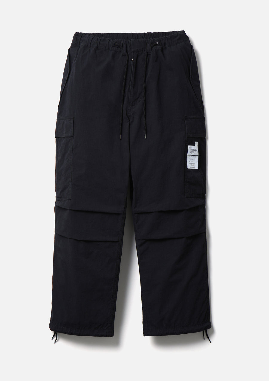 綿ナイロンの高密度リップストップ生地にワッシャー加工を施し、ナチュラルな風合いを表現したワイドカーゴパンツ。ゴム入りウエストにスピンドルを内蔵したイージータイプ。フラップ付きカーゴポケットとヒップポケットは、隠しスナップ仕様。裾に調節用のスピンドルを内蔵し、オリジナルのフロントファスナー、シグネチャーテープを採用。ポケット脇にピスネームを付属。膝元にタックを施したゆとりのあるシルエット。