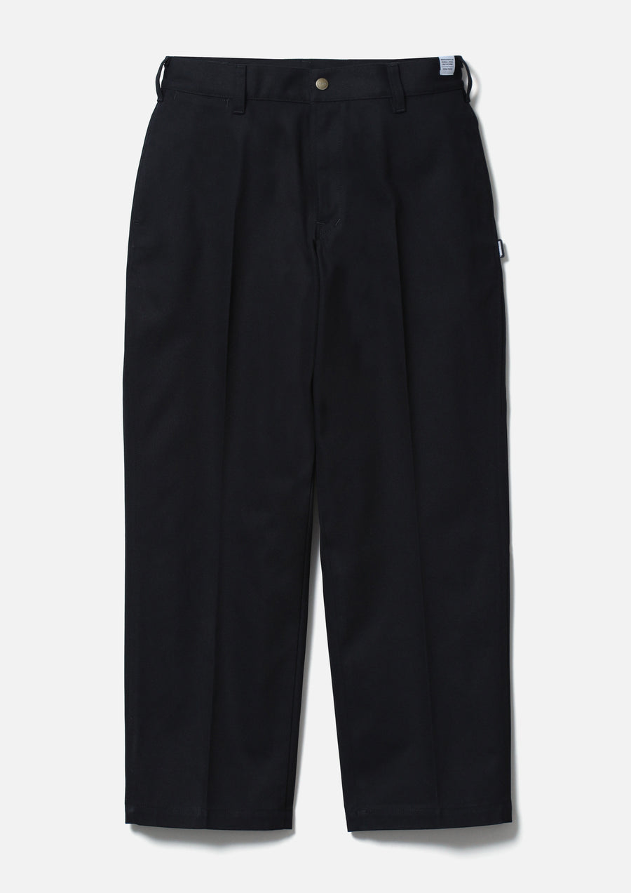 太番手の強撚糸を使用したカツラギ生地のワークパンツ。両サイドにスラッシュポケットを配置。オリジナルのスナップボタン、スレキ生地を採用。ウエストとヒップポケット上部にネームタグ、サイドシームにピスネームを付属。センタープレスを入れたゆとりのあるシルエット。