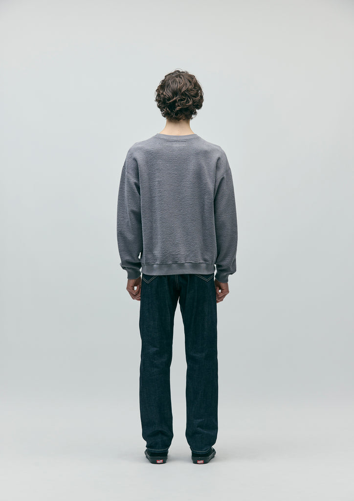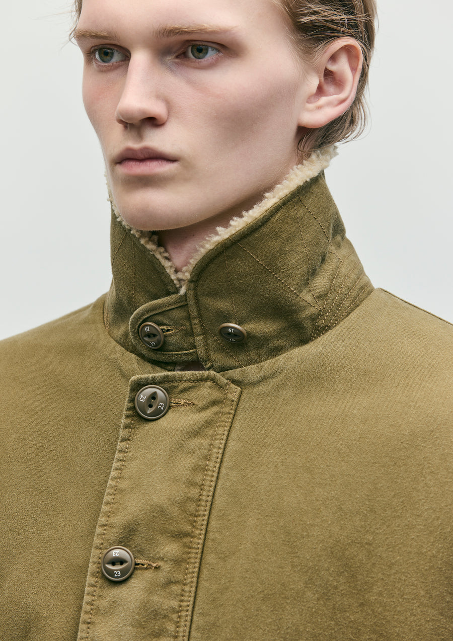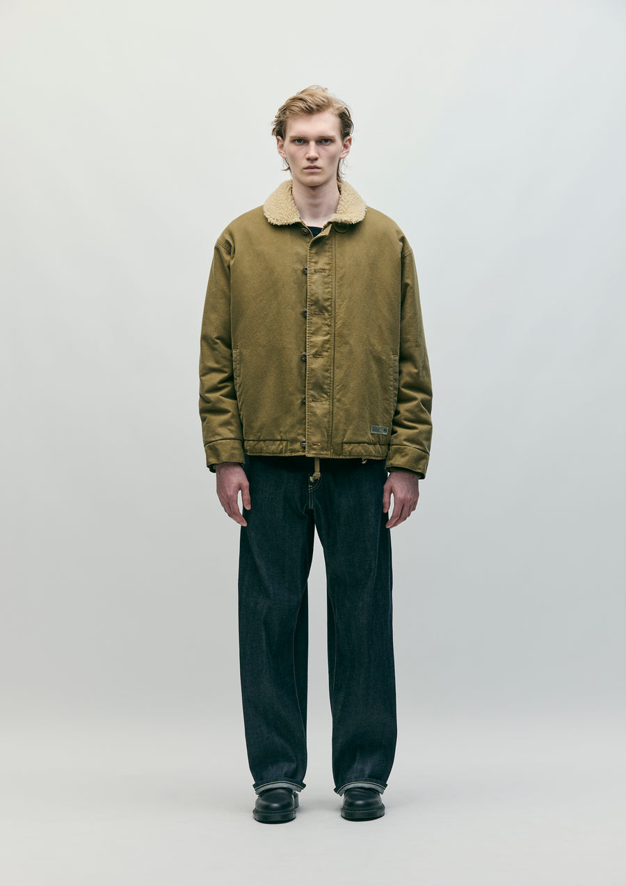 自然な色落ち感が楽しめる硫化染めしたジャーマンコードクロスをベースに、襟部分にボア素材を組み合わせたデッキジャケット。丈夫であり、程よい柔らかさのある素材。フロントはオリジナルボタン付きの前立てとファスナー留めを採用し、袖口はインナーリブ仕様。裾部分には調節用のドローコードを内蔵。背面には擦れた表現のロゴをプリント。サイドシームにピスネームを付属。