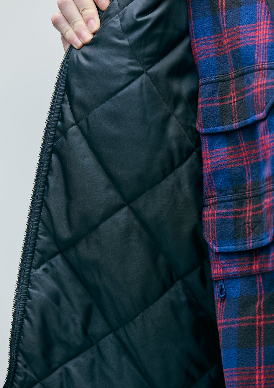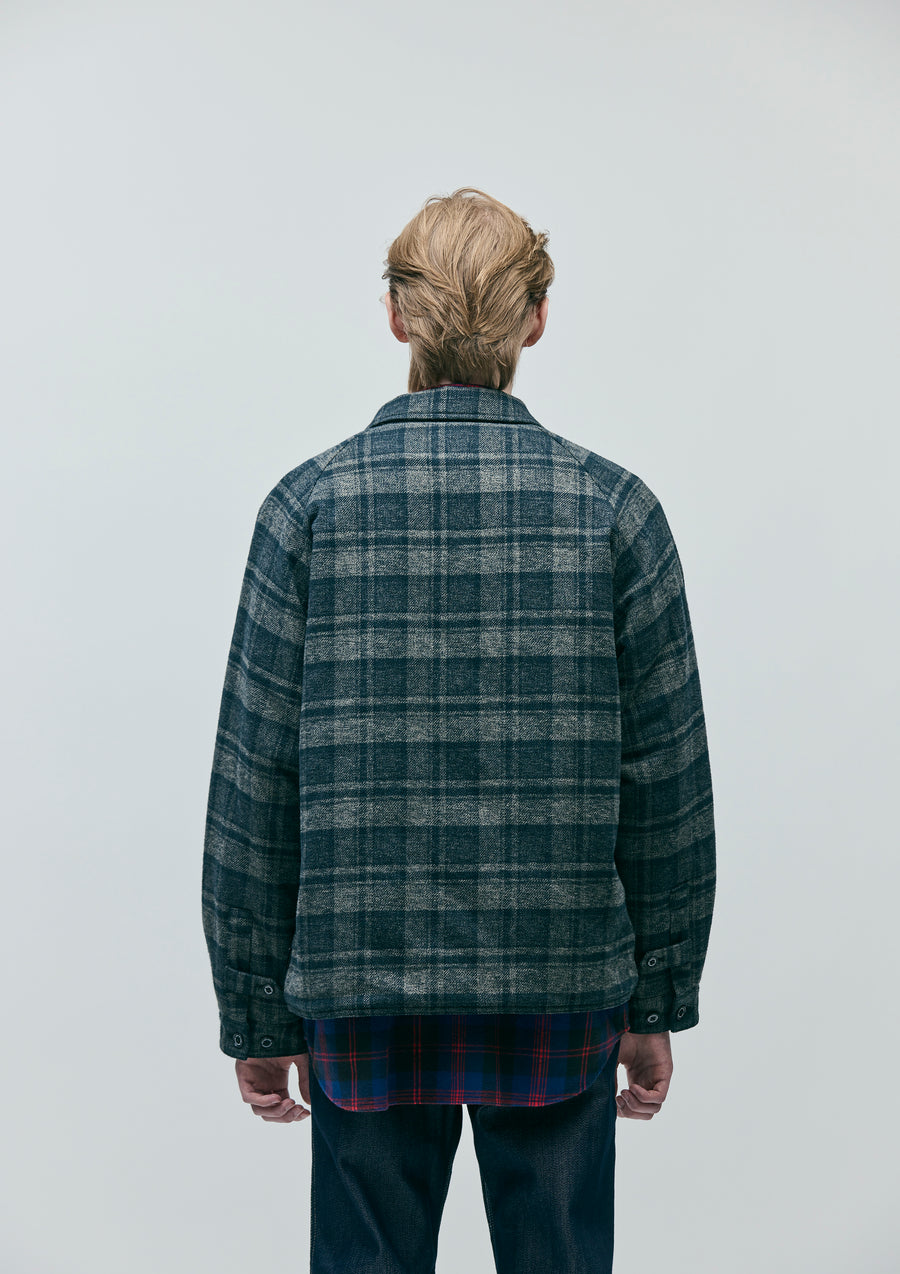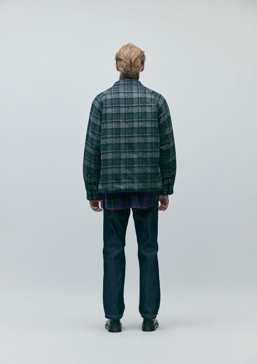 暖かみのある配色のコットンチェック生地を使用したジップワークジャケット。両サイドにファスナーテープを見せた箱ポケットを配置。袖口はタブ付きの剣ボロ仕様。裏地にはダイヤキルティングを採用。サイドシームにピスネームを付属。