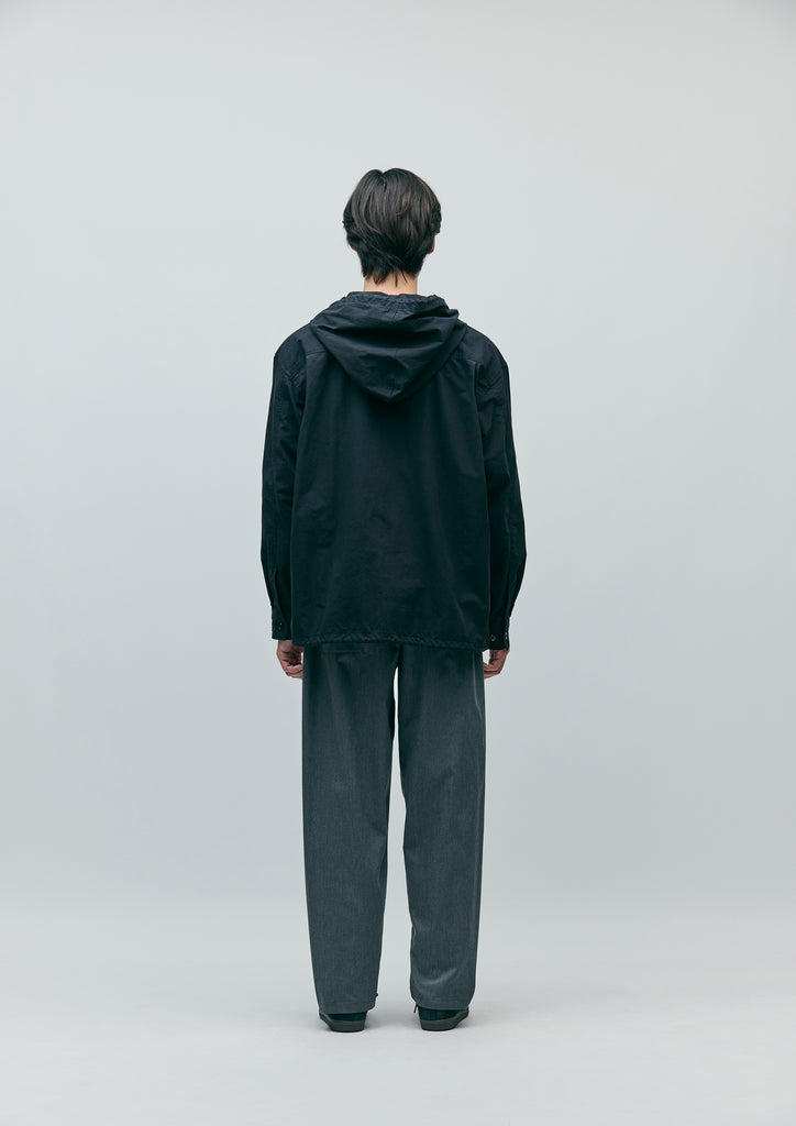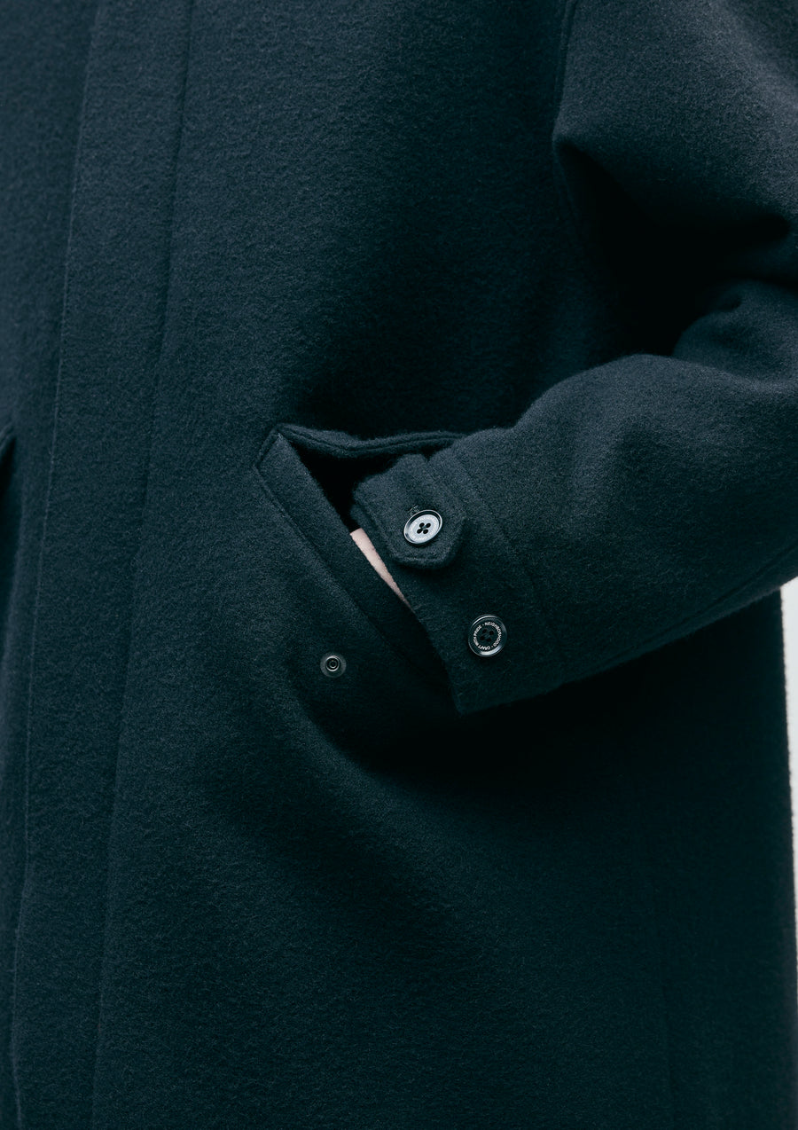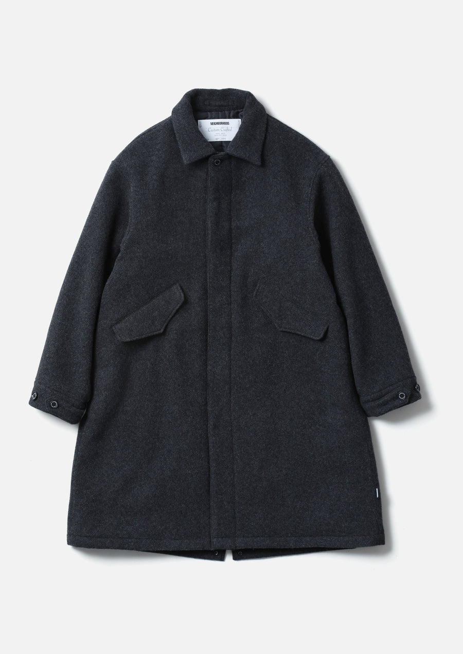 トップ糸を使用し、二重織りで仕上げたソフトな風合いの中肉トップメルトン素材のウールコート。両サイドに隠しスナップ仕様のフラップポケットを配置。裾はフィッシュテール仕様。袖下にオリジナルのパブタオルを施し、背面にはロゴをプリント。オリジナルの4つ穴ボタンを採用し、サイドシームにピスネームを付属。