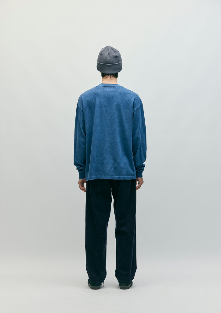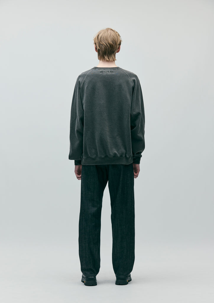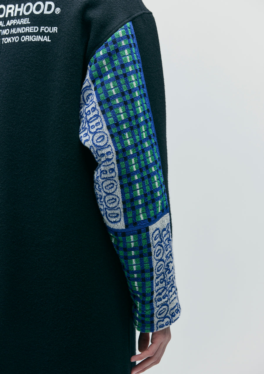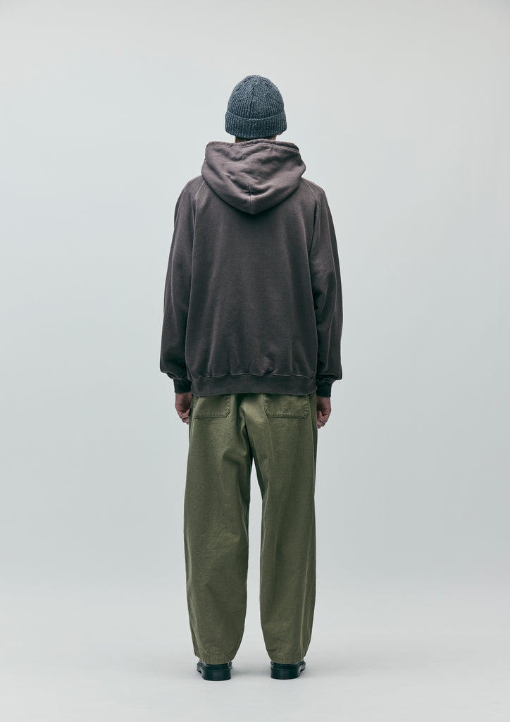 トップ糸を使用し、二重織りで仕上げたソフトな風合いの中肉トップメルトン素材のウールコート。両サイドに隠しスナップ仕様のフラップポケットを配置。裾はフィッシュテール仕様。袖下にオリジナルのパブタオルを施し、背面にはロゴをプリント。オリジナルの4つ穴ボタンを採用し、サイドシームにピスネームを付属。