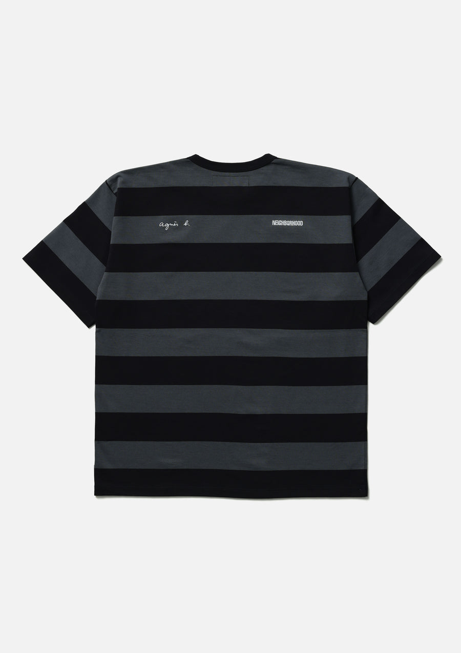 agnès b.オリジナルのワイドボーダー生地を使用したボーダーカットソー。背面に両ブランドのロゴ刺繍を配置。左裾にブランドタグ、脇接ぎにピスネームを付属。