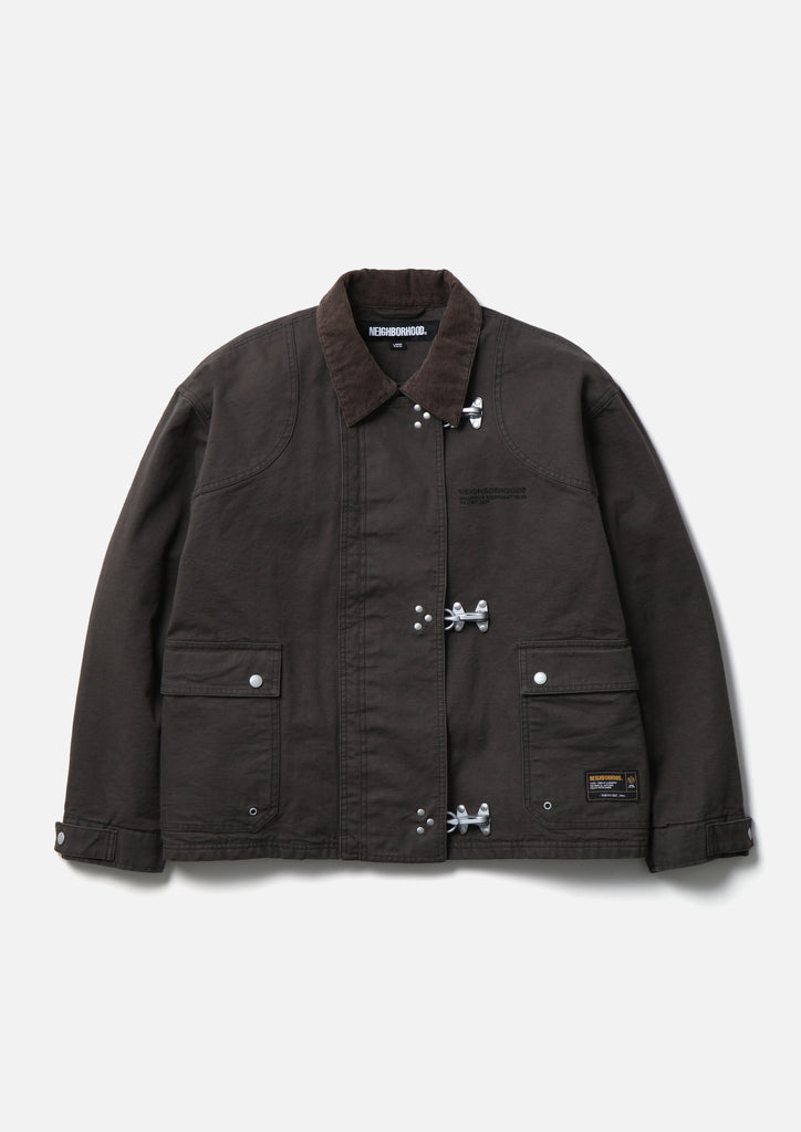 シェットランドウールを使用し、3ゲージのガーター編みで仕上げたニットジャケット。ロゴとスローガン入りのオリジナルボタンを採用。左ポケットにネームタグを配置。