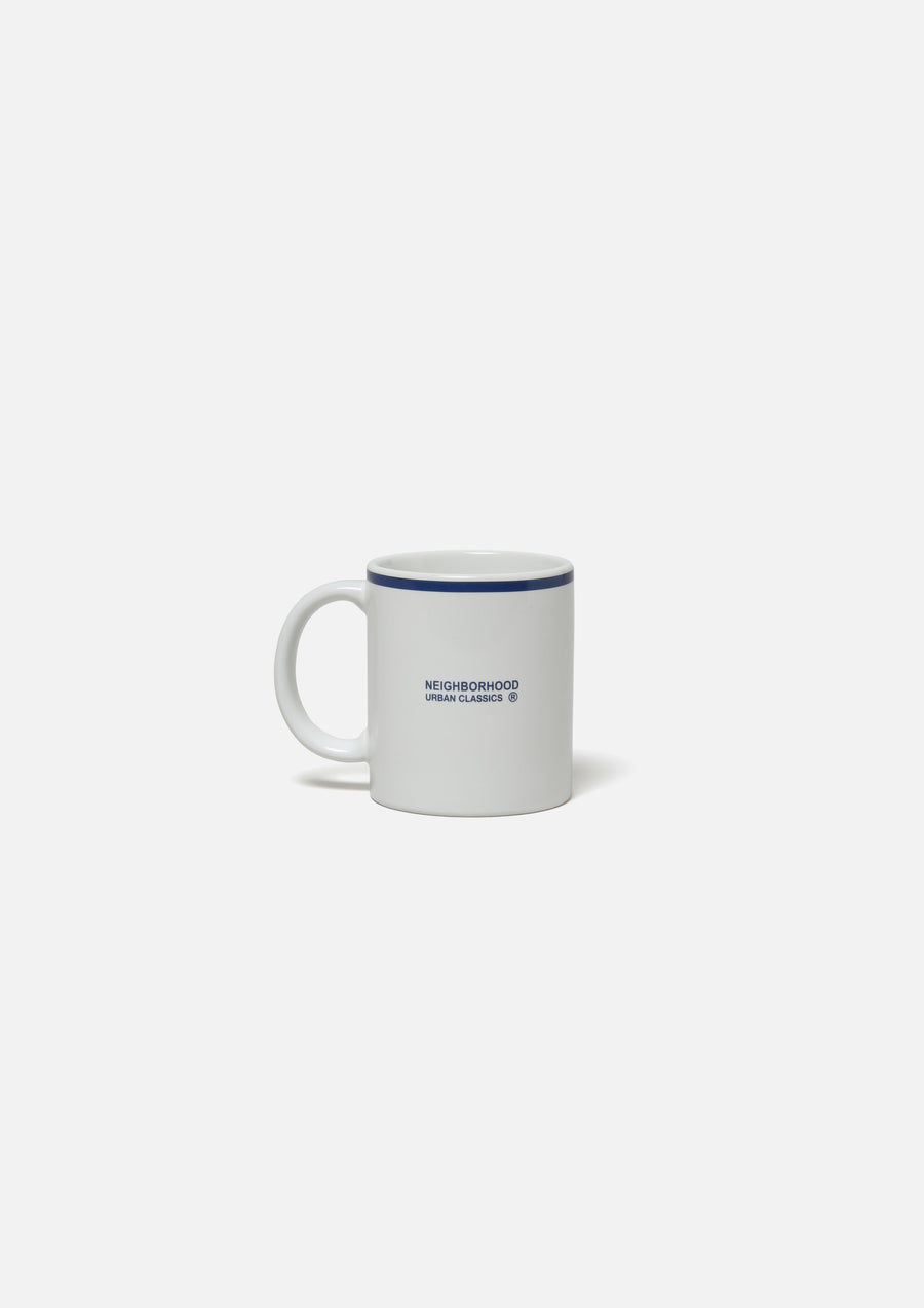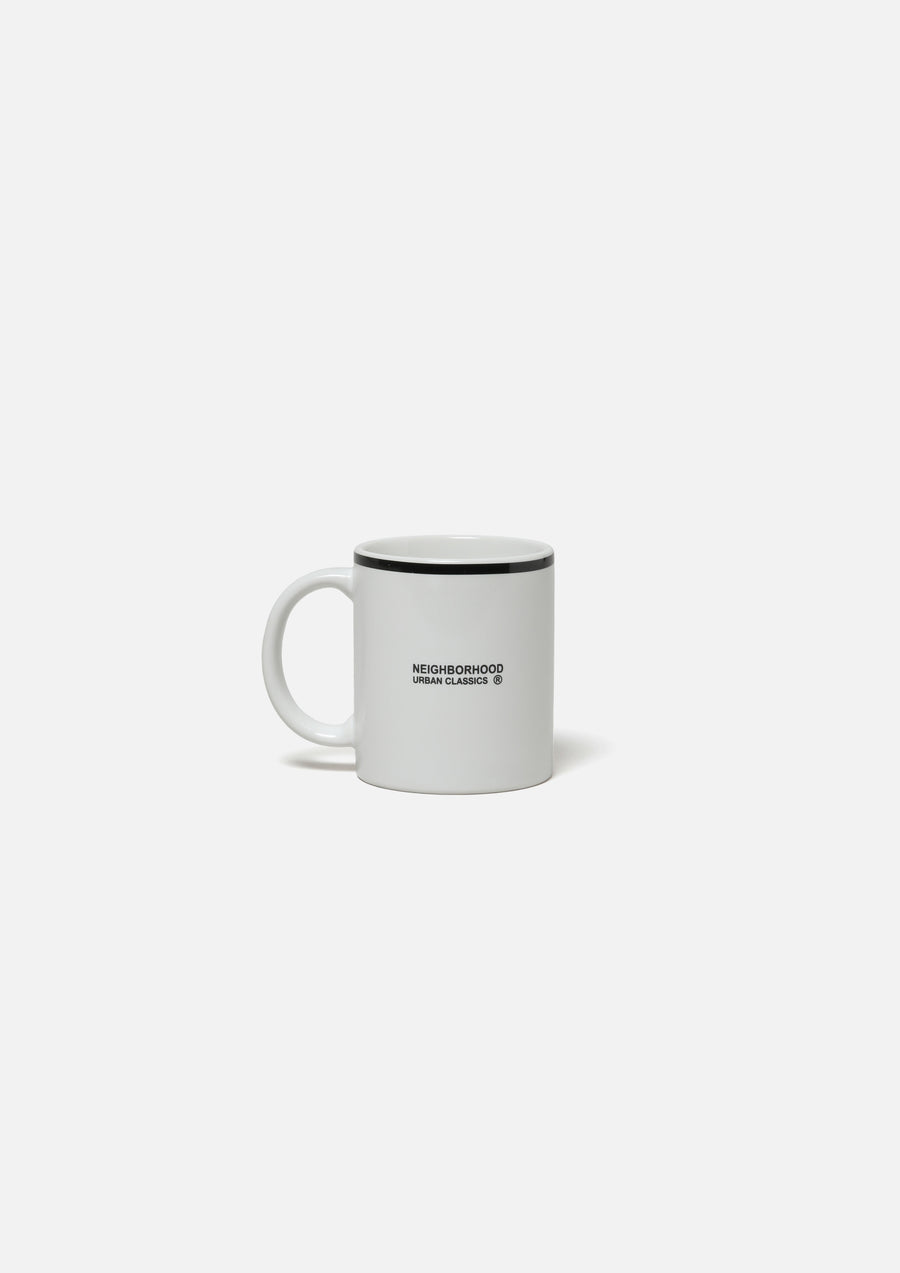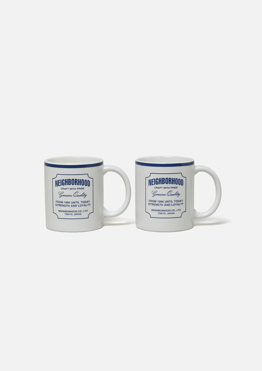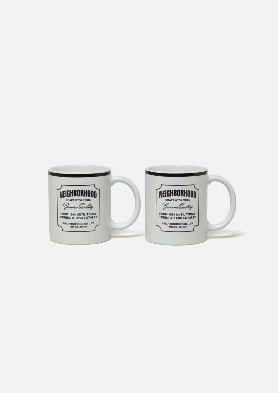 側面にロゴとラインデザインを転写プリントしたセラミック製マグカップ。2個1セット。