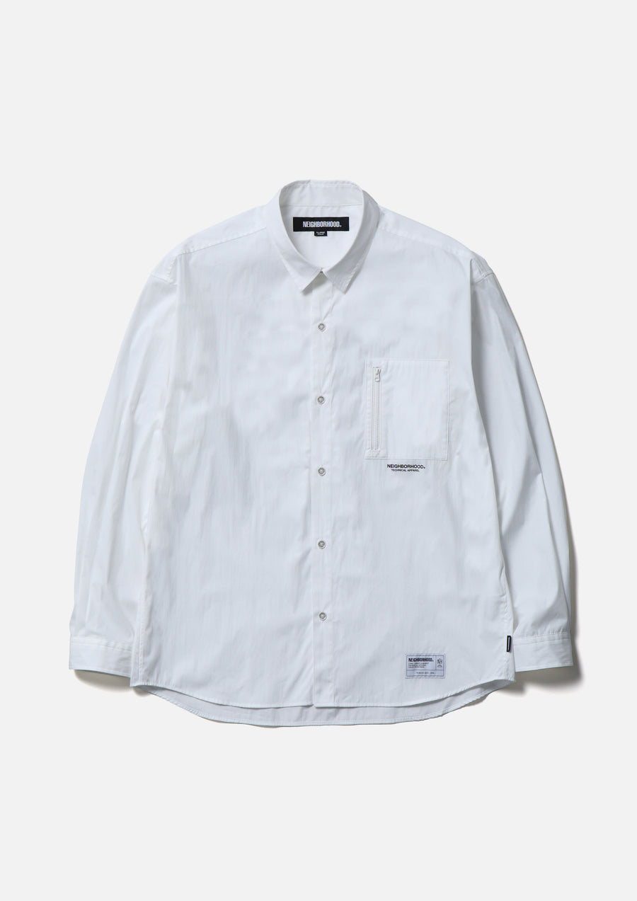 綿/ナイロン混紡の高密度タイプライター素材を使用したプレーンシャツ。生地表面にピーチ起毛とバイオ加工を施し、独特の風合いを創出。左胸にファスナー付きポケットを配置し、下部にはロゴをプリント。オリジナルの四つ穴ボタンを採用し、左裾にネームタグ、サイドシームにピスネームを付属。通常のプレーンシャツに比べて着丈を短く調整したシルエット。ワンウォッシュ。