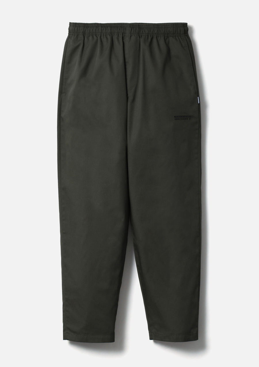 上品な光沢を持つ中肉ツイル生地を使用したイージーパンツ。ゴム入りのウエストにスピンドルを内蔵。太腿にロゴを刺繍。サイドシームにピスネームを付属。ゆとりのあるシルエット。