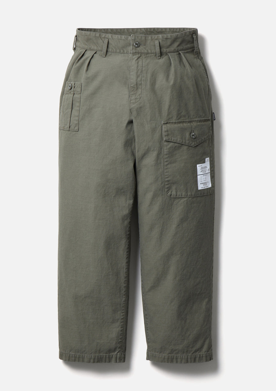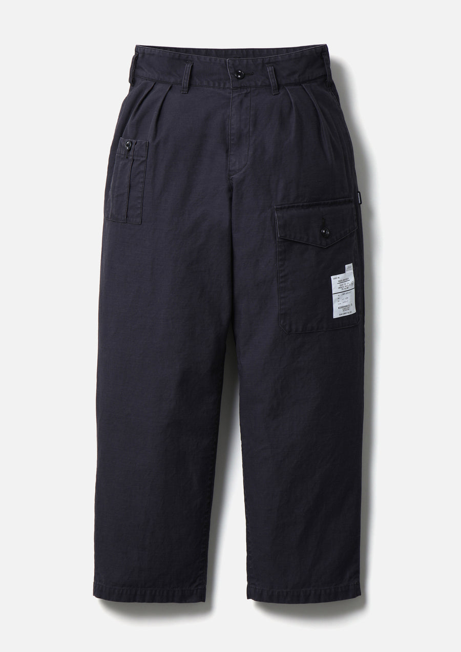 太番手のバックサテン生地にバイオウォッシュ加工を施したジャングルトラウザーパンツ。両サイドのスラッシュポケットに加え、前後に配置したフラップポケットが特徴。オリジナルの猫目ボタンとフロントファスナーを採用。ゆとりのあるシルエット。
