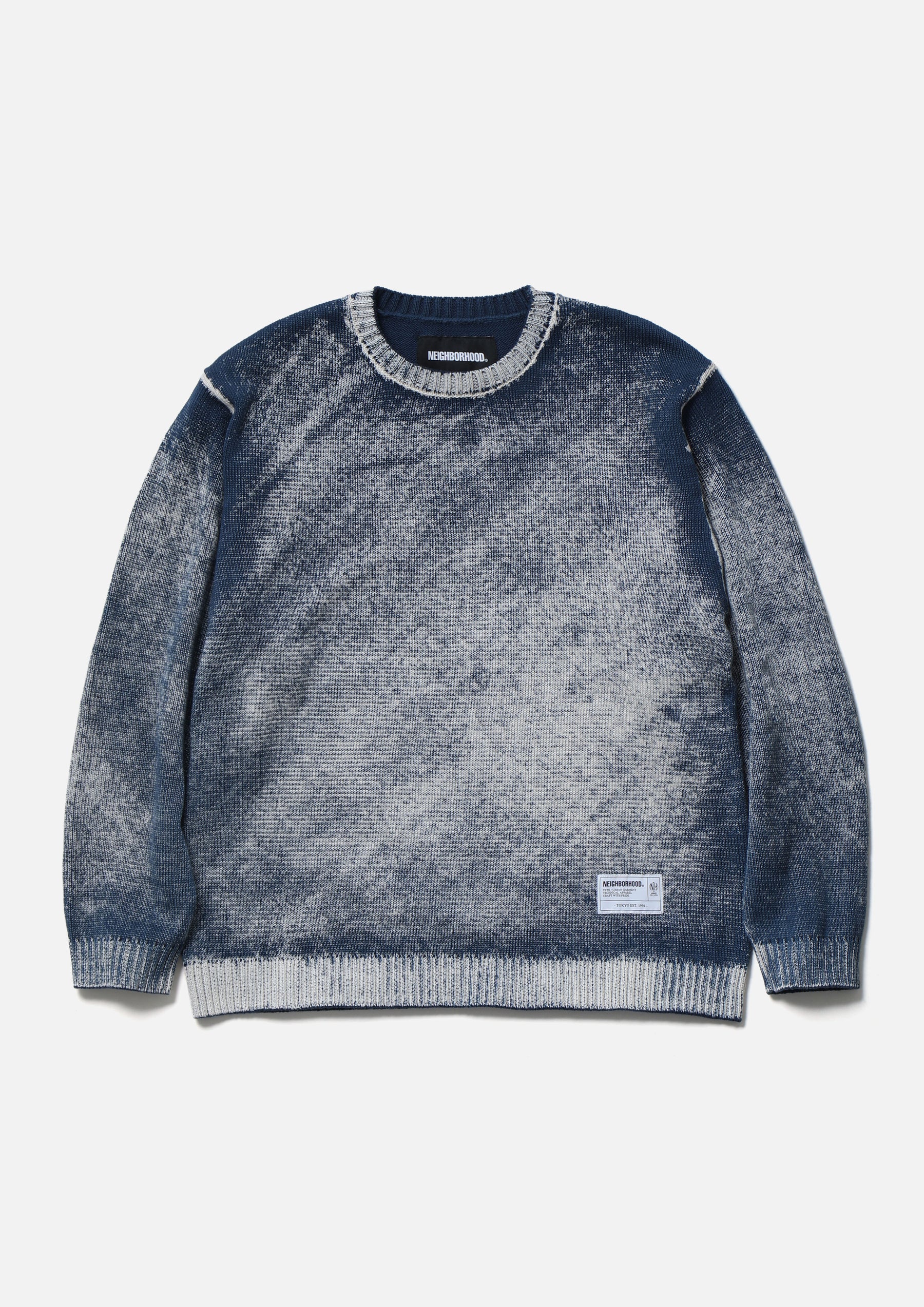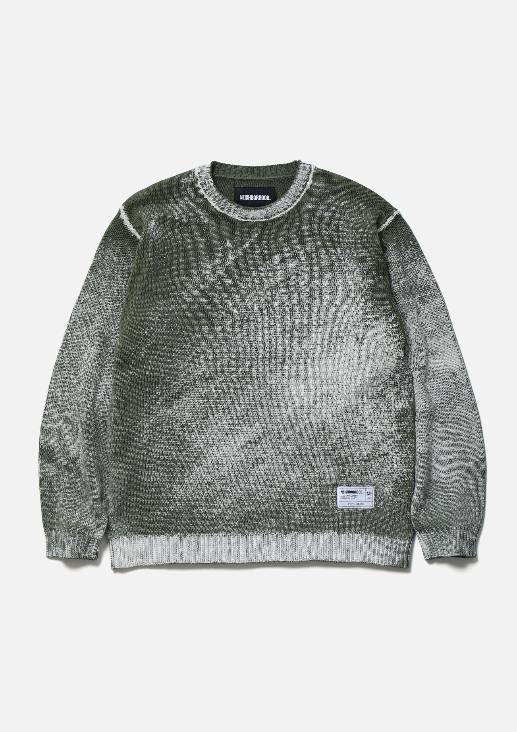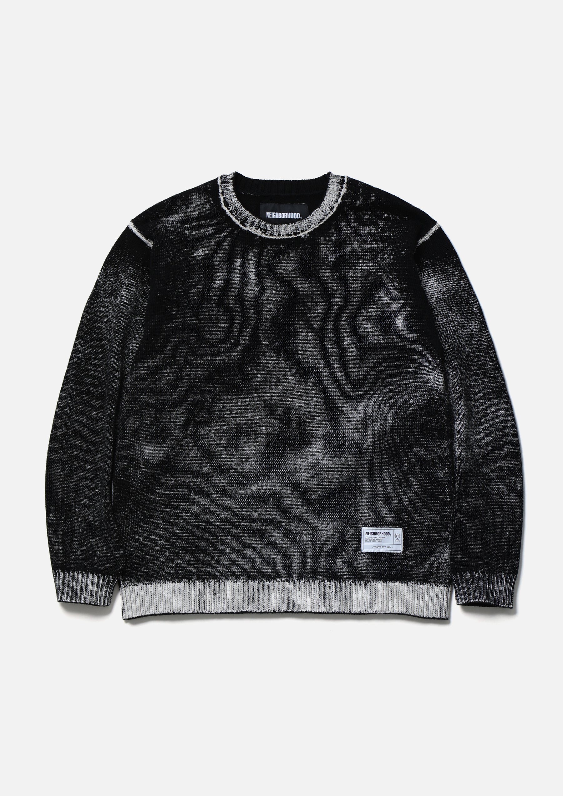 編み立てたパーツの状態で裏側からプリントし、表側に浸透したインクで柄を表現した長袖クルーネックニット。