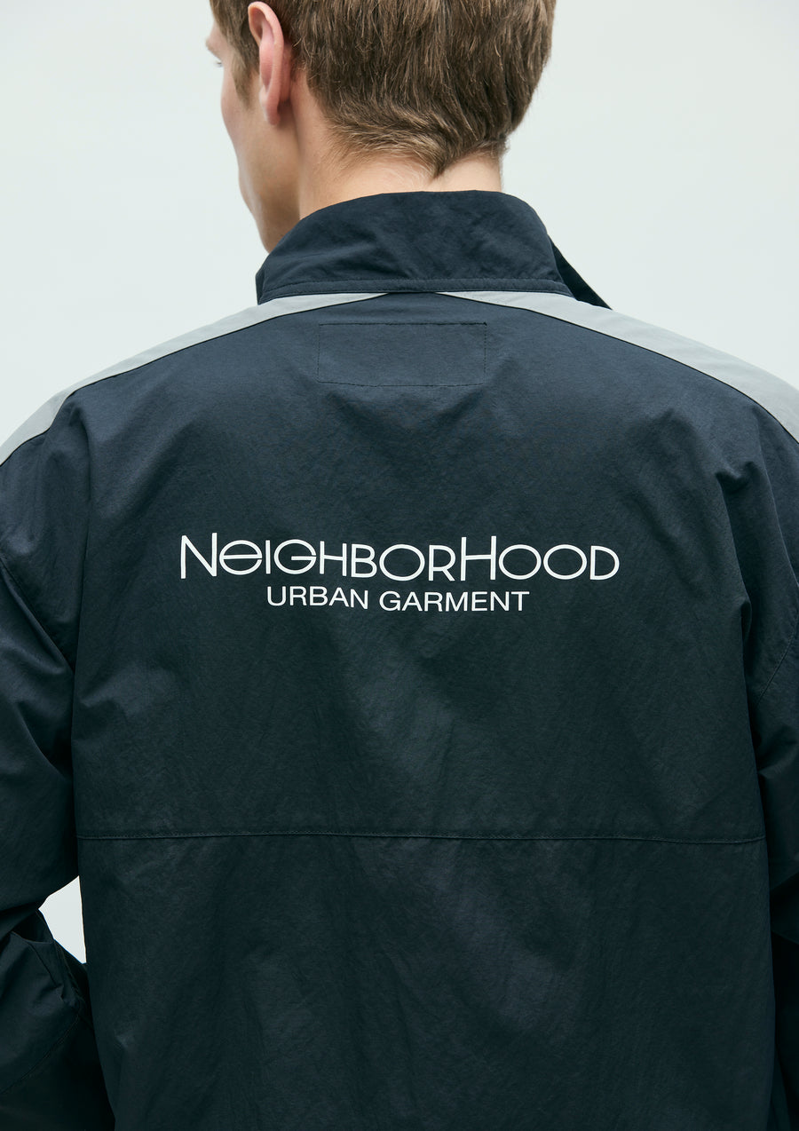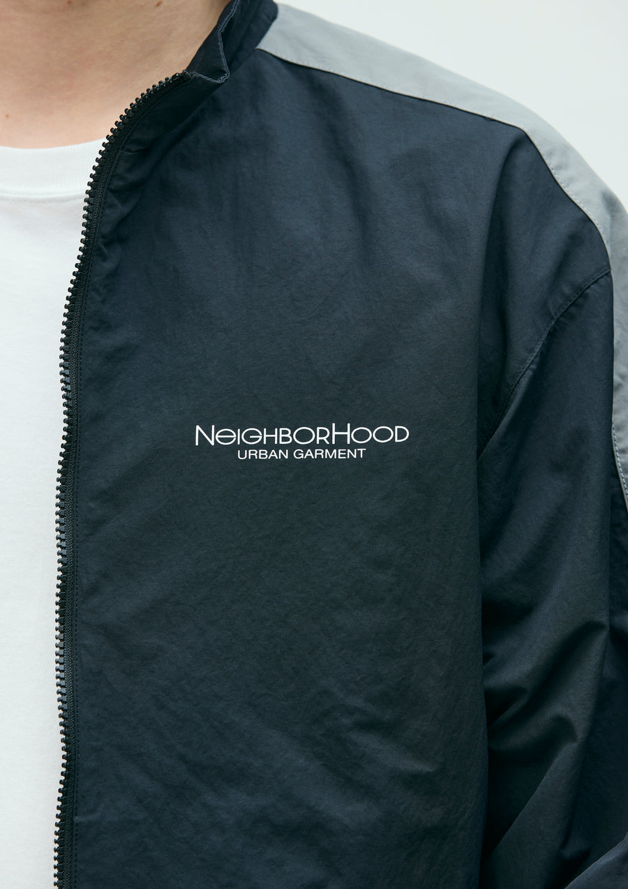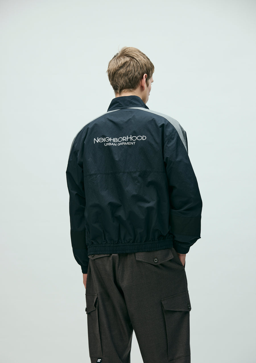 耐久撥水性と透湿防水性のあるスパンライクなナイロン高密度タフタ生地と配色のコットンナイロンラグラン素材を組み合わせたトラックジャケット。ウエストジップポケットを配置。左胸と背面にロゴをプリント。左裾にブランドタグ、脇接ぎにピスネームを付属。