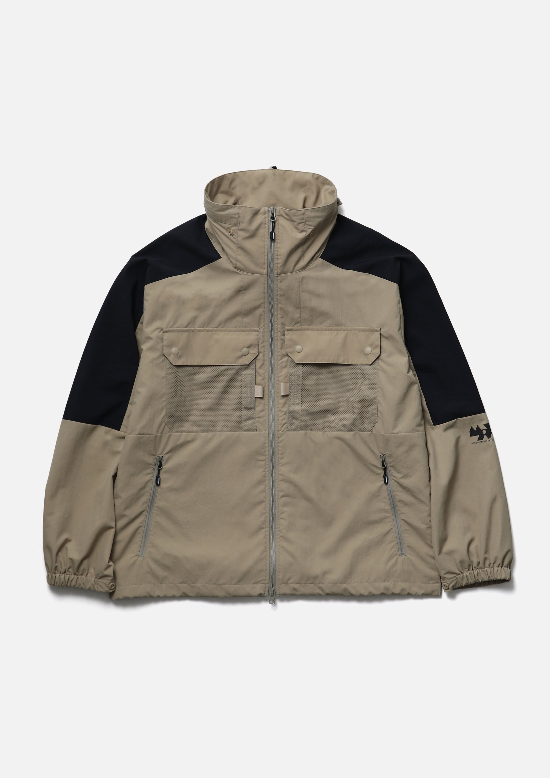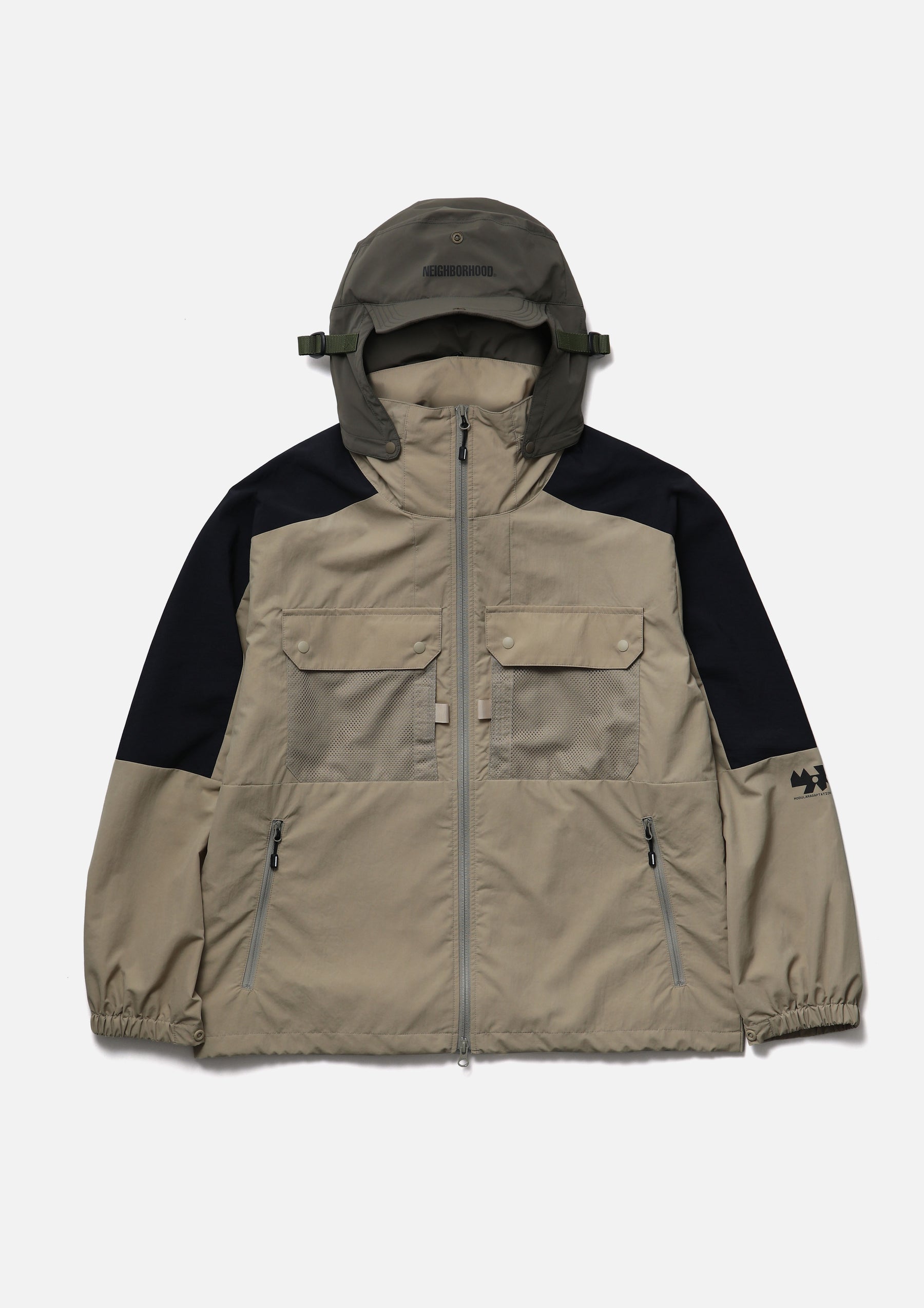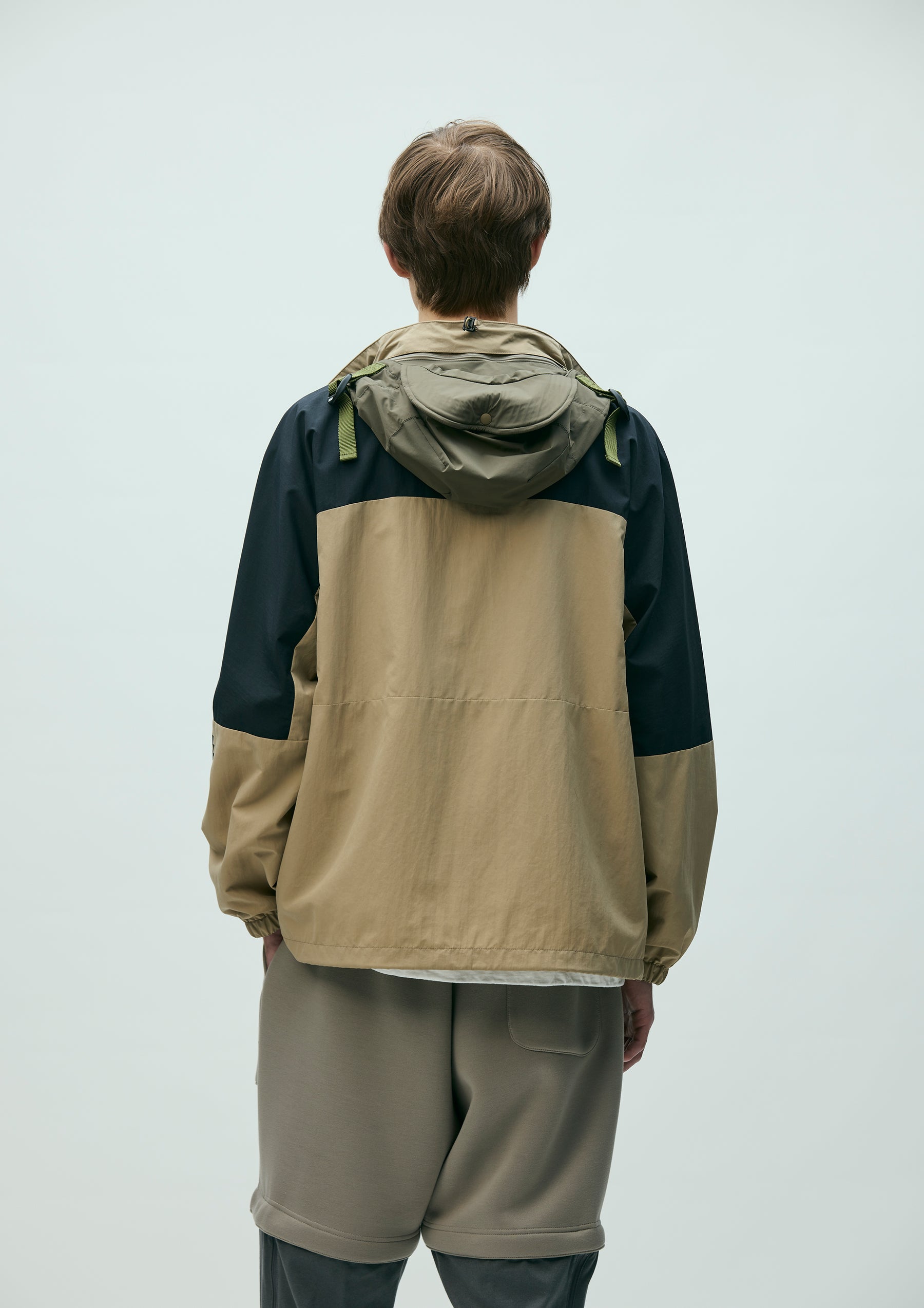 耐久性・撥水性・軽量性を備えるタスランナイロンウェザークロスを使用したフーデッドジャケット。防水性と透湿性に優れるカルバック2.5層構造の軽量ナイロン×PU素材のフードはデタッチャブル仕様。特徴的な切り替えパターンをベースに、フード/スリーブにグラフィックをプリントしたデザイン。縦と横どちらからも使える2WAY仕様のメッシュ地胸ポケットとジップポケットを配備。裾にゴムドローコードを内蔵。オリジナルバックルを採用。脇接ぎにピスネームを付属。