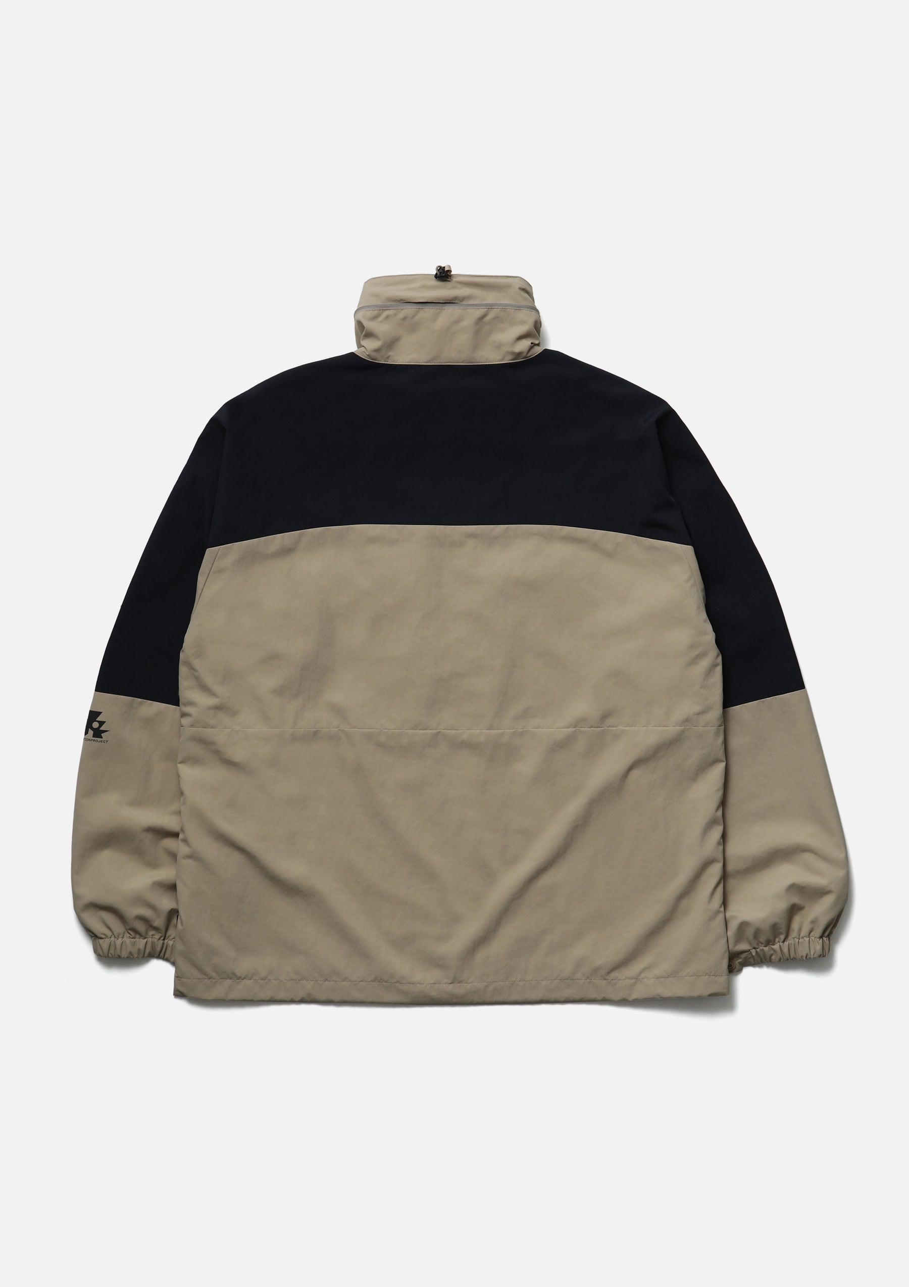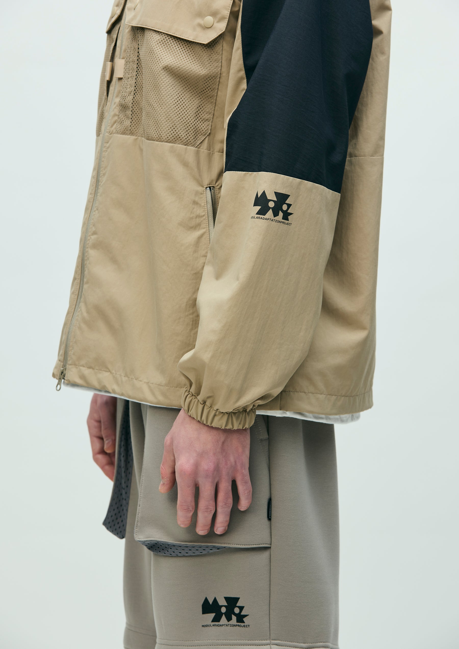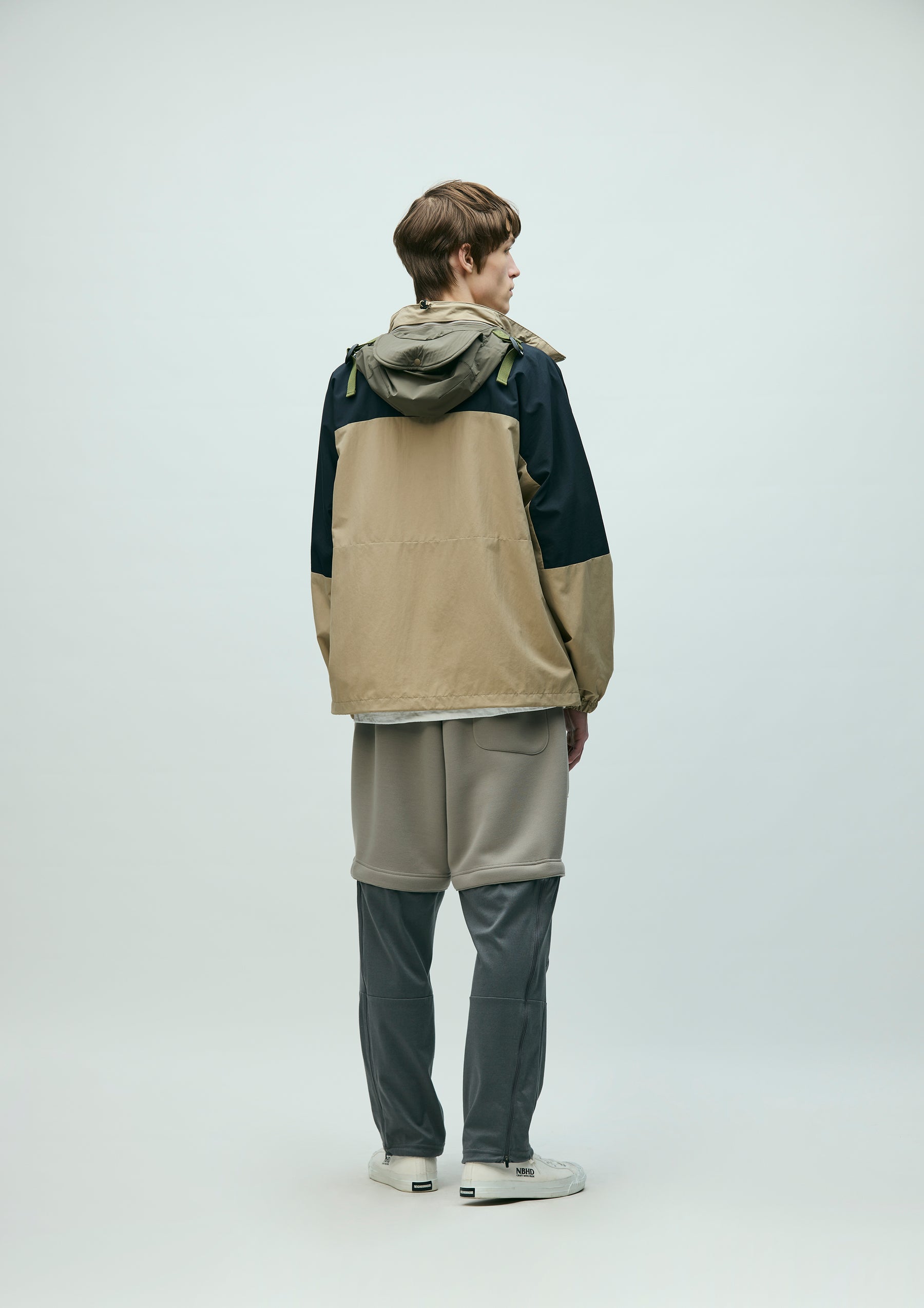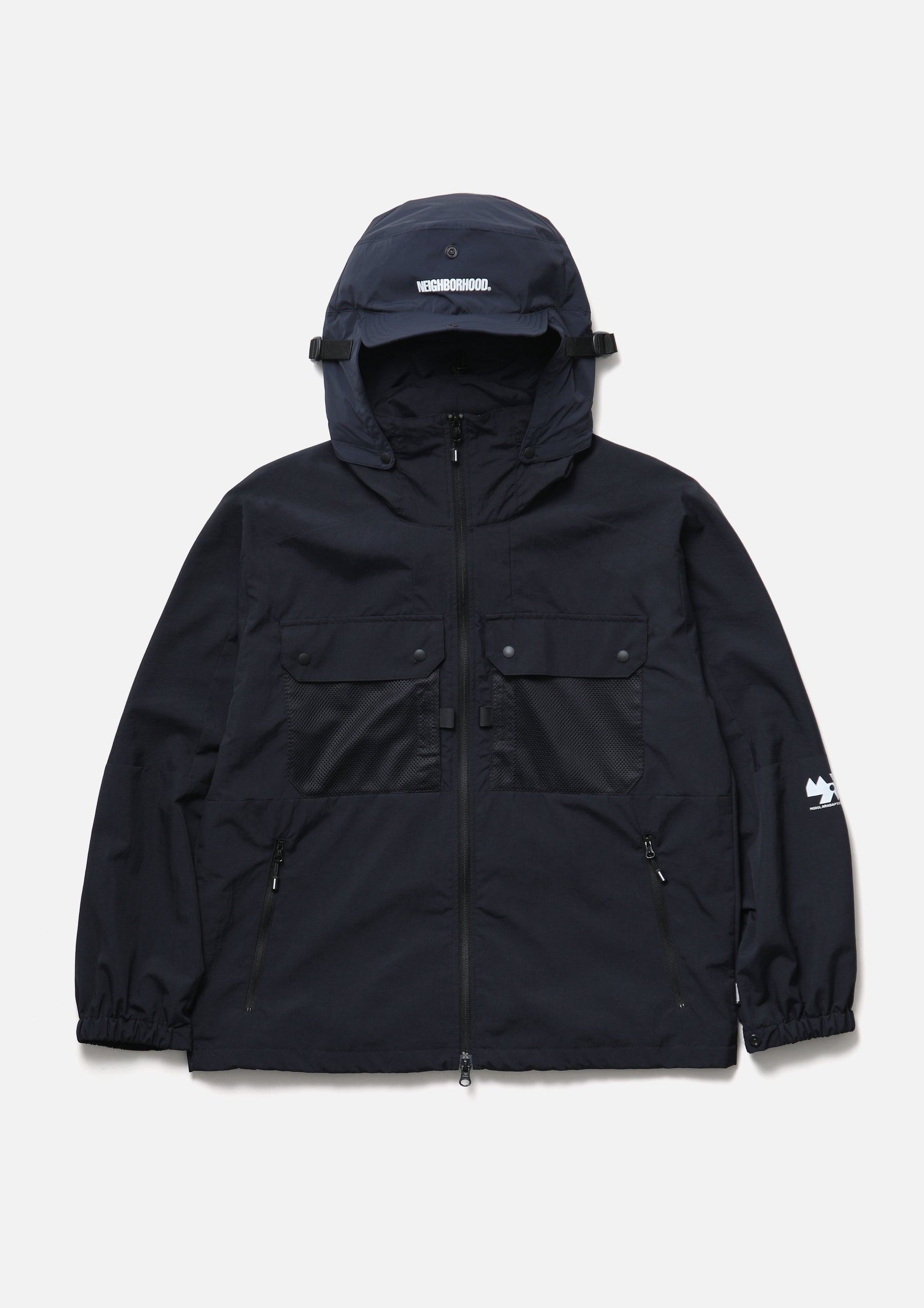 耐久性・撥水性・軽量性を備えるタスランナイロンウェザークロスを使用したフーデッドジャケット。防水性と透湿性に優れるカルバック2.5層構造の軽量ナイロン×PU素材のフードはデタッチャブル仕様。特徴的な切り替えパターンをベースに、フード/スリーブにグラフィックをプリントしたデザイン。縦と横どちらからも使える2WAY仕様のメッシュ地胸ポケットとジップポケットを配備。裾にゴムドローコードを内蔵。オリジナルバックルを採用。脇接ぎにピスネームを付属。