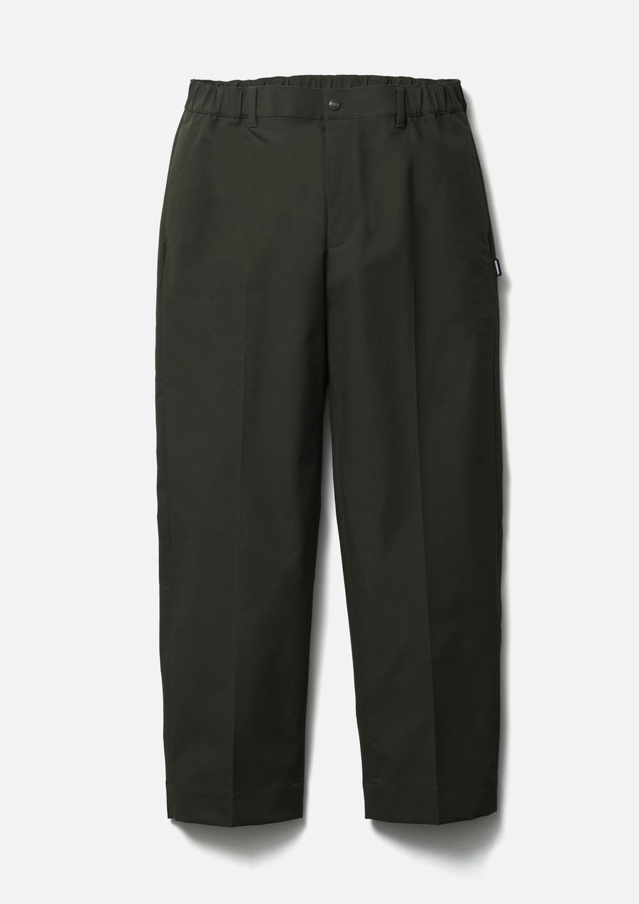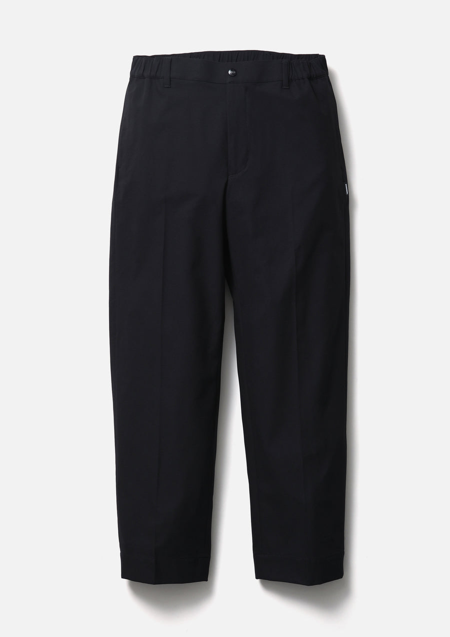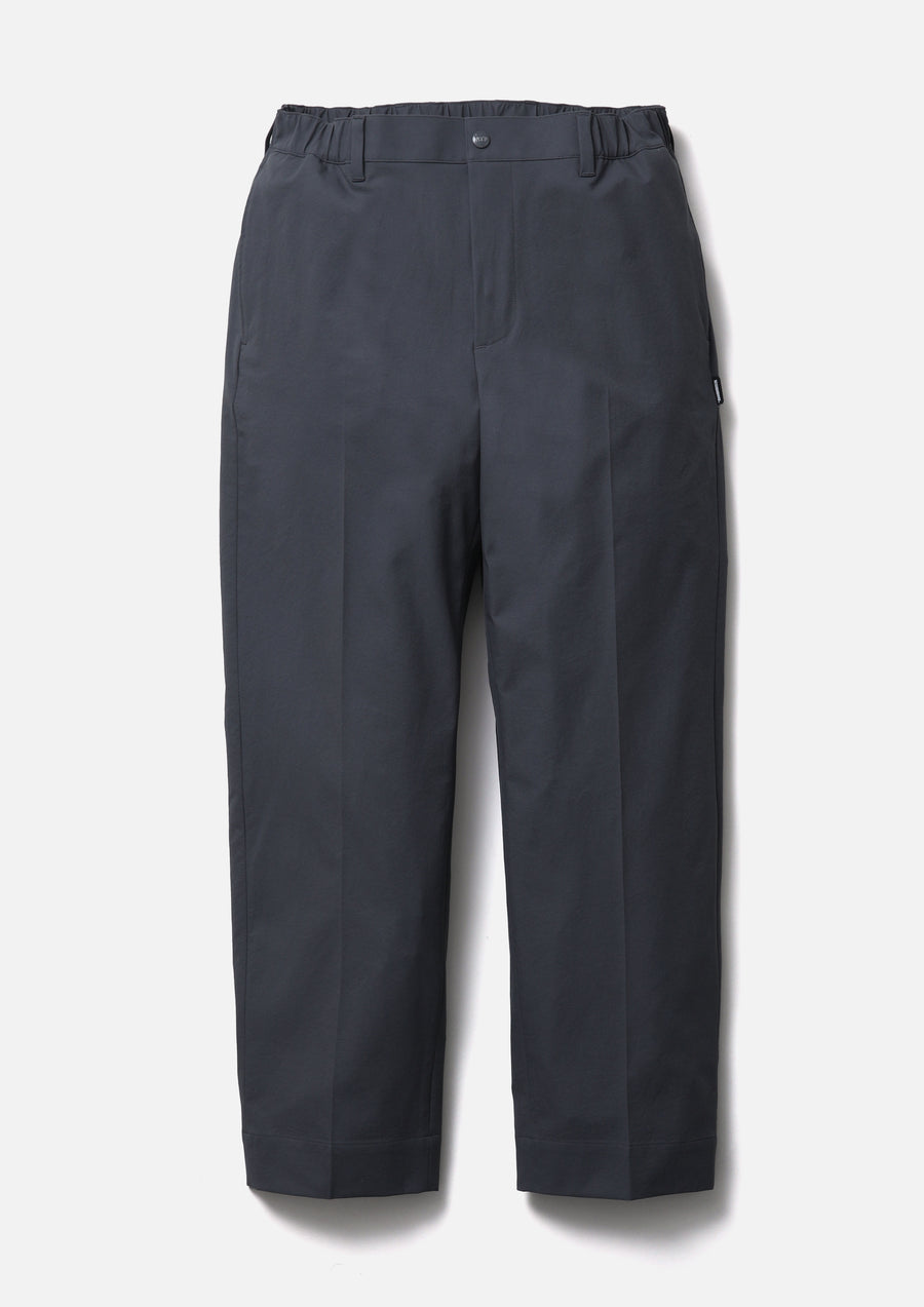 特殊分子構造により全方向へのストレッチ性と高耐久性を備えるポリエステルチノ素材を使用したテーパードシルエットパンツ。綾目のはっきりしたツイルにシワ加工と撥水性を加えた高機能素材。ベルトループ付きのゴム入りウエスト仕様。オリジナルのスナップボタン、ジッパープル、シグネチャーテープを採用。背面フラップポケットにブランドタグ、脇接ぎにピスネームを付属。