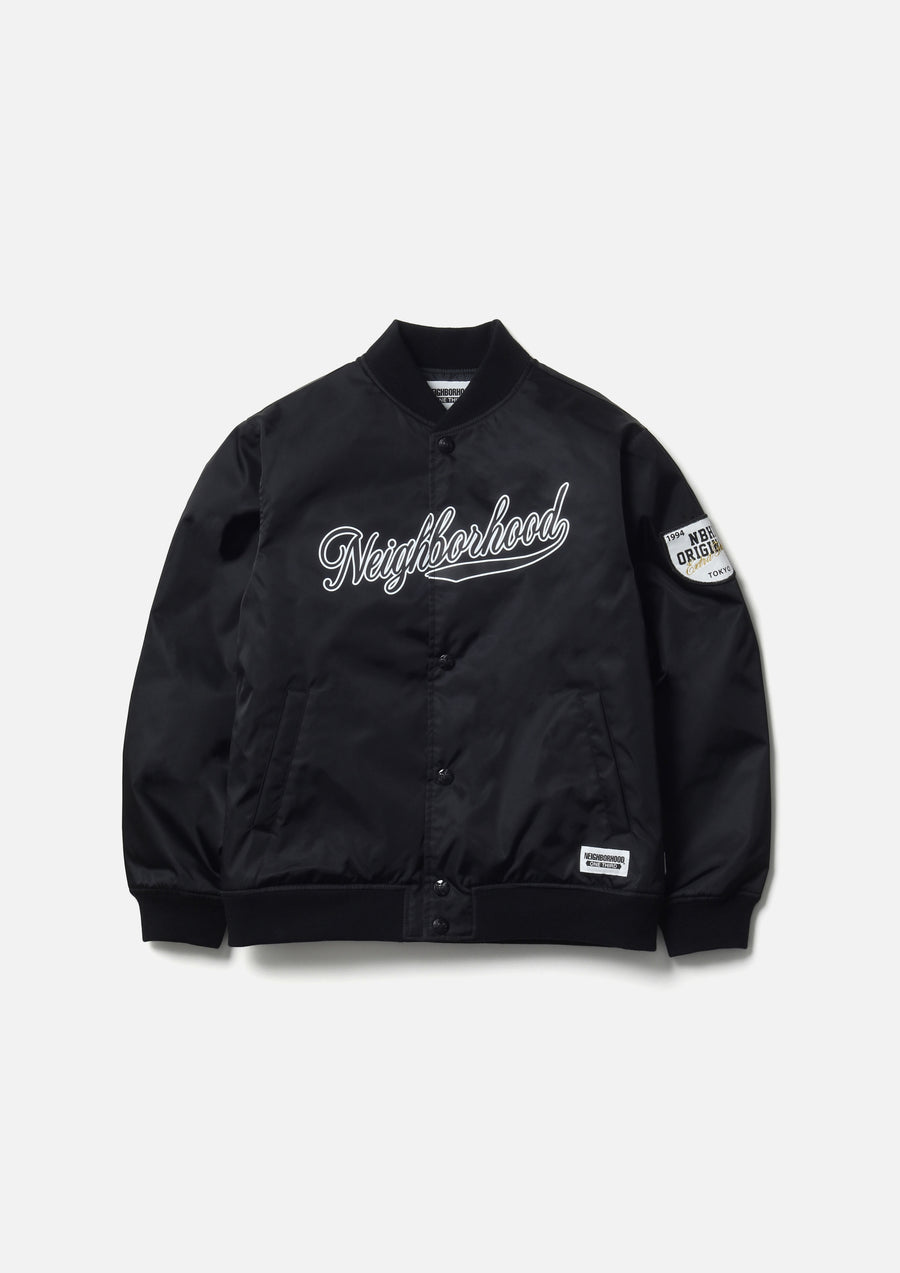 程よいハリとコシがあり、耐久性に優れるナイロンツイル素材を使用したベースボールジャケット。フロントにロゴプリントを施し、左袖にはロゴパッチを配置。オリジナルのスナップボタンを採用し、左裾にネームタグ、サイドシームにピスネームを付属。