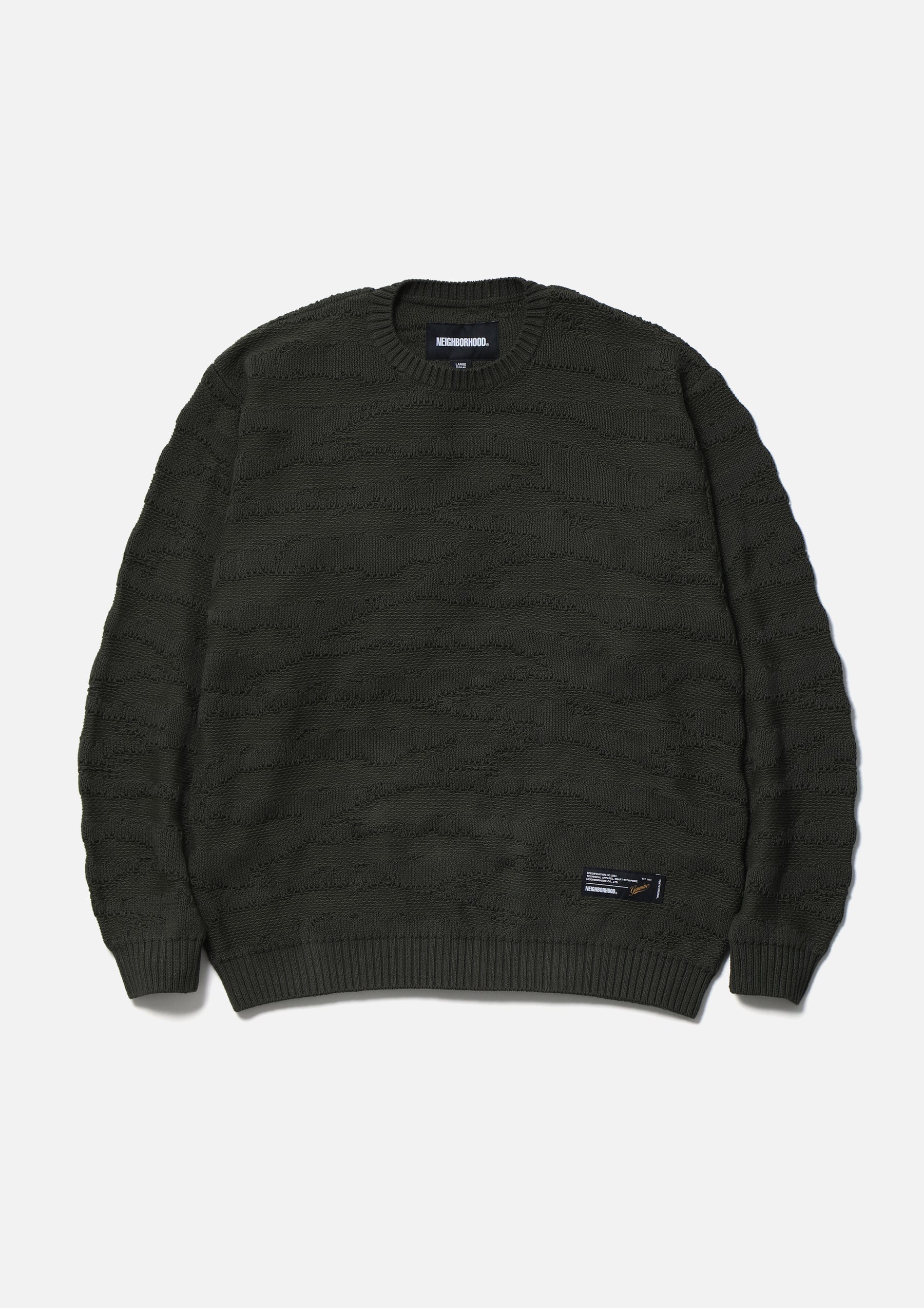 コットン糸で編み立てたタイガーカモ柄のクルーネックニット。タイガーカモ柄はダブルジャカードで表現。左裾にブランドタグを配置。