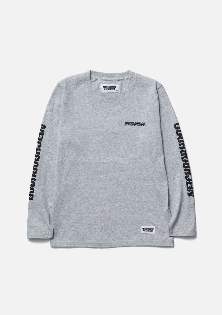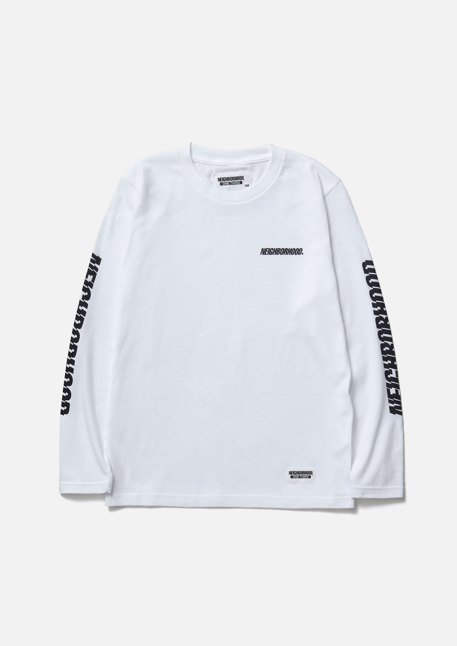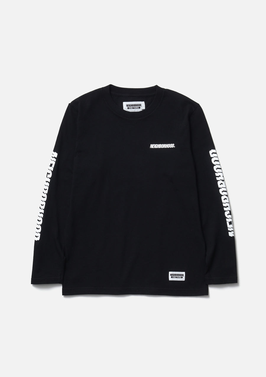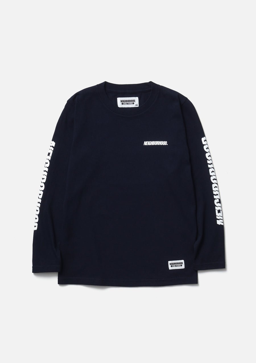 5.6ozのヘビーウェイトボディーを使用したロングスリーブTシャツ。左胸と袖にロゴをプリント。左裾にネームタグを配置。