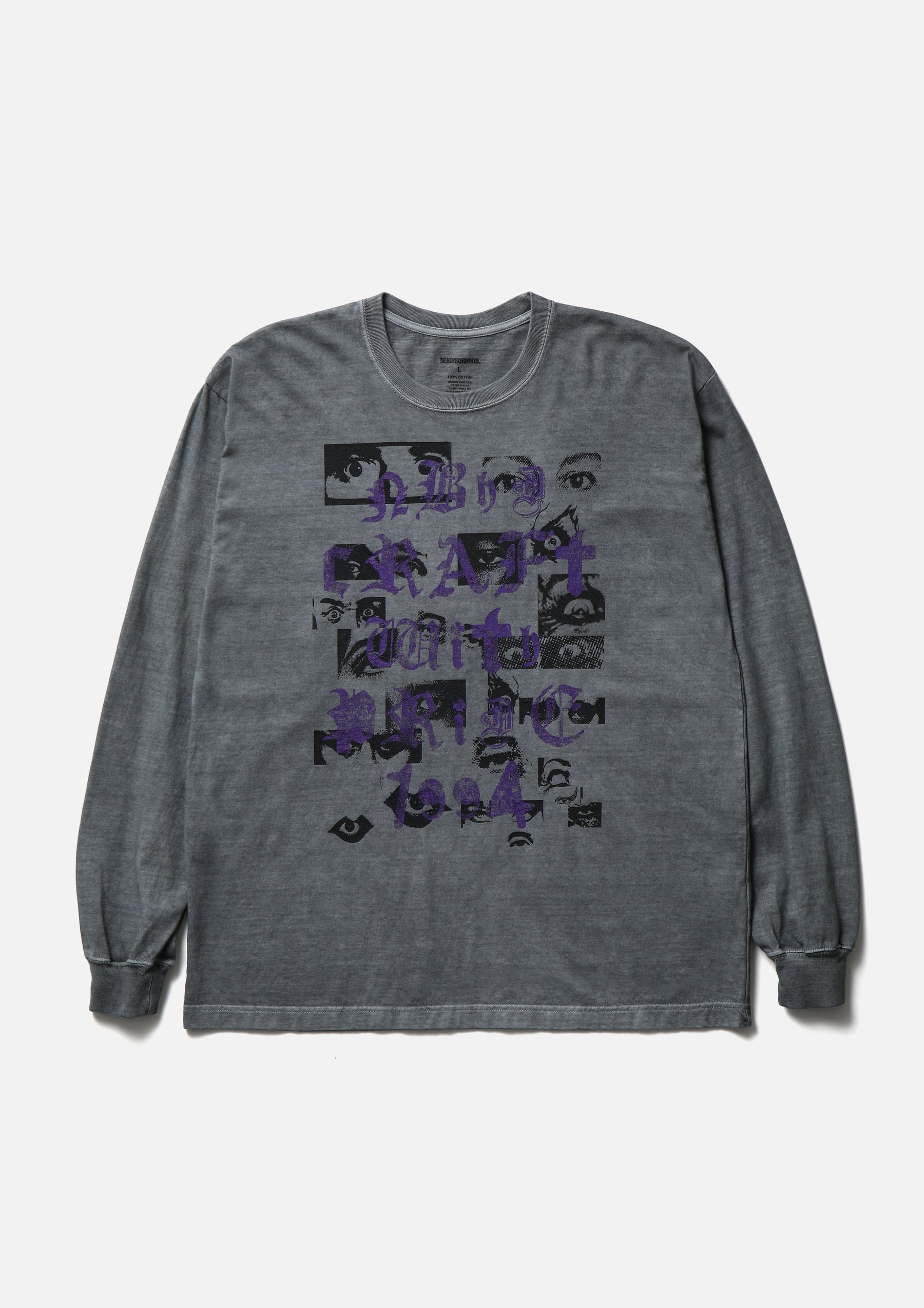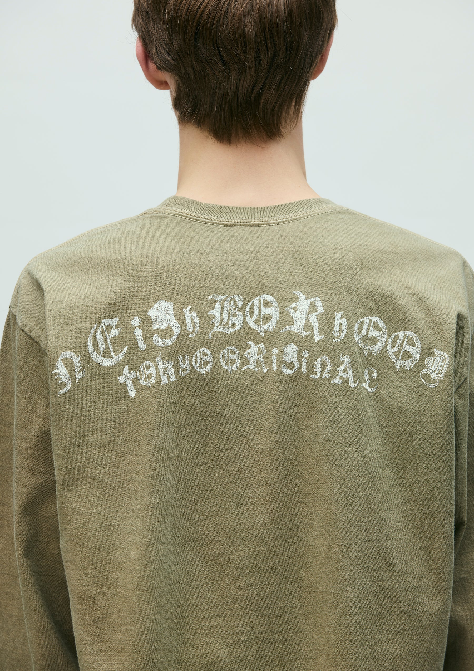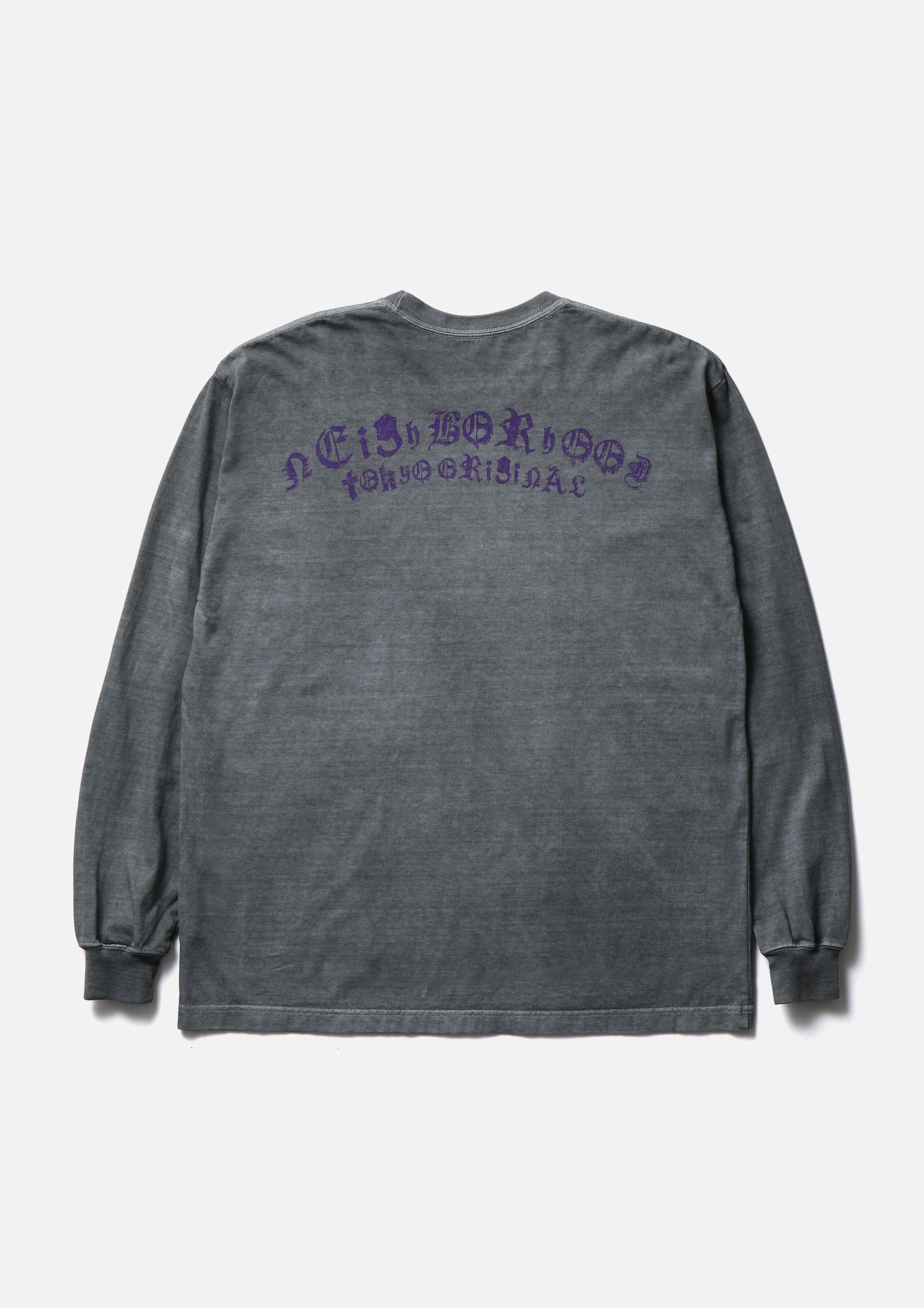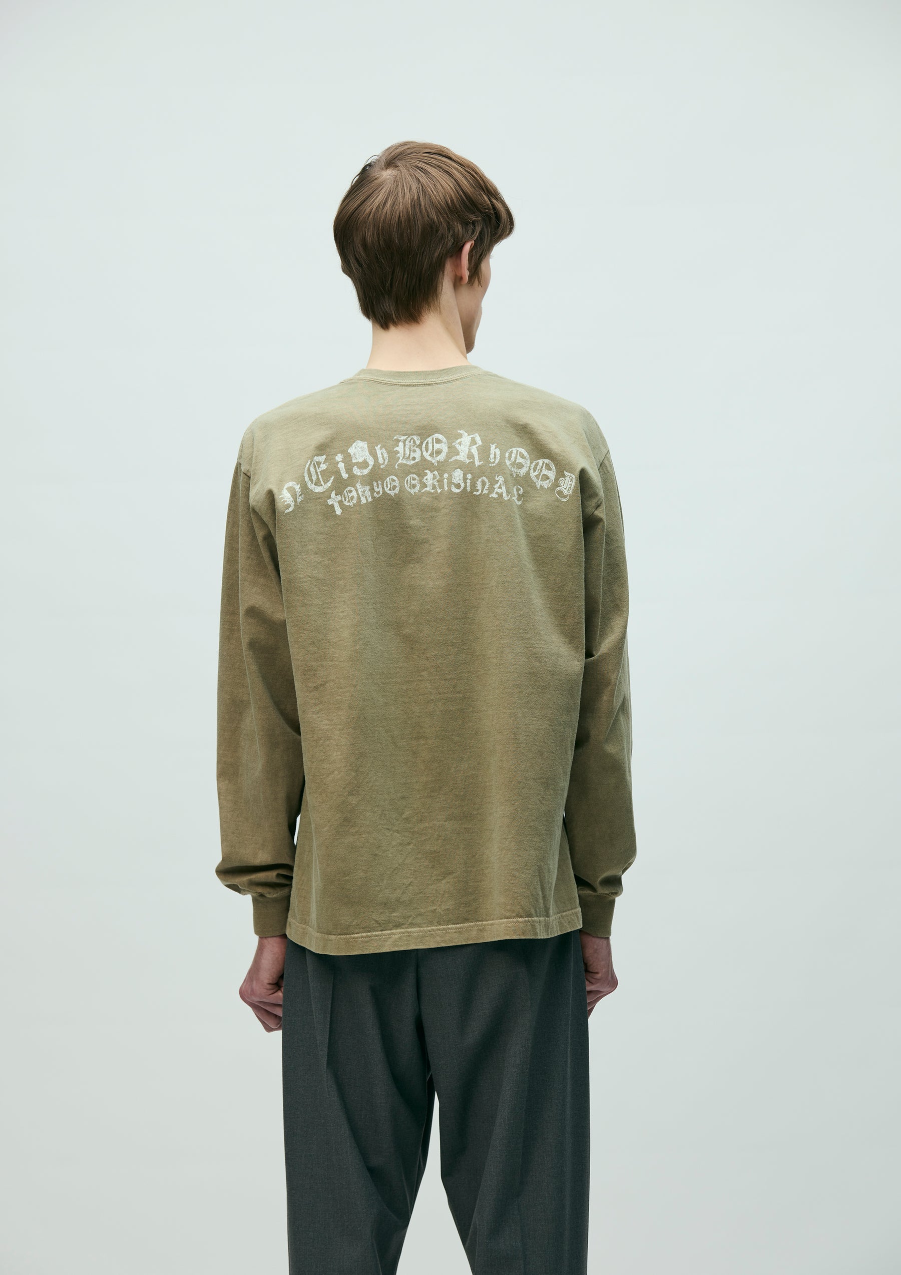 コットン天竺のオリジナルボディをベースに、顔料染め加工を施したロングスリーブTシャツ。正面と背面にグラフィックをプリント。ワンウォッシュ仕上げ。