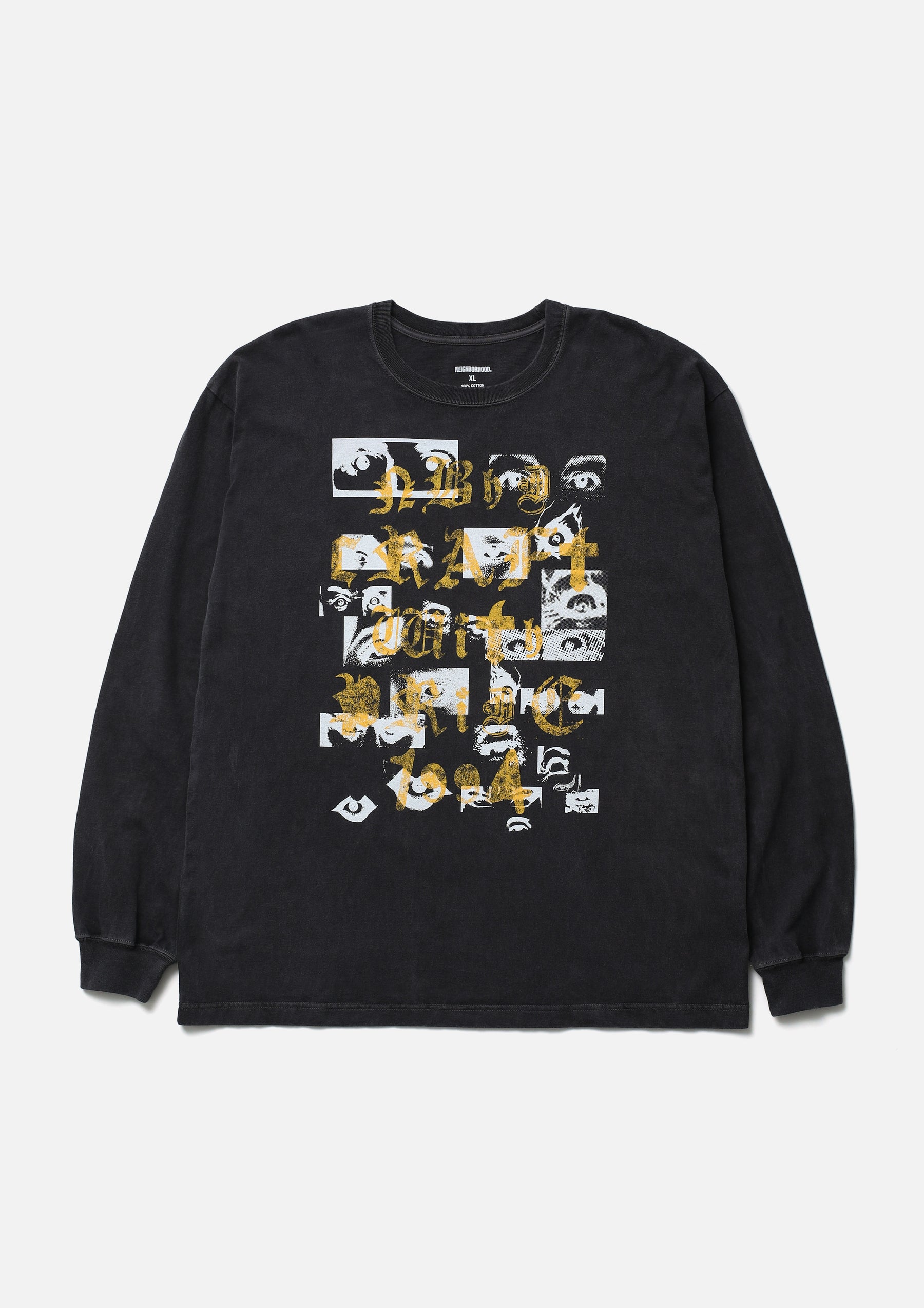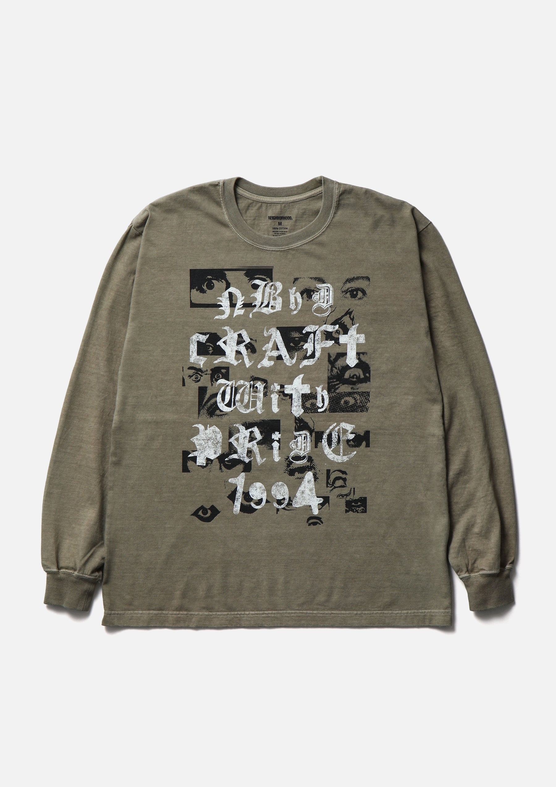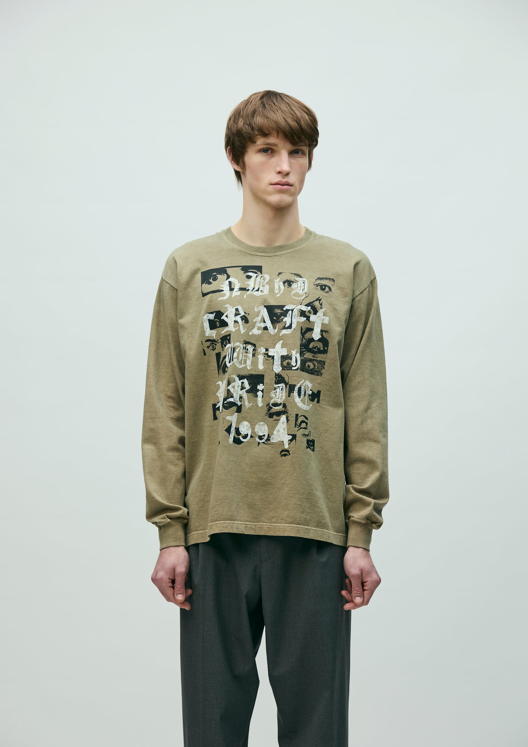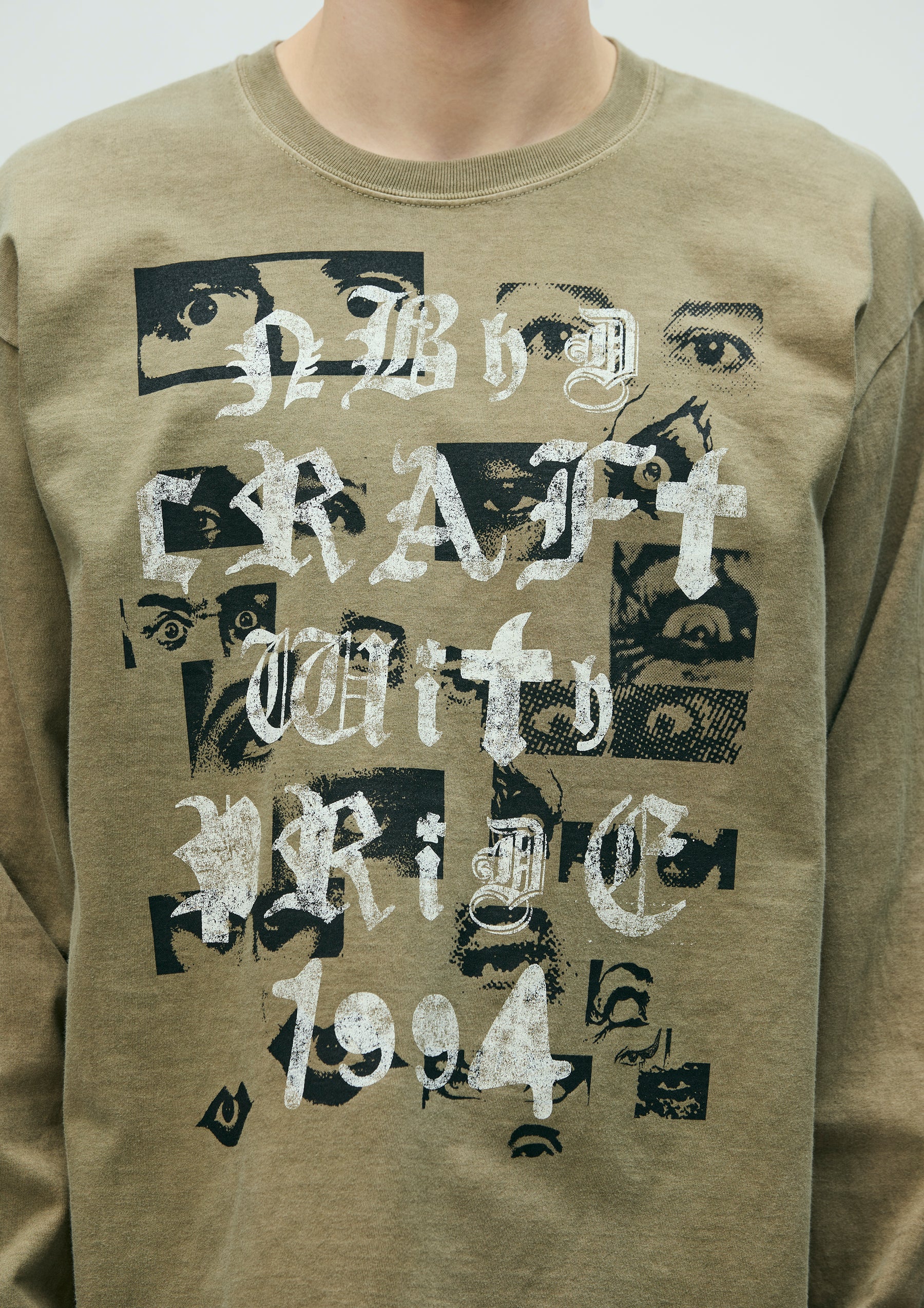 コットン天竺のオリジナルボディをベースに、顔料染め加工を施したロングスリーブTシャツ。正面と背面にグラフィックをプリント。ワンウォッシュ仕上げ。