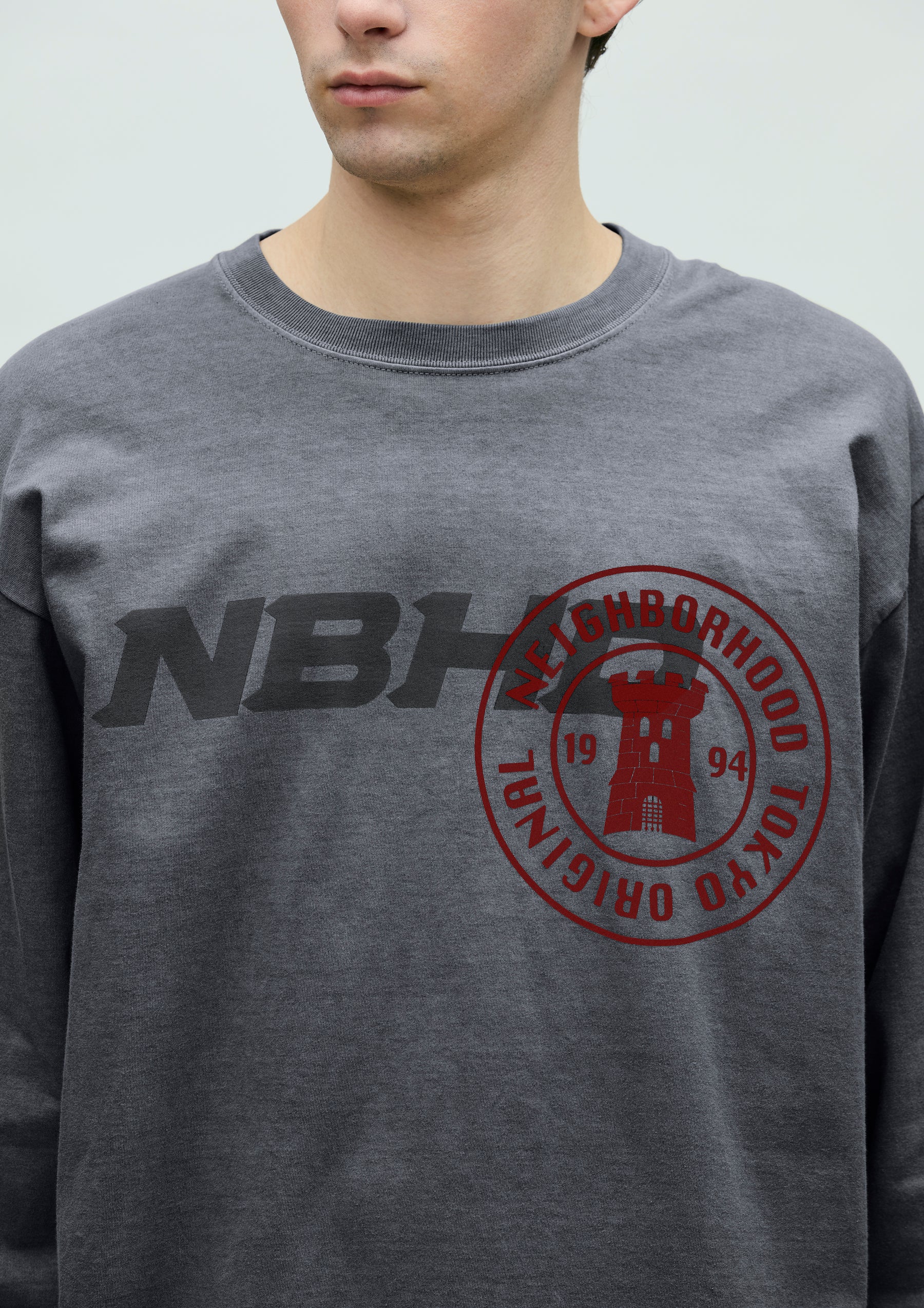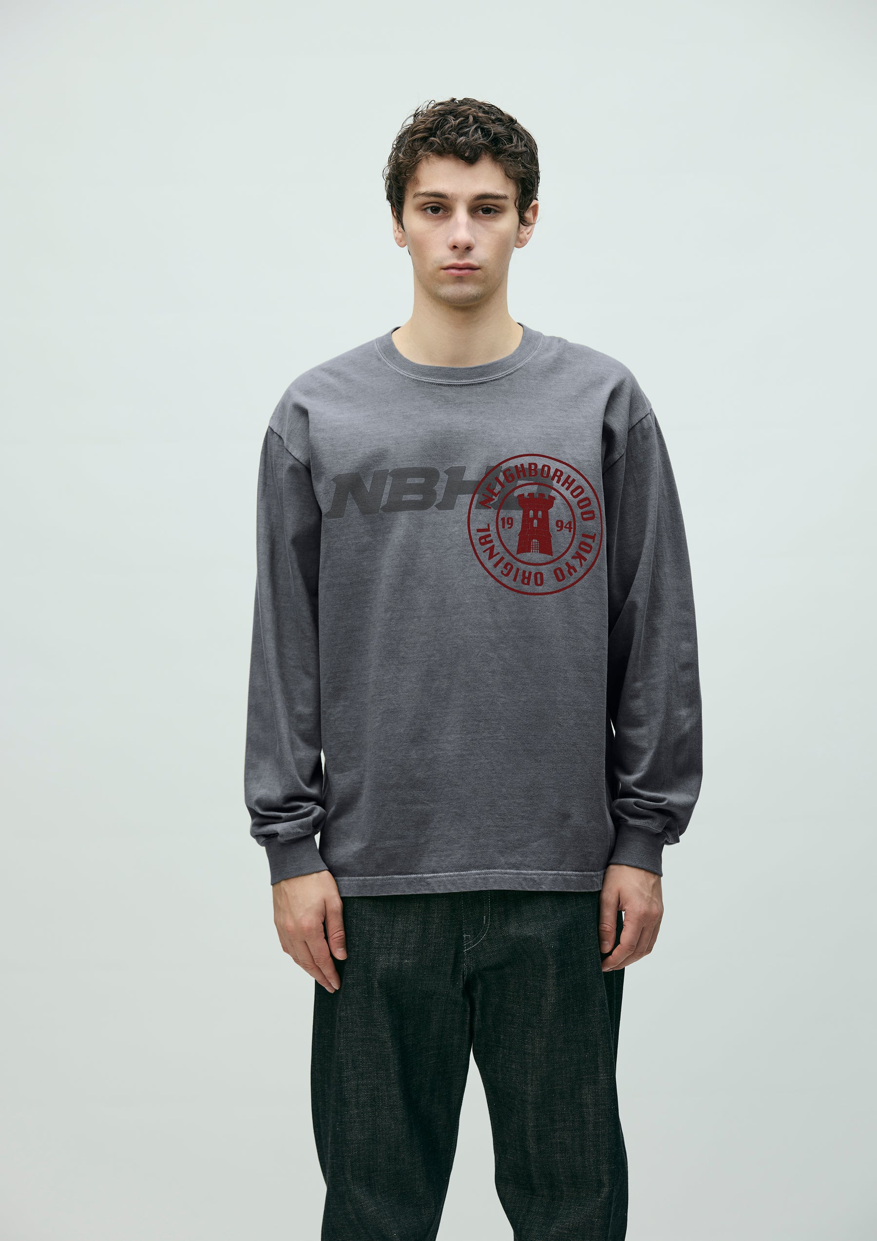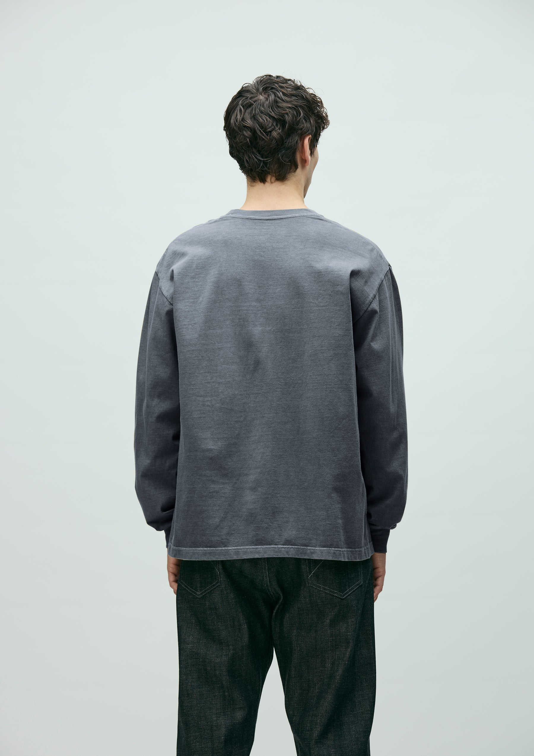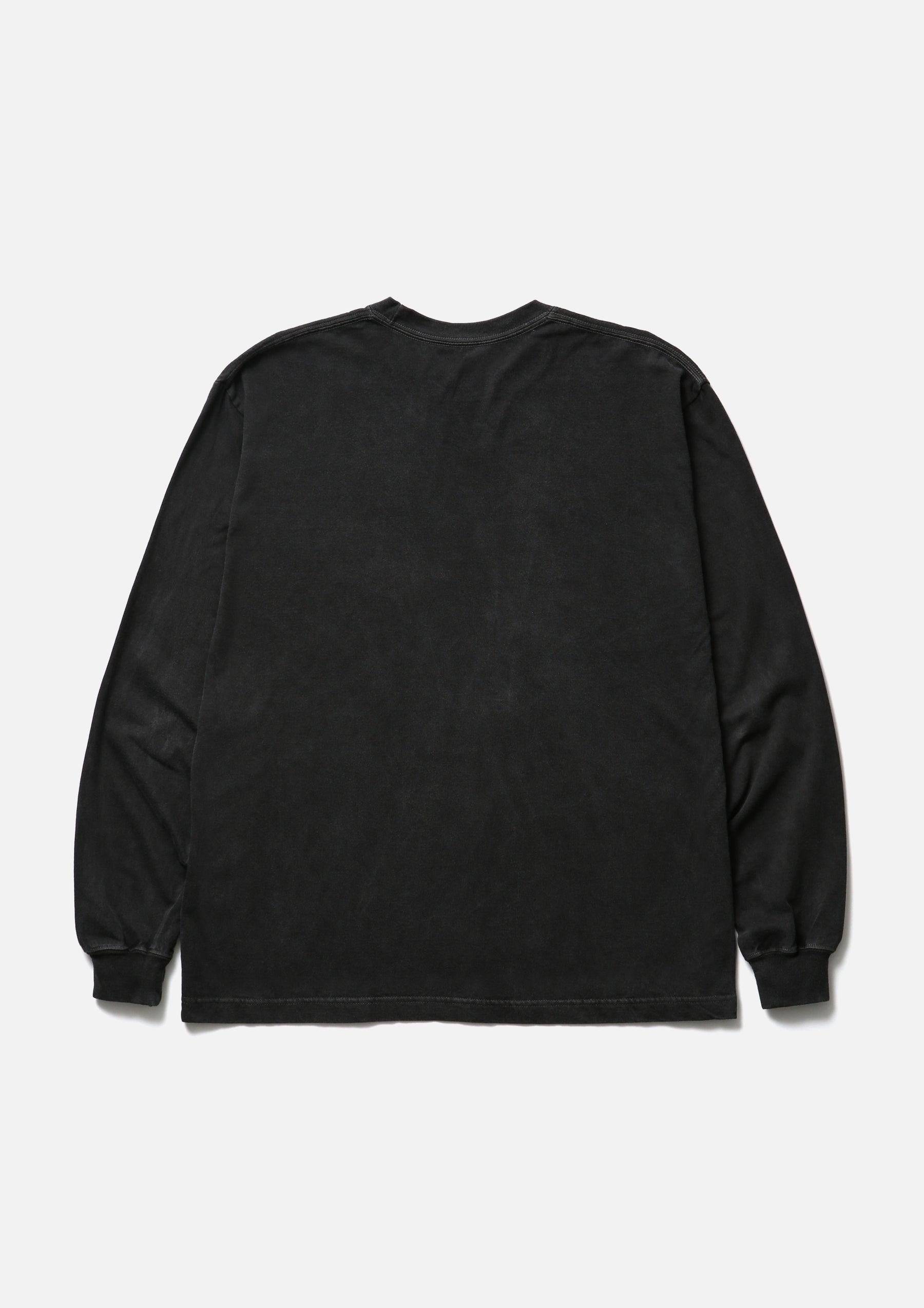コットン天竺のオリジナルボディをベースに、顔料染め加工を施したロングスリーブTシャツ。フロントにグラフィックをプリント。ワンウォッシュ仕上げ。