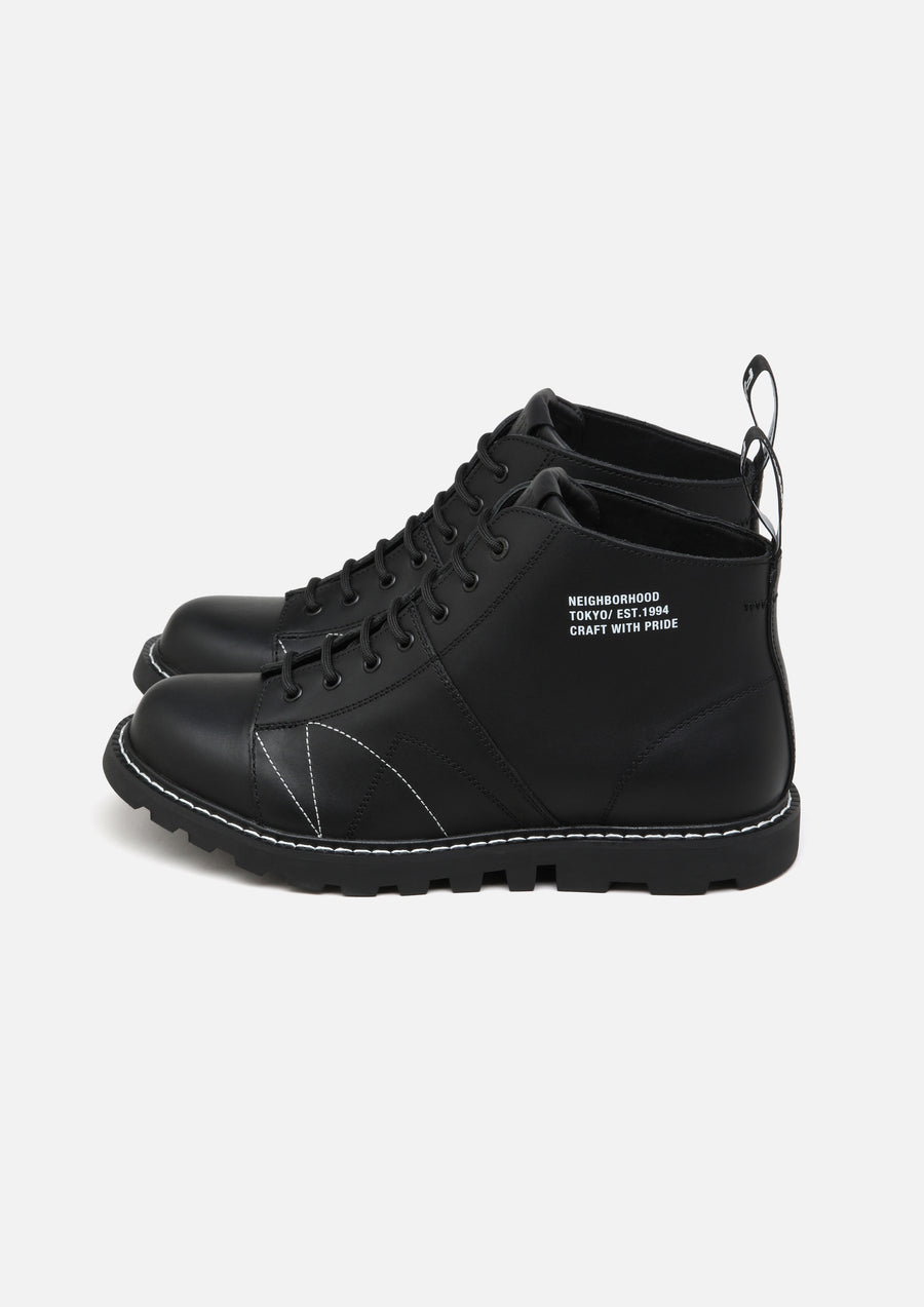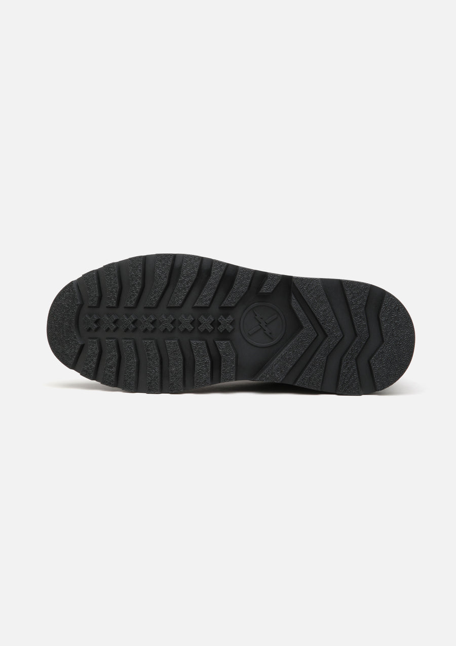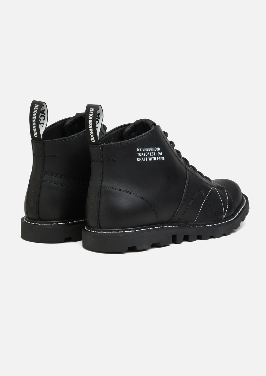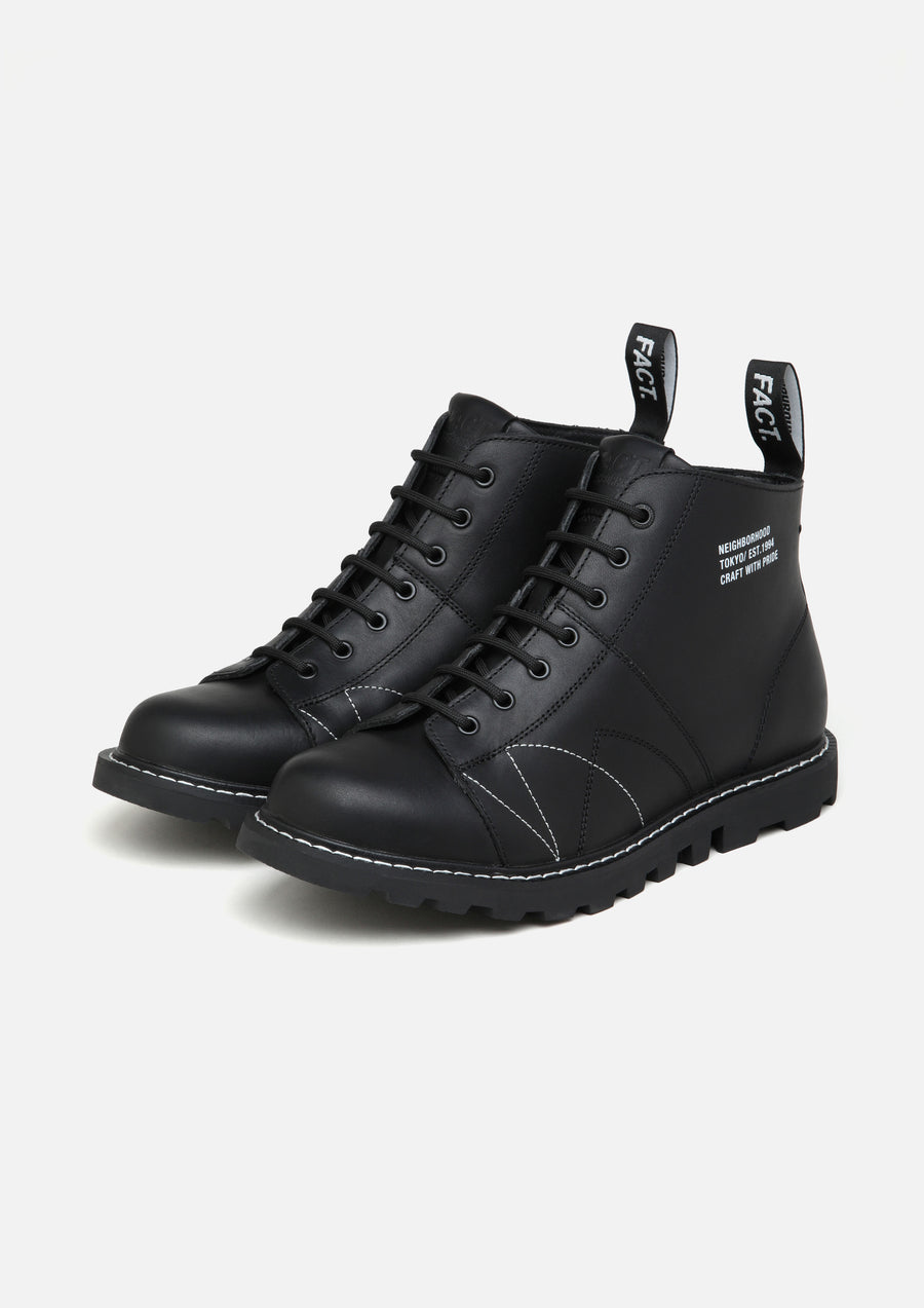 A collaborative item with FACT., a footwear brand rooted in music subculture. The NH x FACT. MNKY is based on the iconic Monkey Boot first crafted in the Eastern Bloc, it was later adopted by Mods, Skins, Punks, and Goths from the 1960s through the 1980s. Merging its utilitarian heritage with a premium redesign, the NH x FACT. MNKY pays tribute to the subversive energy of these generational subcultures. Product highlights include a rectified smooth leather upper, a classic tractor sole design, and branded detailing with refined trim applications.