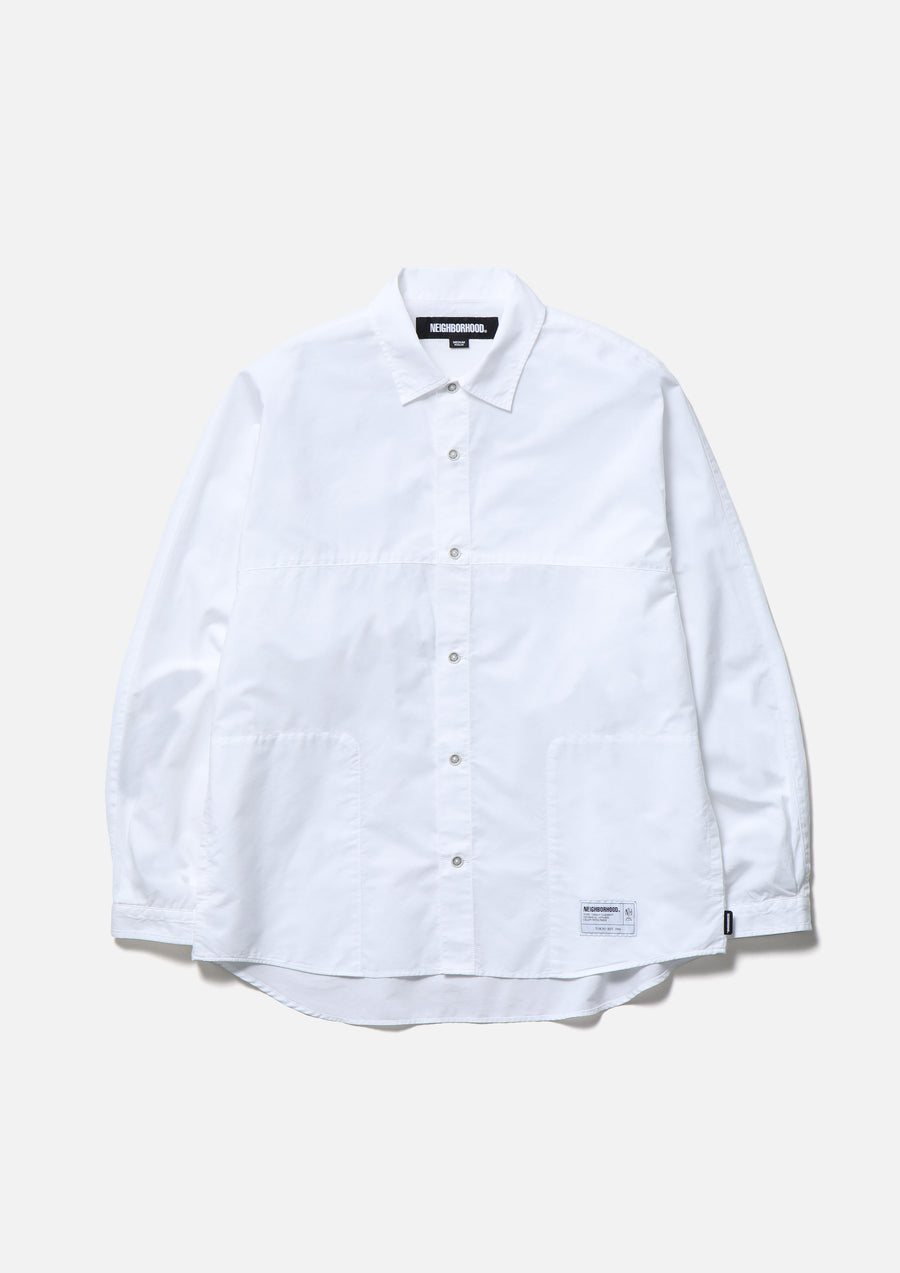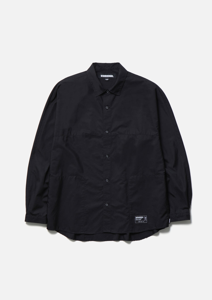 A dolman sleeve shirt featuring a distinctive panel design connecting the sleeves and body. Made from broadcloth fabric using high-quality combed yarn with excellent luster. Equipped with hand pockets utilizing side details. A graphic print is featured on the back. Includes original four-hole buttons, a brand tag on the left hem and on the side seam. One-wash finish.