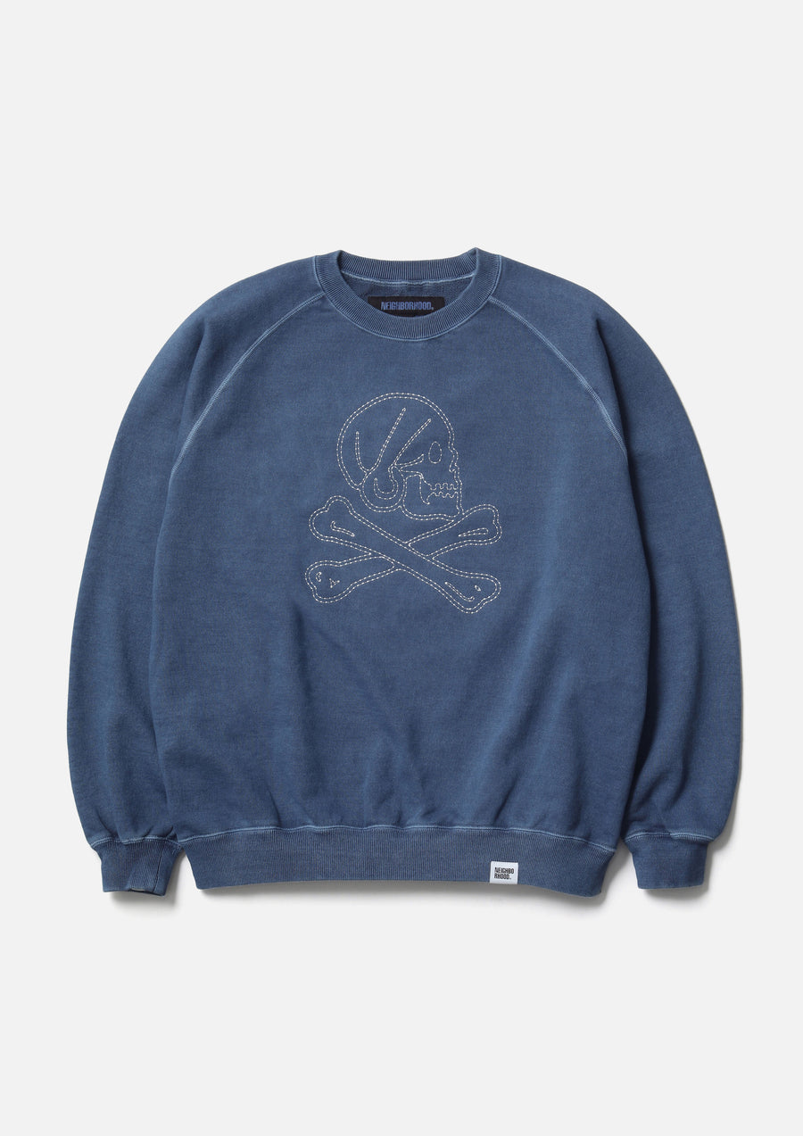 A crewneck pullover made from loopback fabric, pigment-dyed in its finished state. Designed with raglan sleeves, it features bonded stitch embroidery of a skull motif on the front. A brand tag is attached to the side seam.