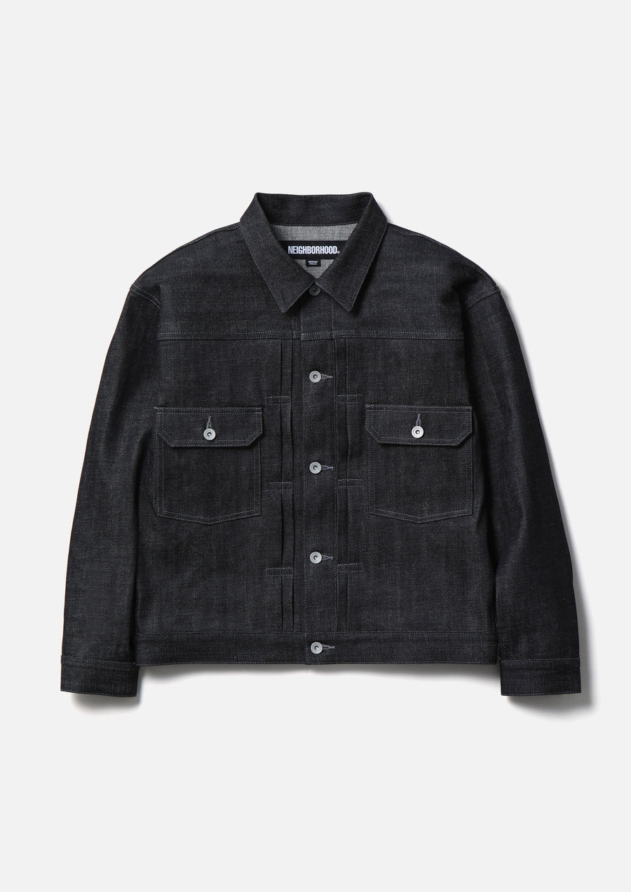 A 2nd-type rigid denim jacket made from original 12oz denim fabric. The front design features pleats, symmetrical flap pockets, and an adjustable buttoned hem belt, maintaining classic details. The stitching is done in a contrasting color, and original tack buttons and rivets are used. A brand tag is attached to the side seam.