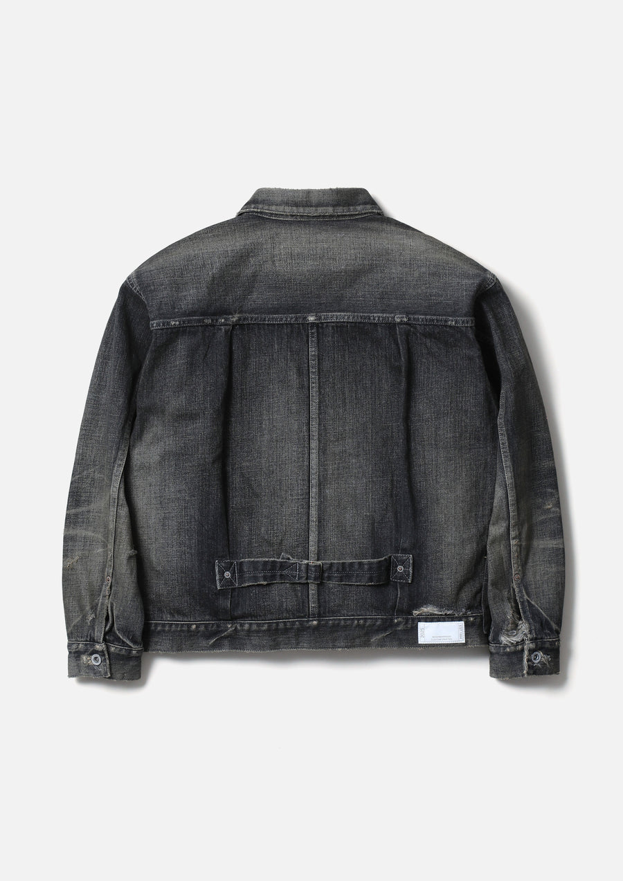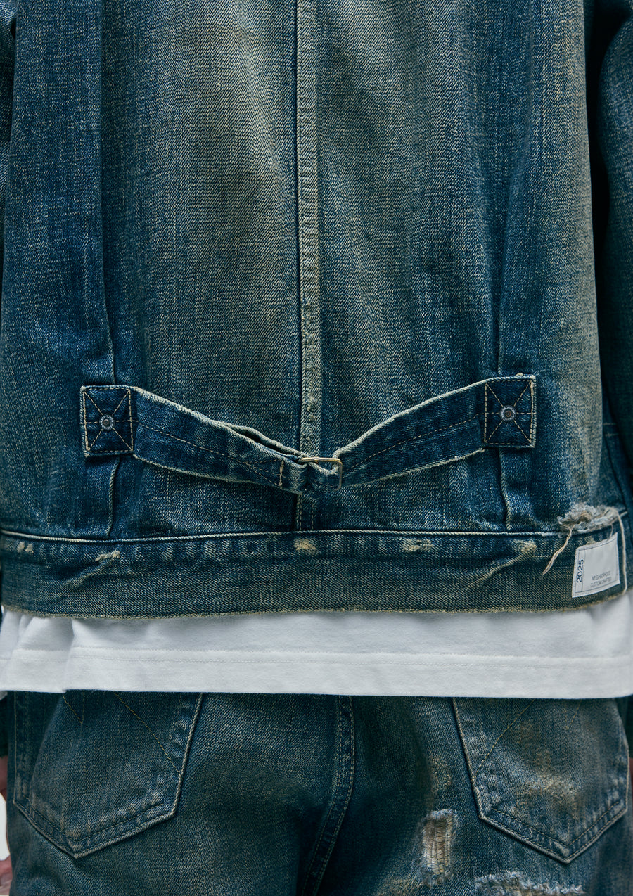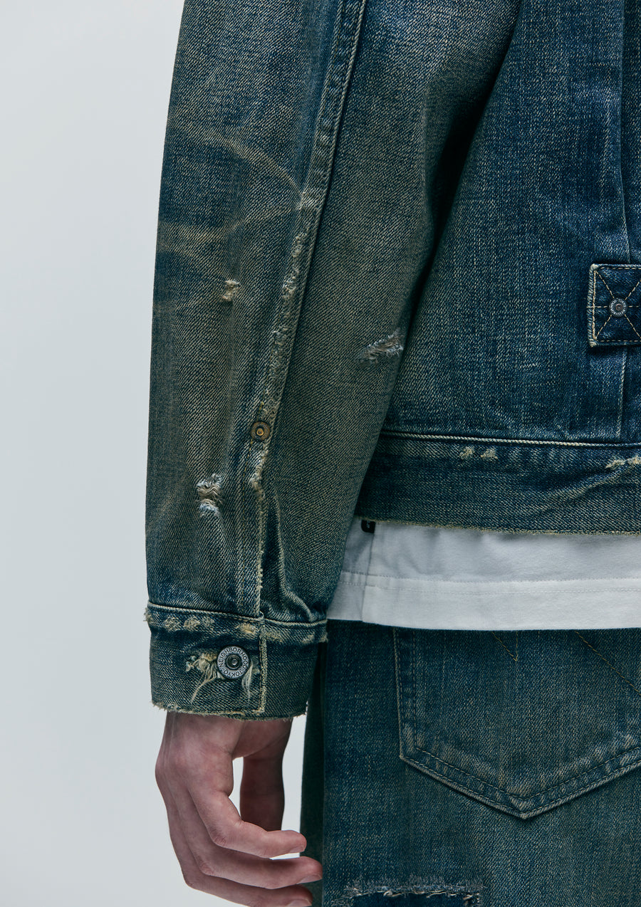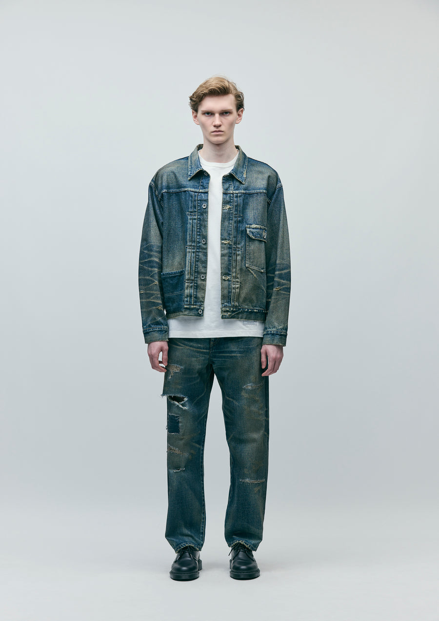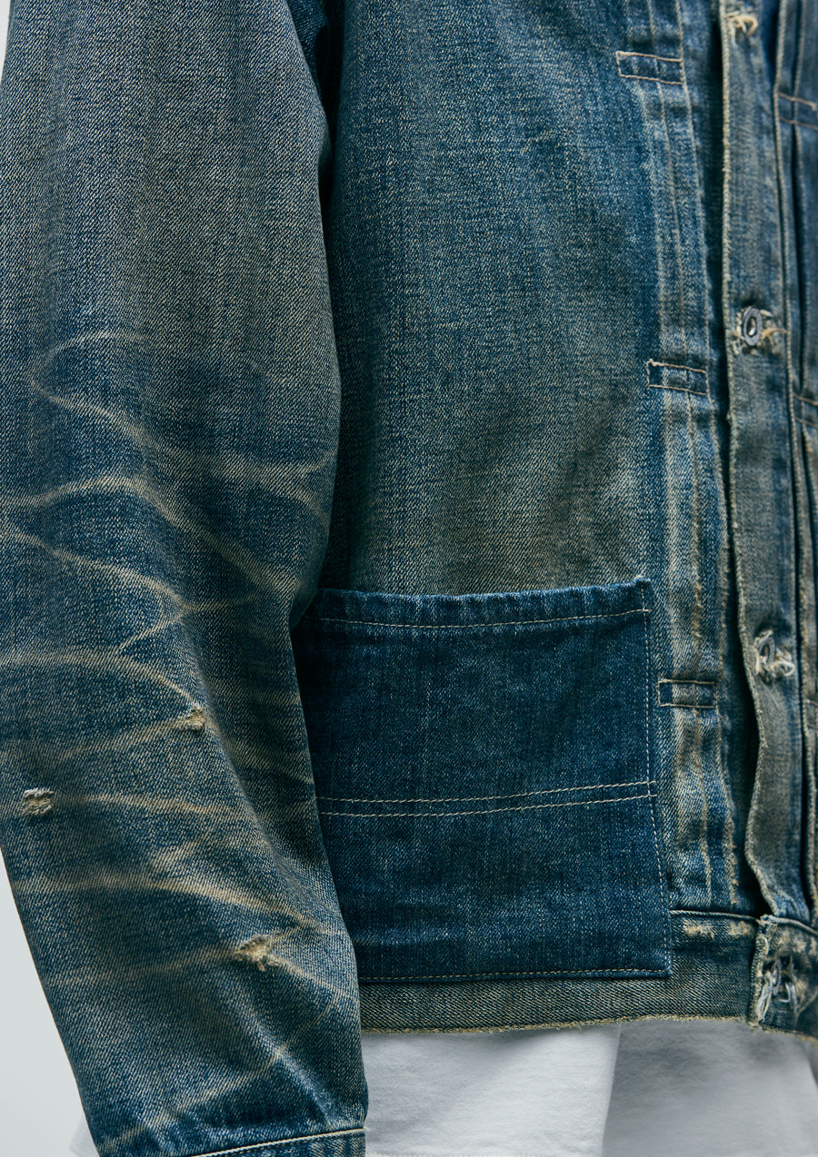 A 1st-type denim jacket made from original 12oz denim fabric with savage processing. The aging effect is achieved through distress processing, remake details, and intense fading, expressing a naturally worn-in look. Contrast stitching, original tack buttons, and rivets. Brand tag on the side seam and a dedicated size label for custom-crafted items.