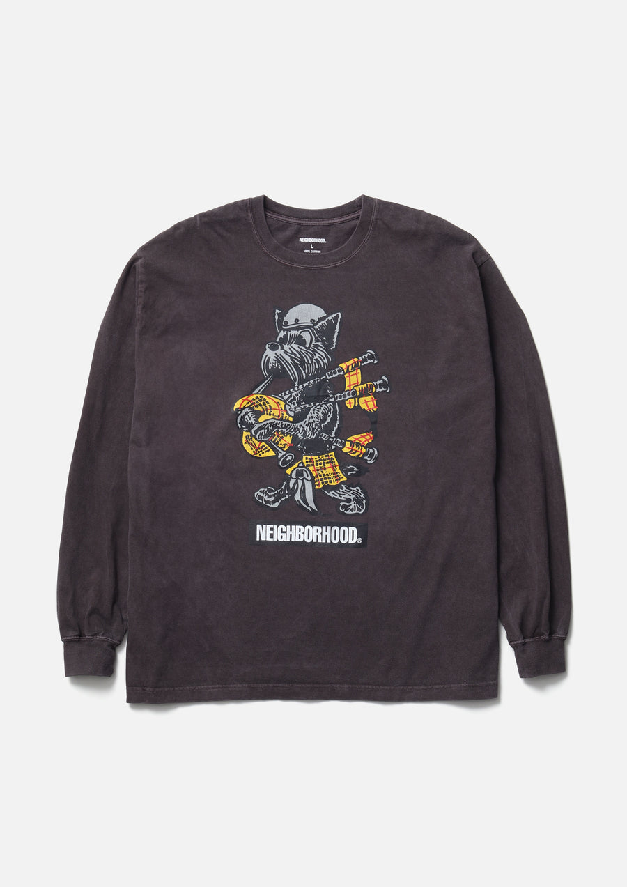 A long-sleeve T-shirt made of an original cotton jersey body, pigment-dyed for a unique finish. Crack print graphic on the front. One-wash finish.