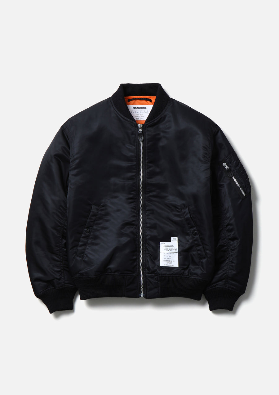 An MA-1 flight jacket made from nylon twill fabric, balancing softness and toughness. The right sleeve and back feature a pub towel and print patch, while the left sleeve has a cigarette pocket. Equipped with original leather zipper pulls and snap buttons. Brand tag on the side seam. The lining is rescue-orange with padding.