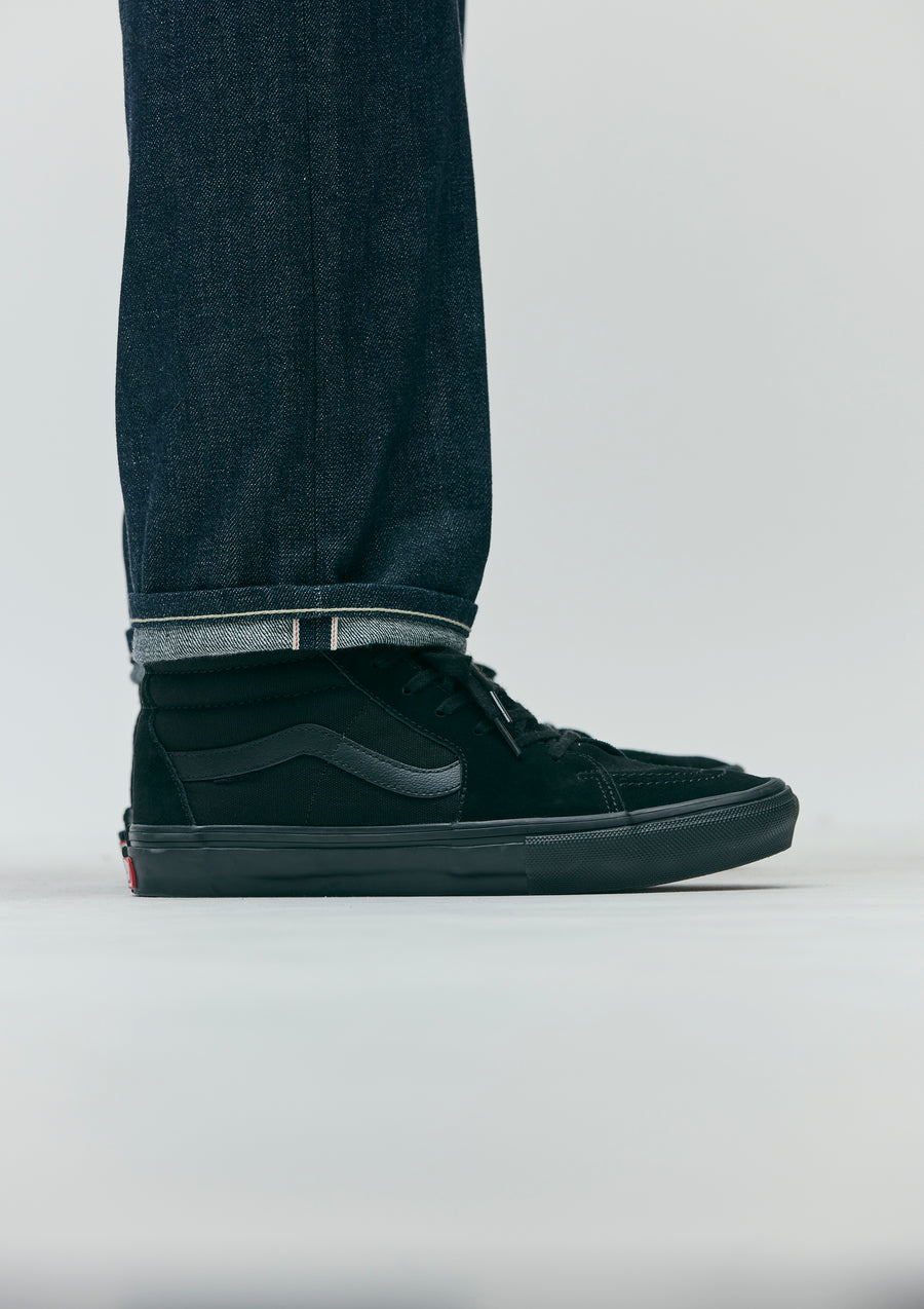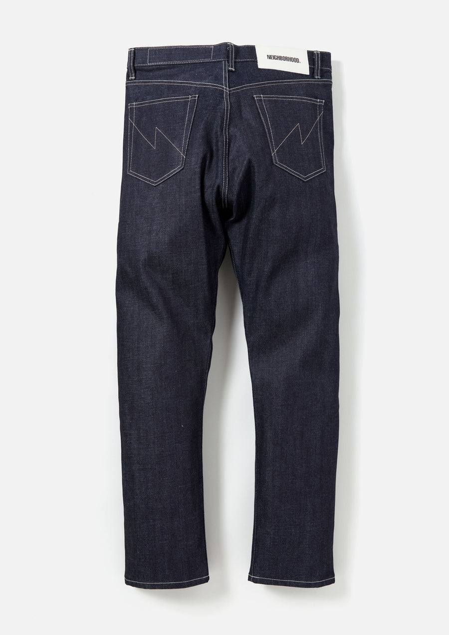 12 oz. denim pants made entirely from our original selvedge denim fabric, buttons, rivets, and other parts. Details such as signature tape on the front zipper fly, "N" stitching on the hip pockets, and leather patches. Slim tapered silhouette with room around the waist.