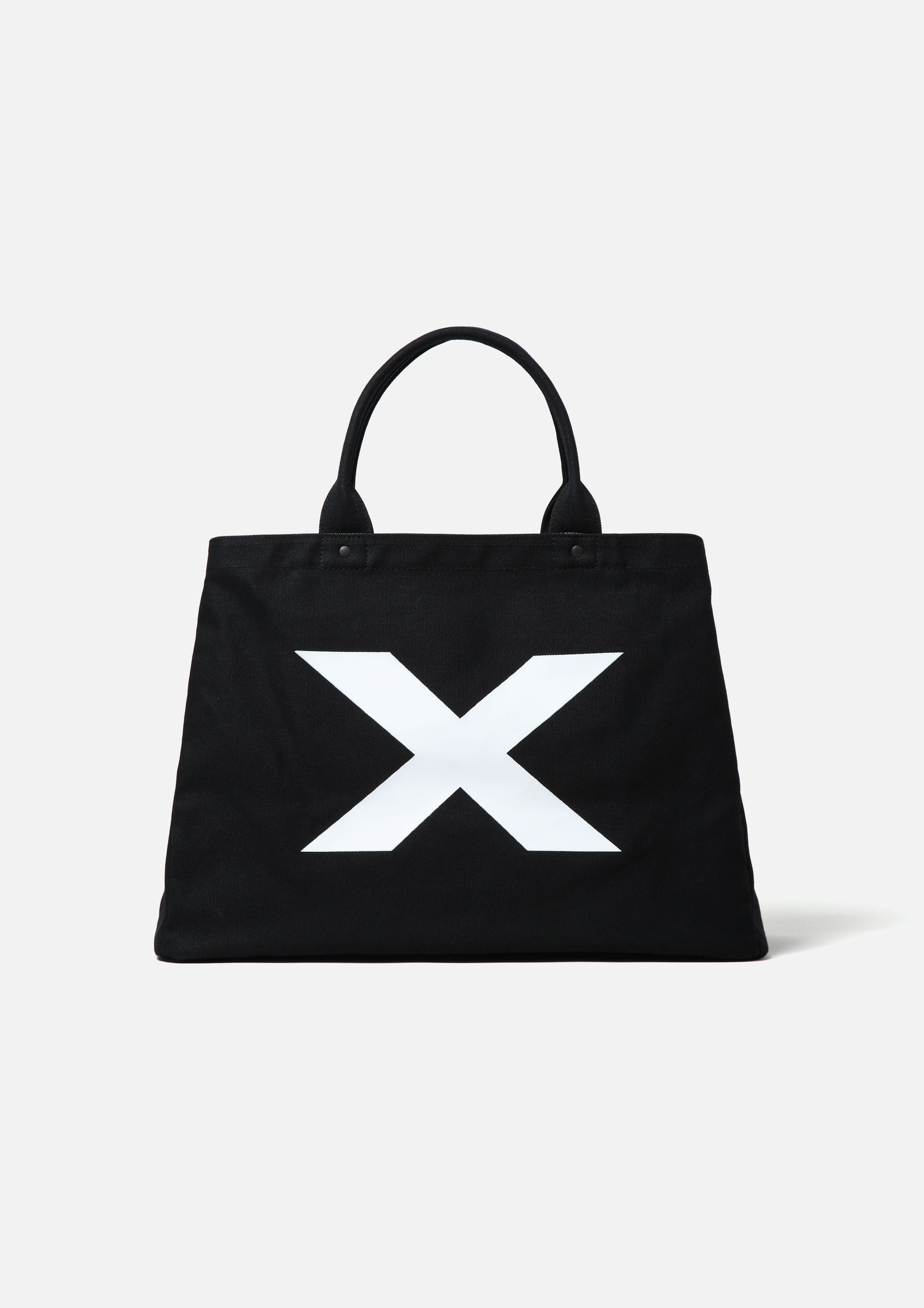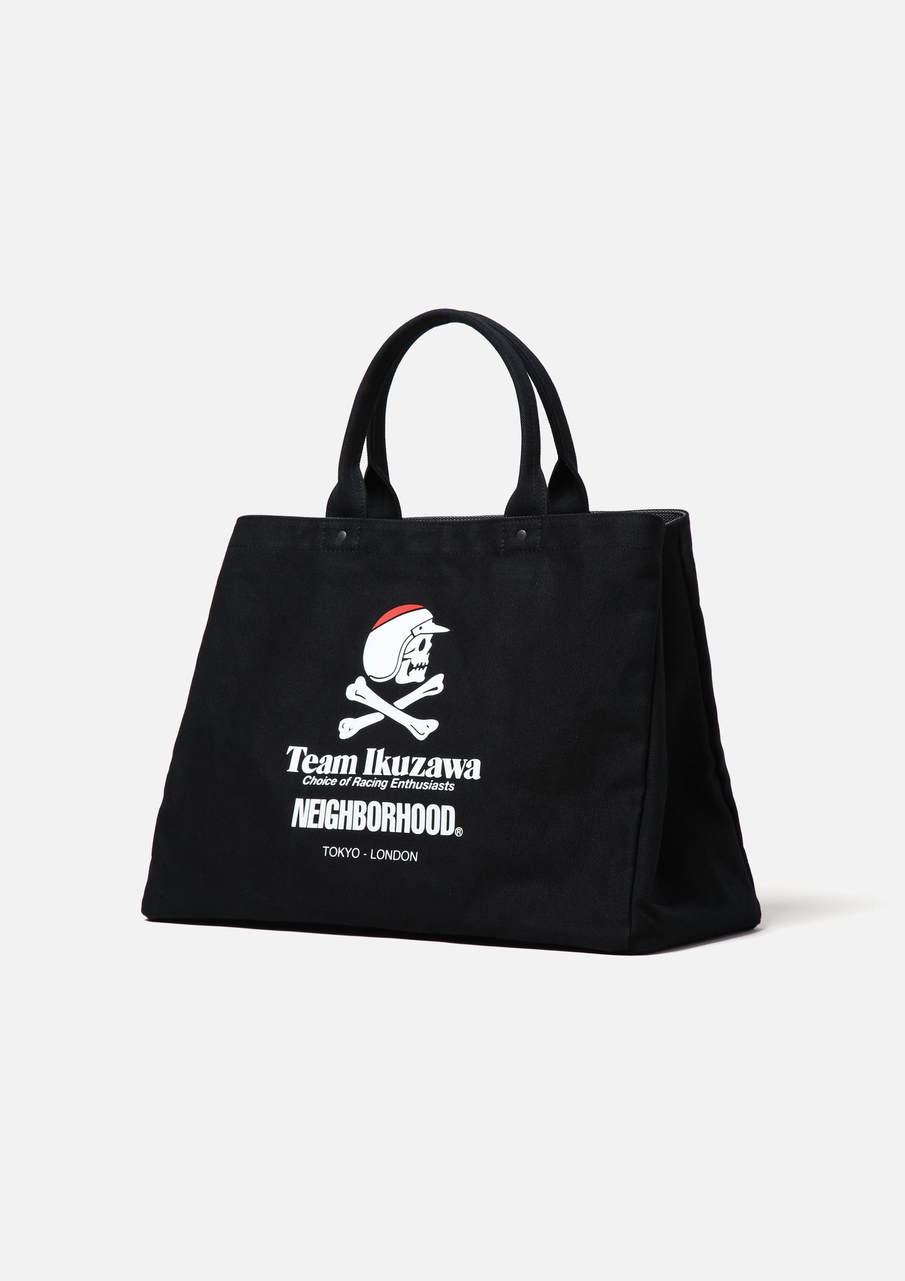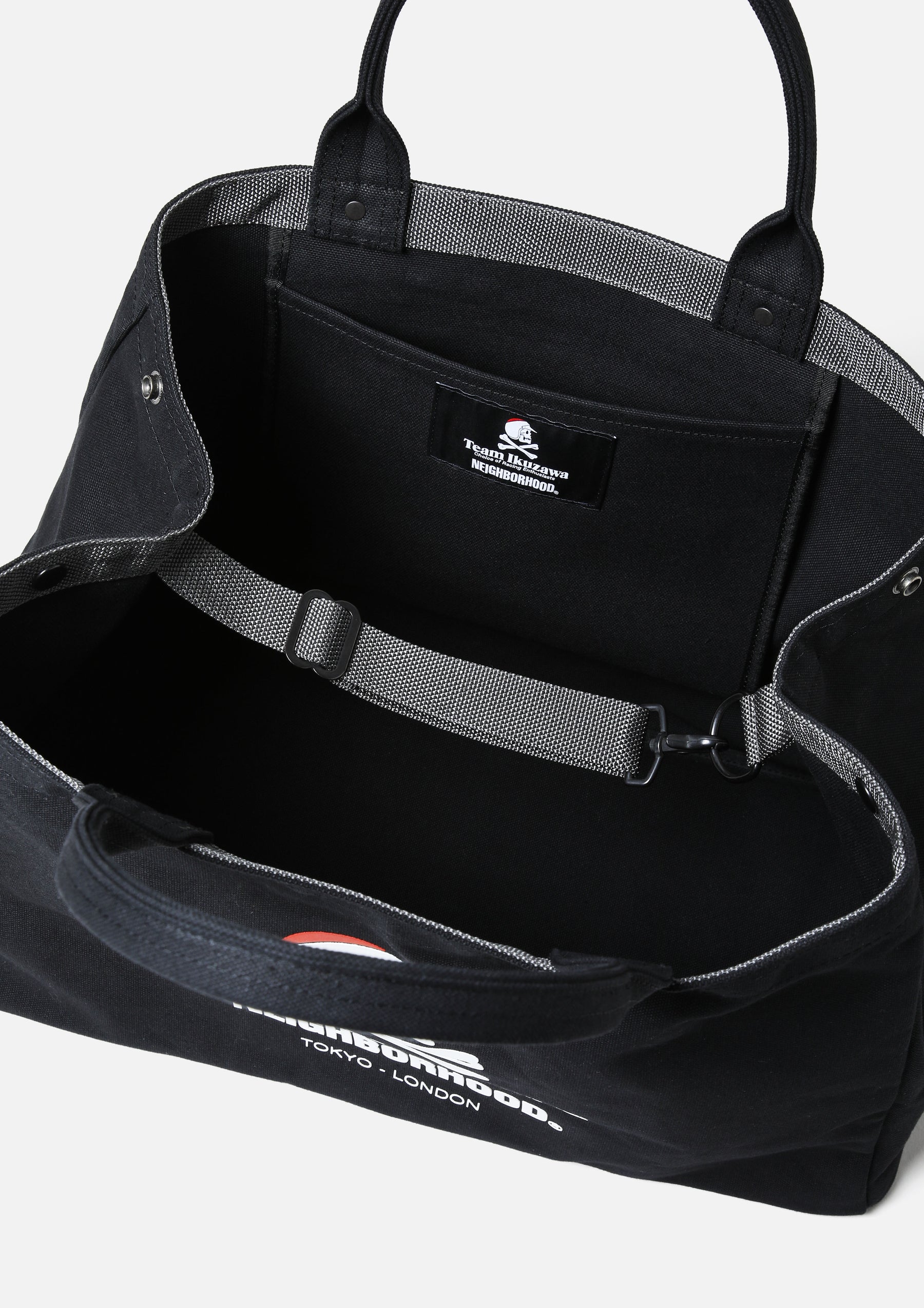 Trunk bag made from durable cotton canvas. A collaborative model based on the Team Ikuzawa original designed by Creative Director Ramdane Touhami, featuring black canvas fabric with matte black rivets and snap buttons. Equipped with an interior pocket and latch belt. Side snap buttons allow the opening to be narrowed for riders. Features high-density printed logos and graphics on both sides.