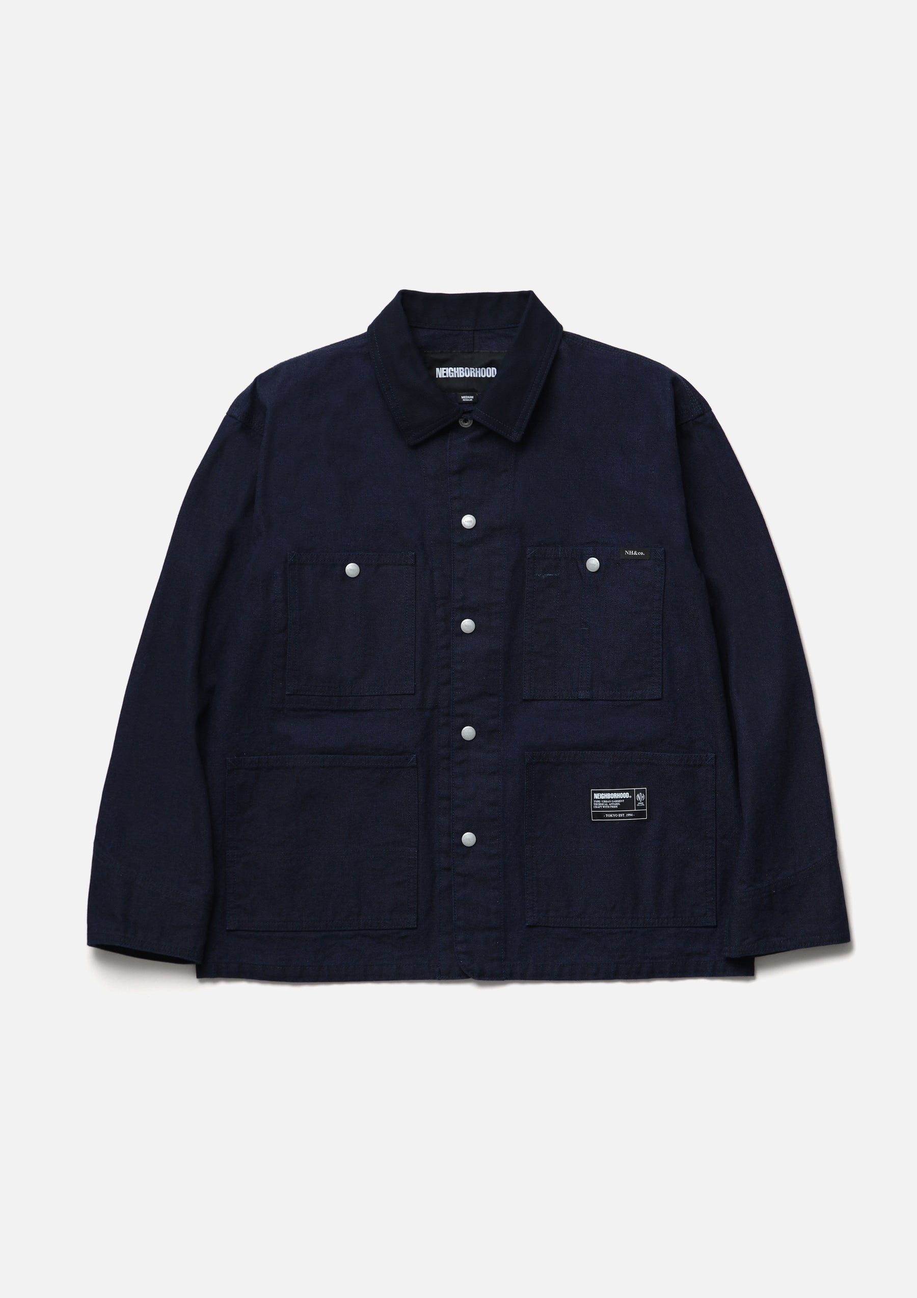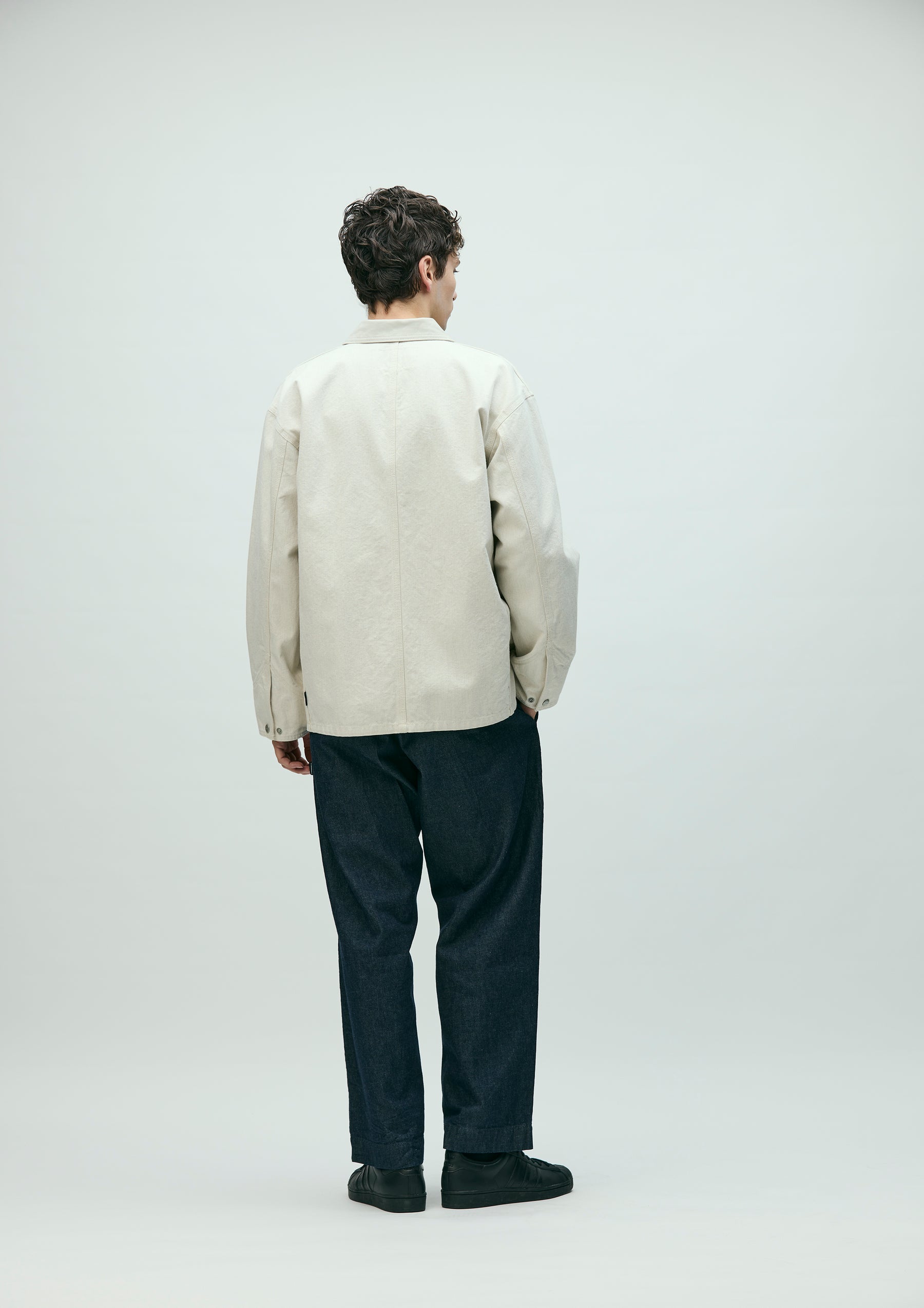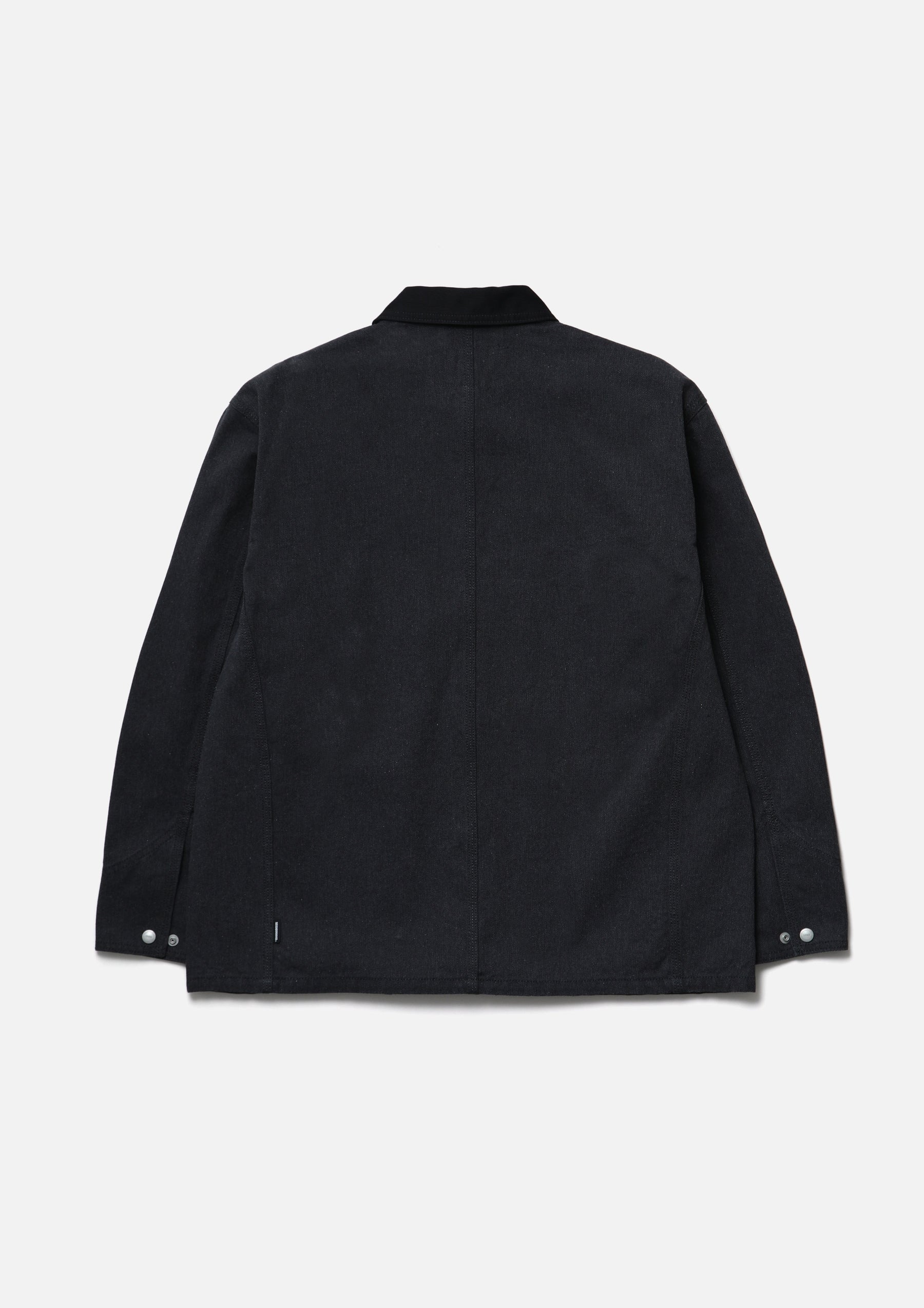 Coverall constructed from an oxford fabric body paired with a cotton piqué collar. Classic details include a pen slot and watch pocket at the chest, as well as triple-stitched flat-felled seams. Features original snap buttons, with a top metal button. A brand tag is attached to the pocket, and a woven side label is placed at the side seam. Finished with a one-wash process.