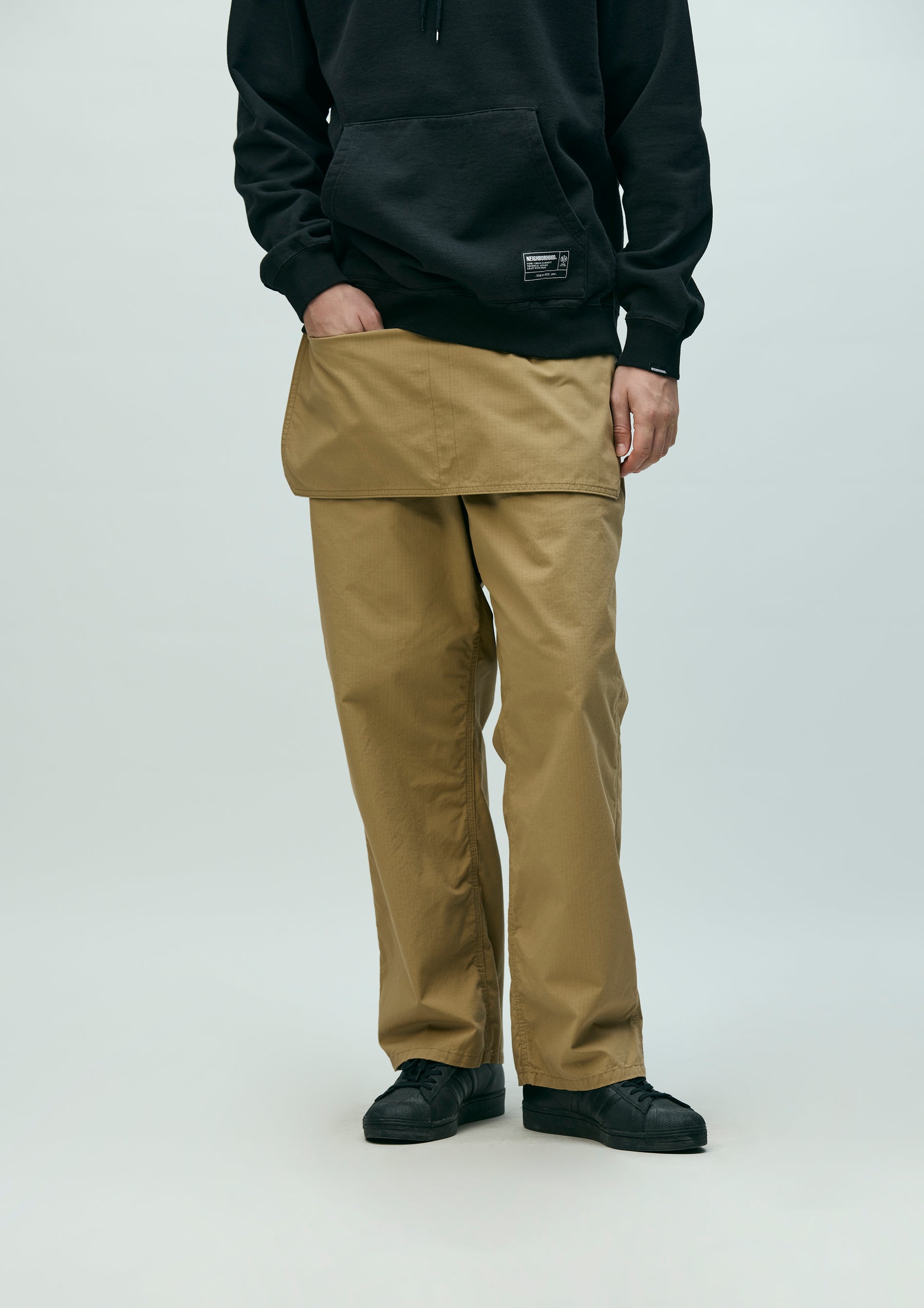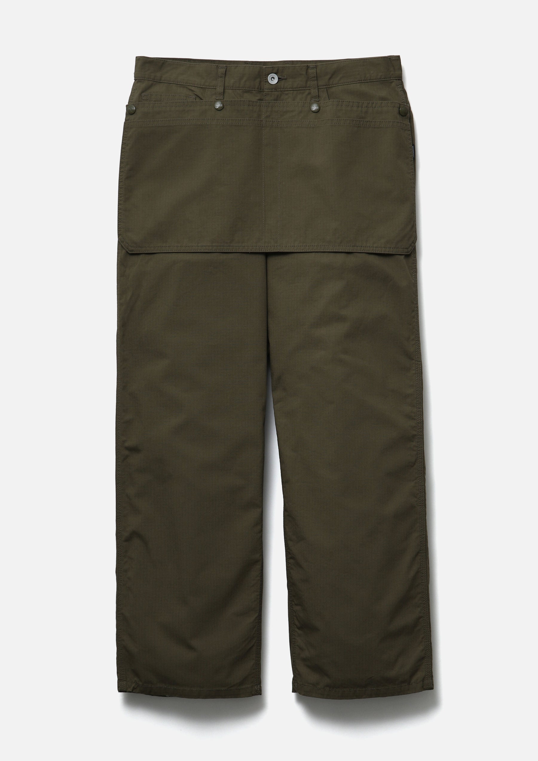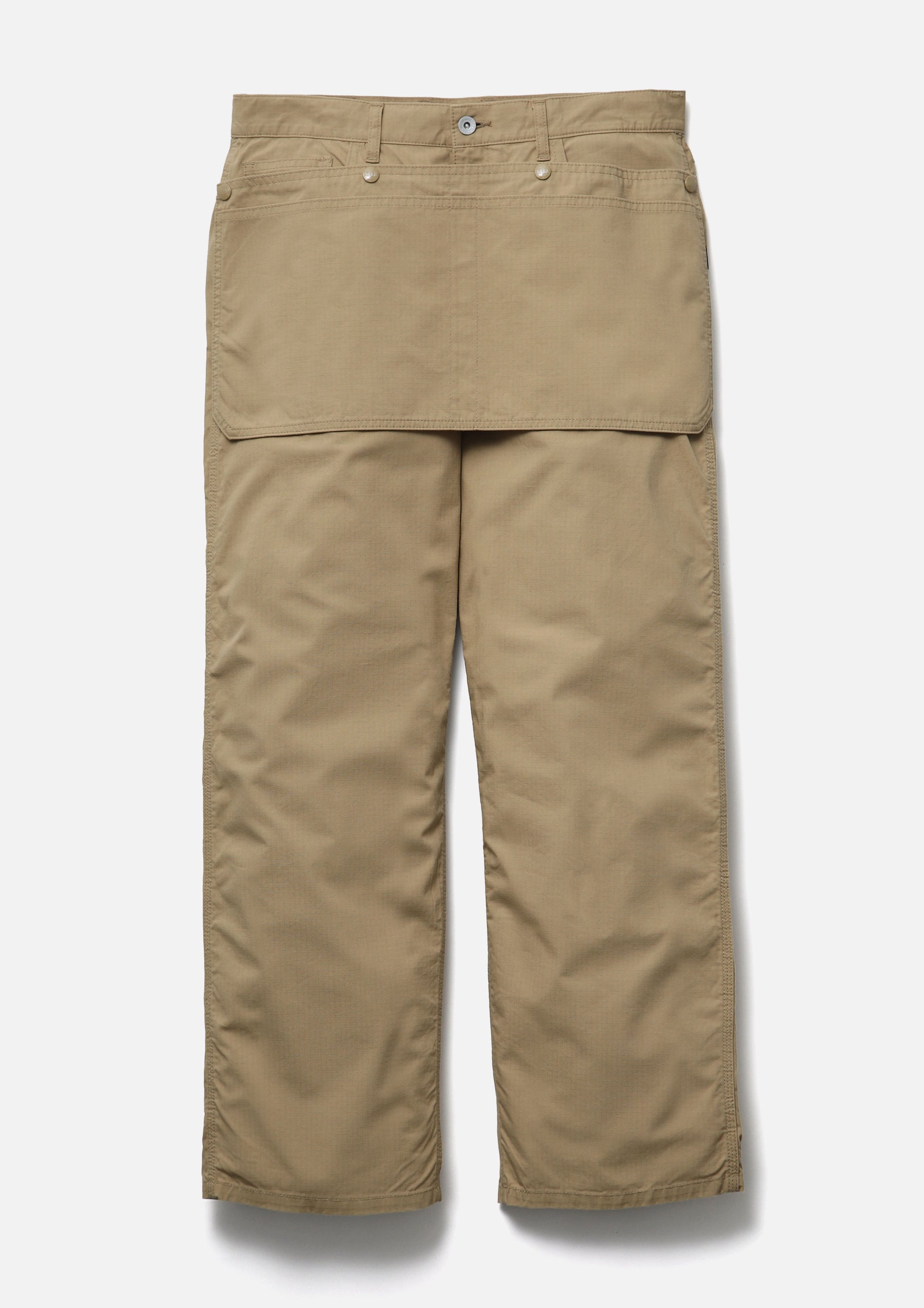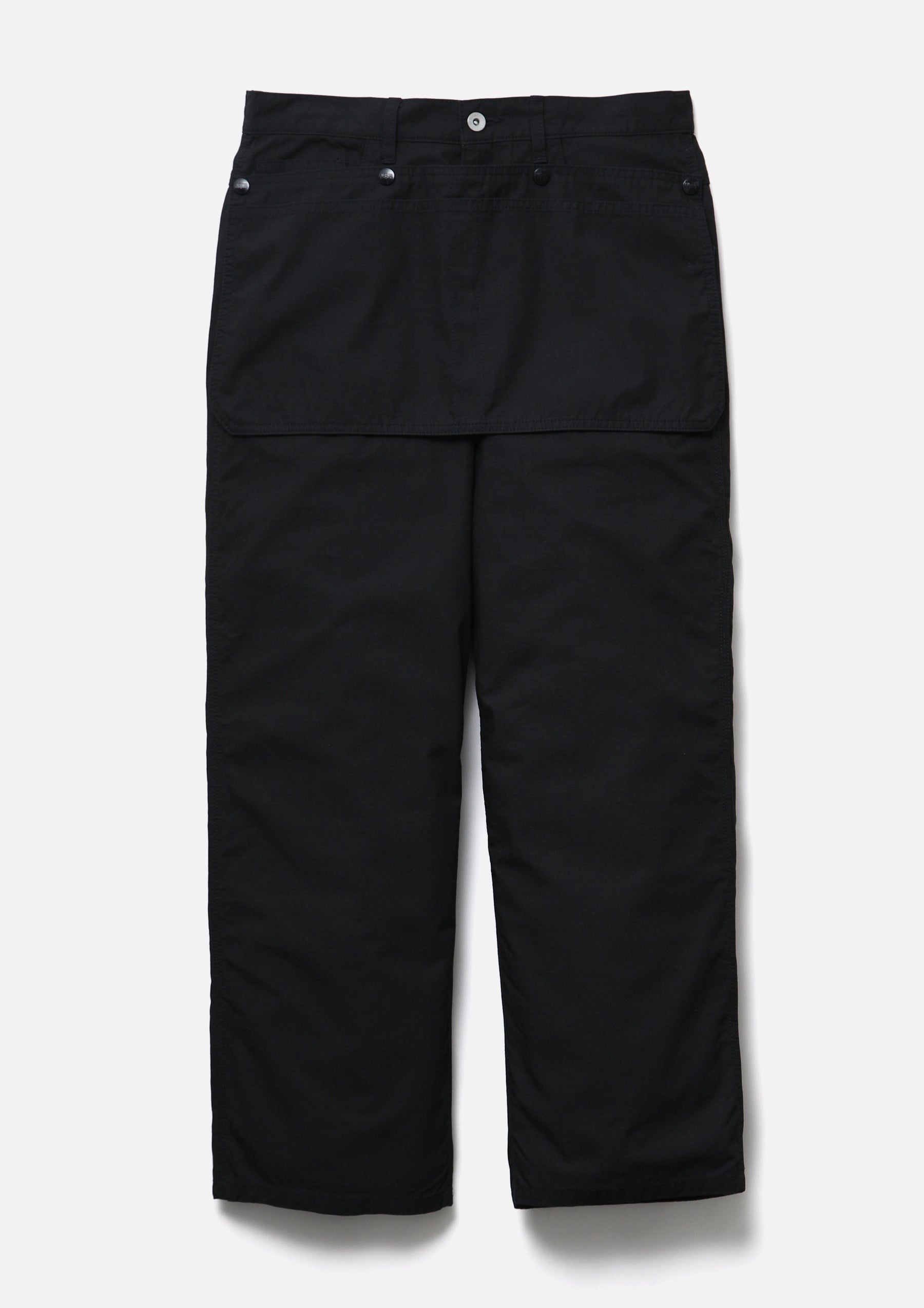 Apron Utility Pants made from medium-weight ripstop fabric partially blended with modacrylic fibers for flame-resistant properties. Characterized by a crisp yet natural, smooth texture. Designed with N-stitched back pockets and a detachable apron detail. Finished with original tack buttons, snap buttons, zipper pulls, and a paper patch. A woven side label is attached at the side seam. Cut in a relaxed straight silhouette and completed with a one-wash finish.
