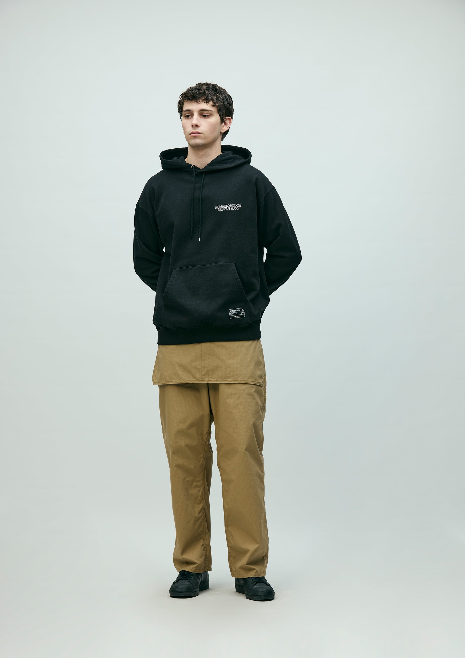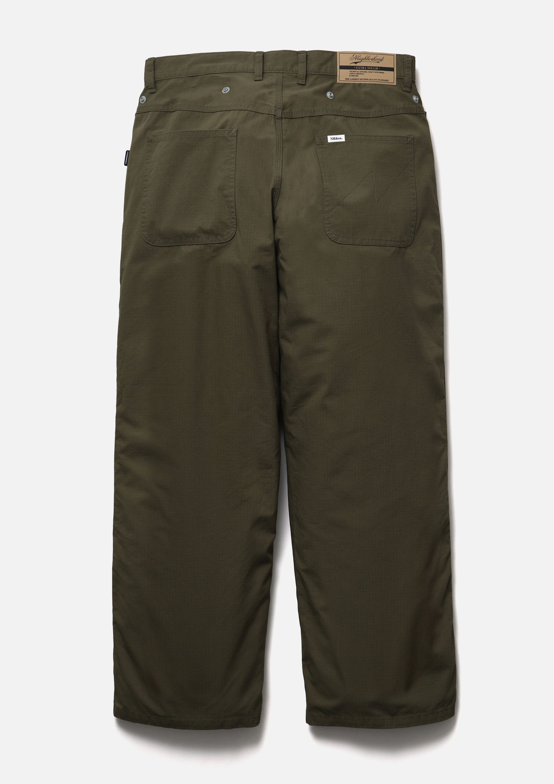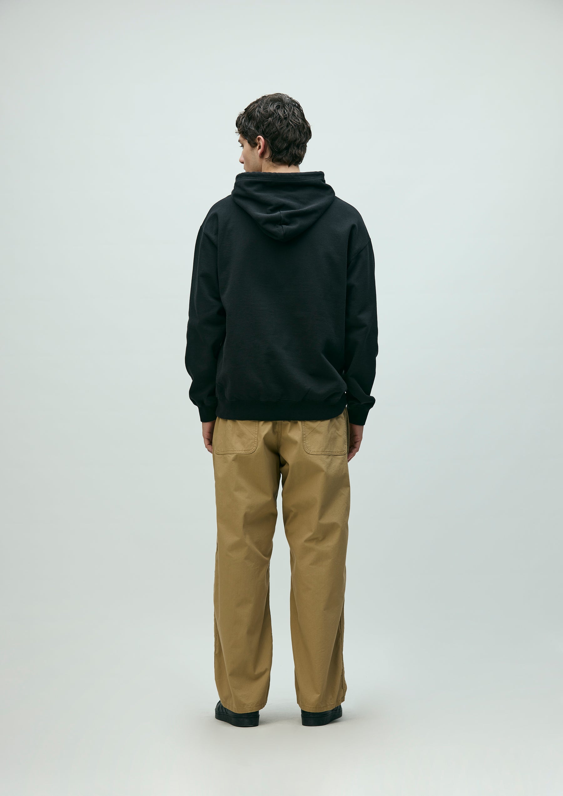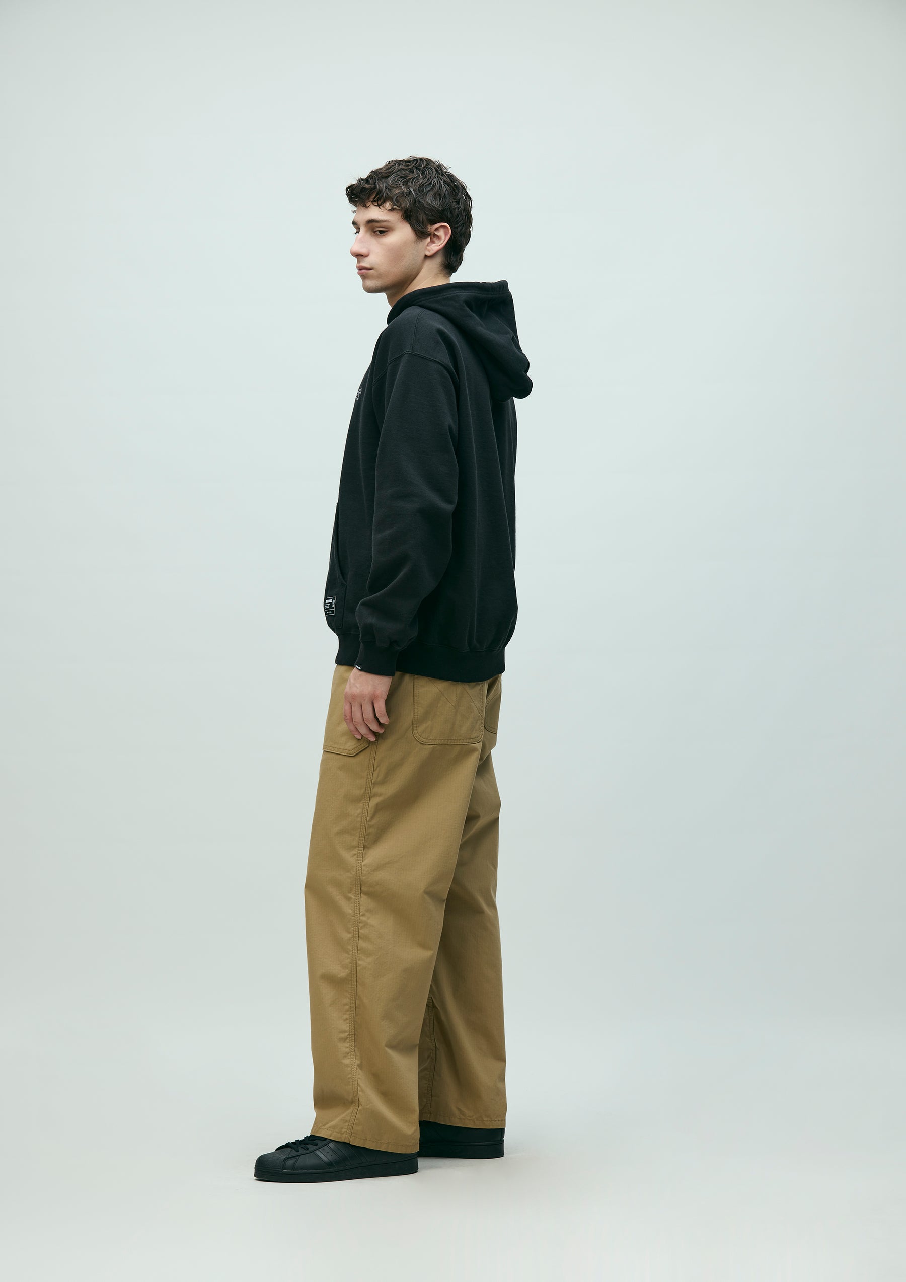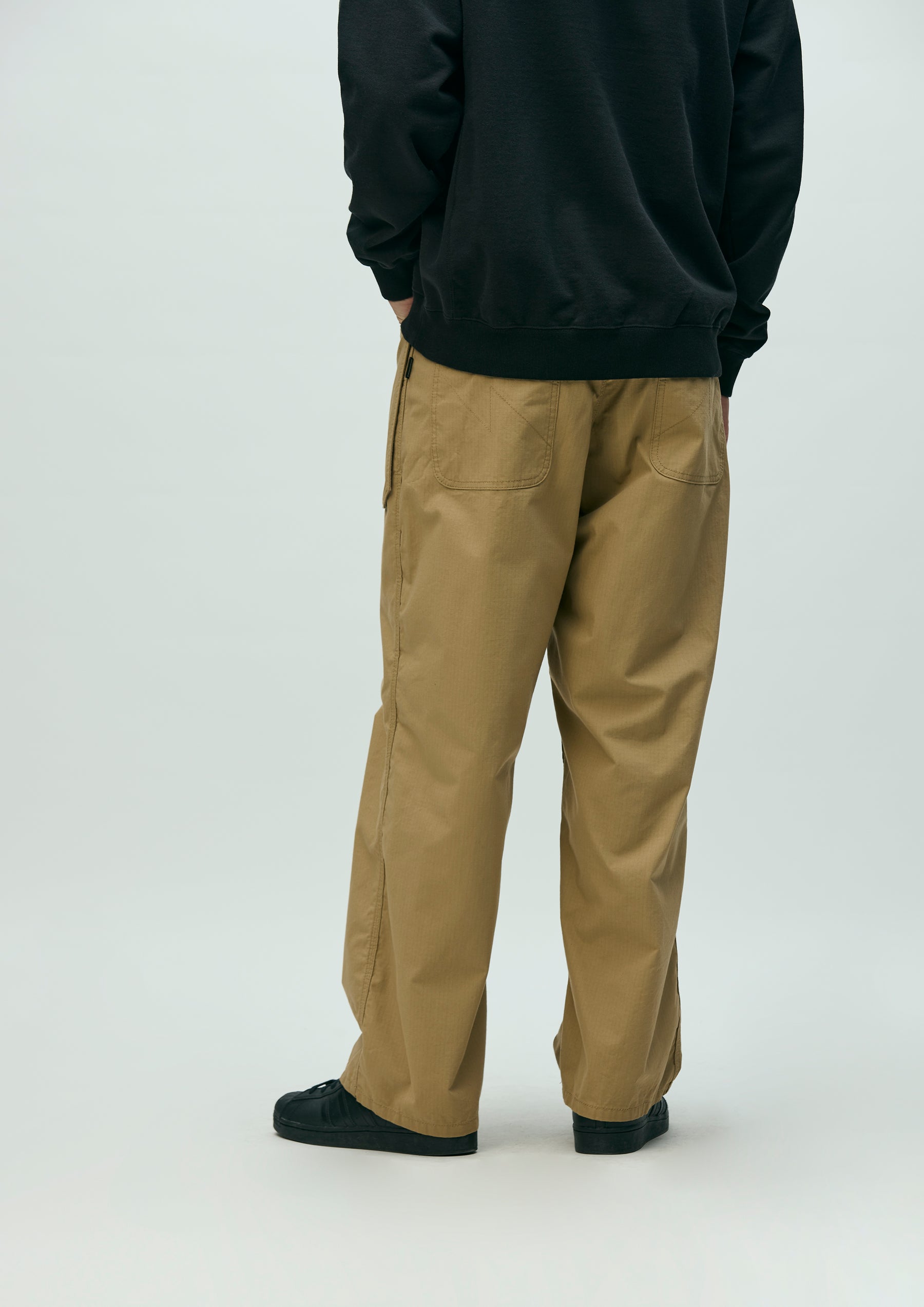 Apron Utility Pants made from medium-weight ripstop fabric partially blended with modacrylic fibers for flame-resistant properties. Characterized by a crisp yet natural, smooth texture. Designed with N-stitched back pockets and a detachable apron detail. Finished with original tack buttons, snap buttons, zipper pulls, and a paper patch. A woven side label is attached at the side seam. Cut in a relaxed straight silhouette and completed with a one-wash finish.