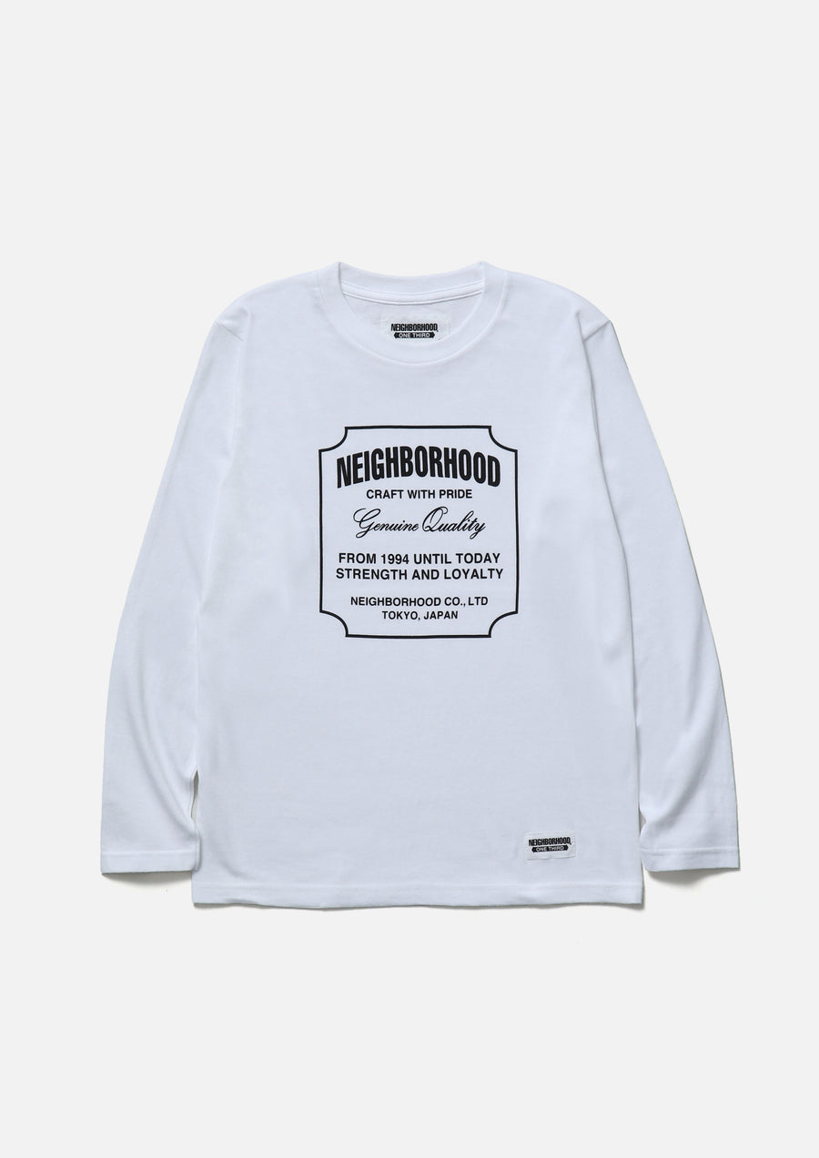 A long-sleeve T-shirt made of a 5.6oz heavyweight body. Graphic print on the front. A name tag is placed on the left hem.